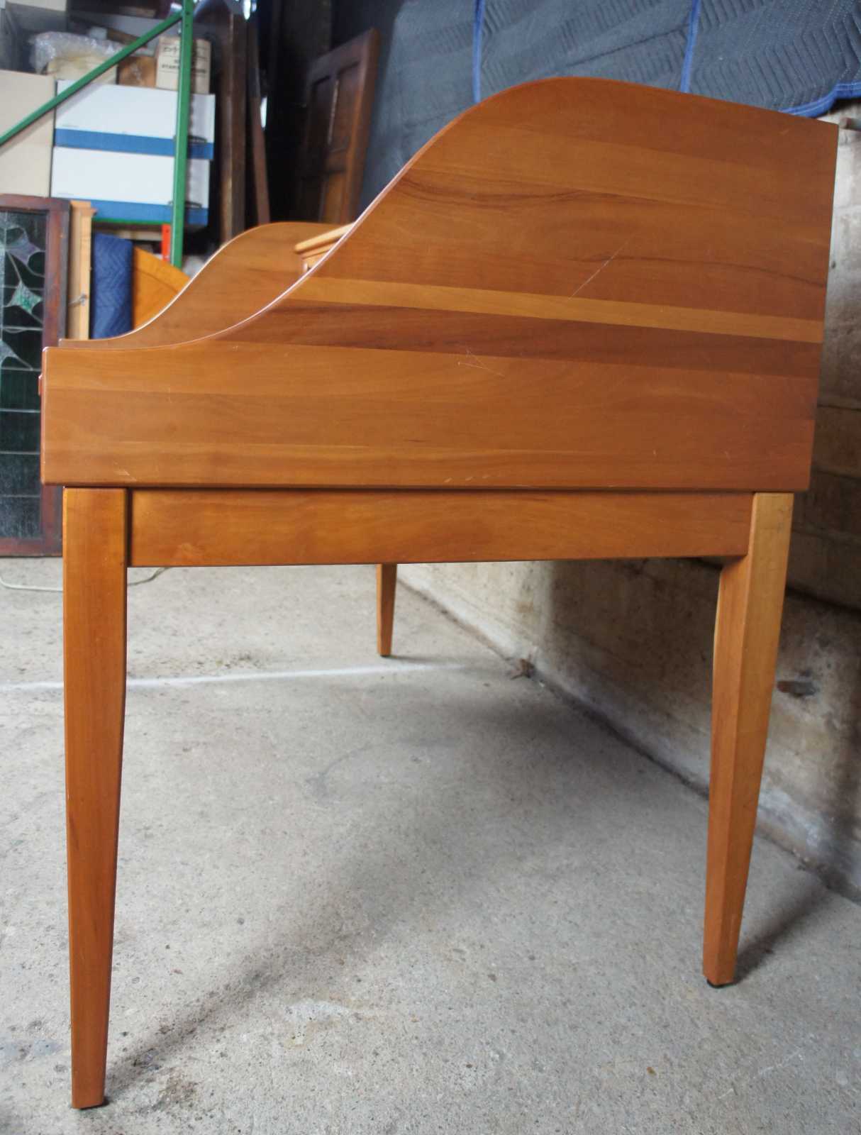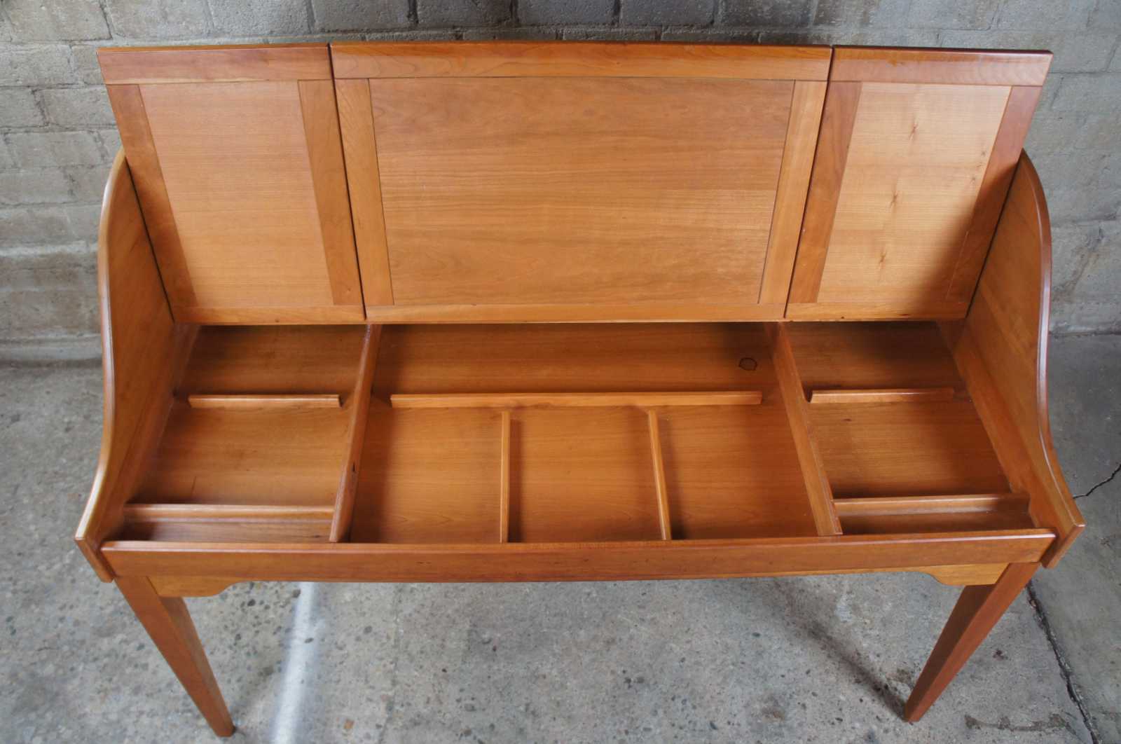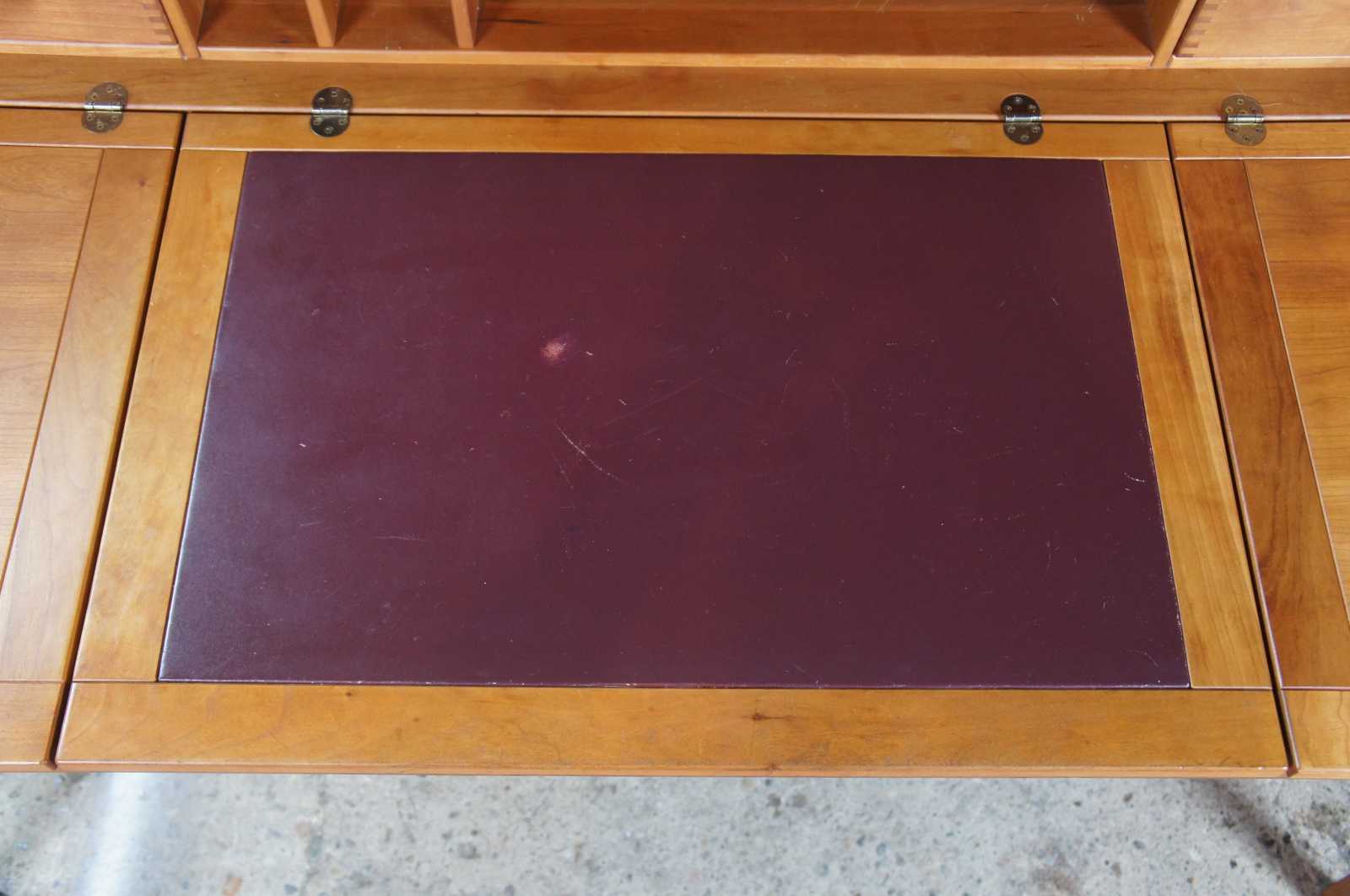 An incredible desk by Holmes County Chair Company. Made from solid cherry with a minimalist streamline shape. Features six fingertailed drawers along the back and cubbies for storage. Table surface is leather lined along the center and features dual action, hinging open to reveal additional storage. Legs remove for ease of transport. Holmes County near Canton, Ohio has been handcrafting furniture since 1980.
