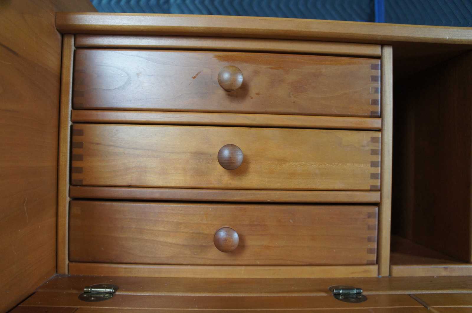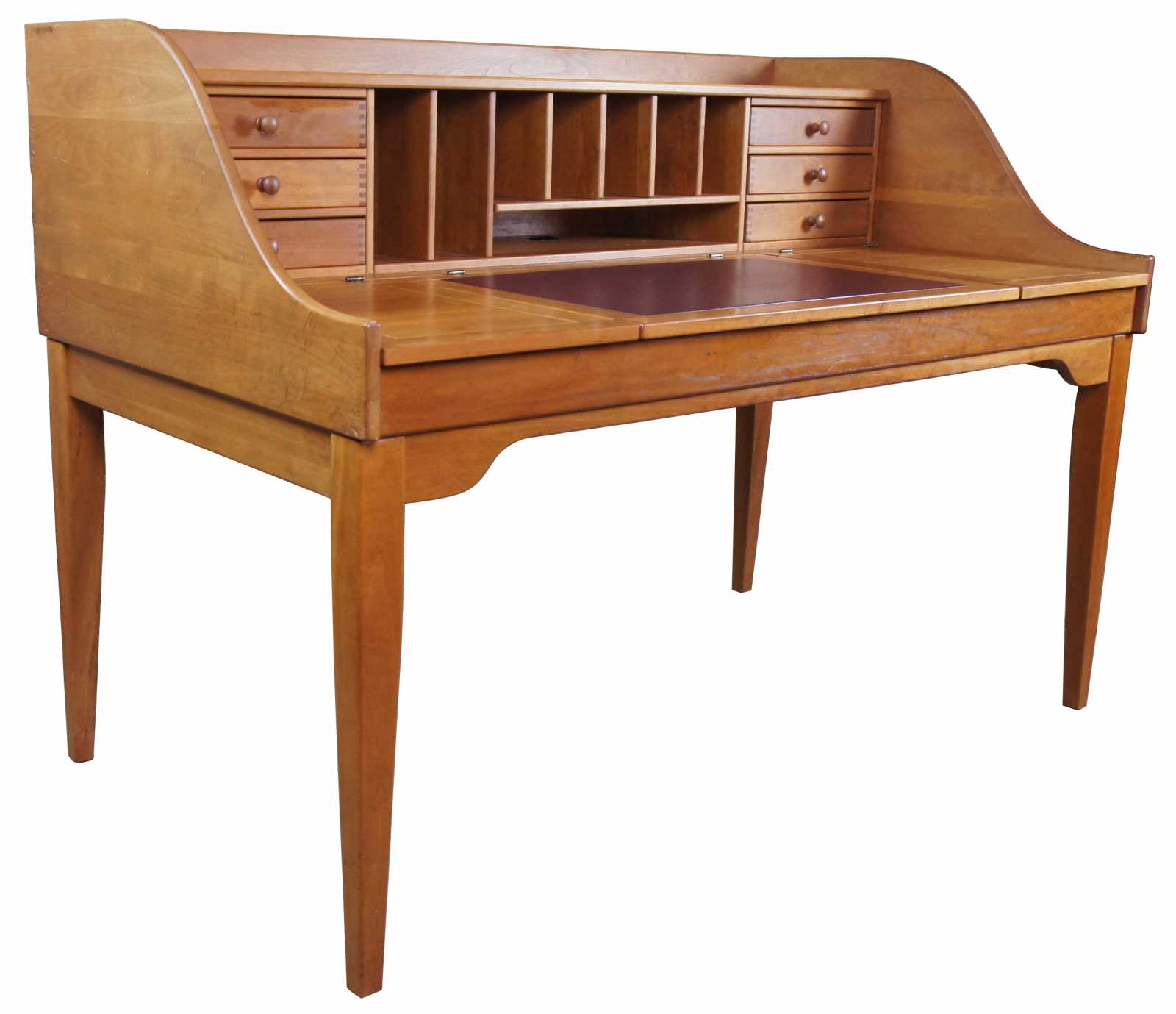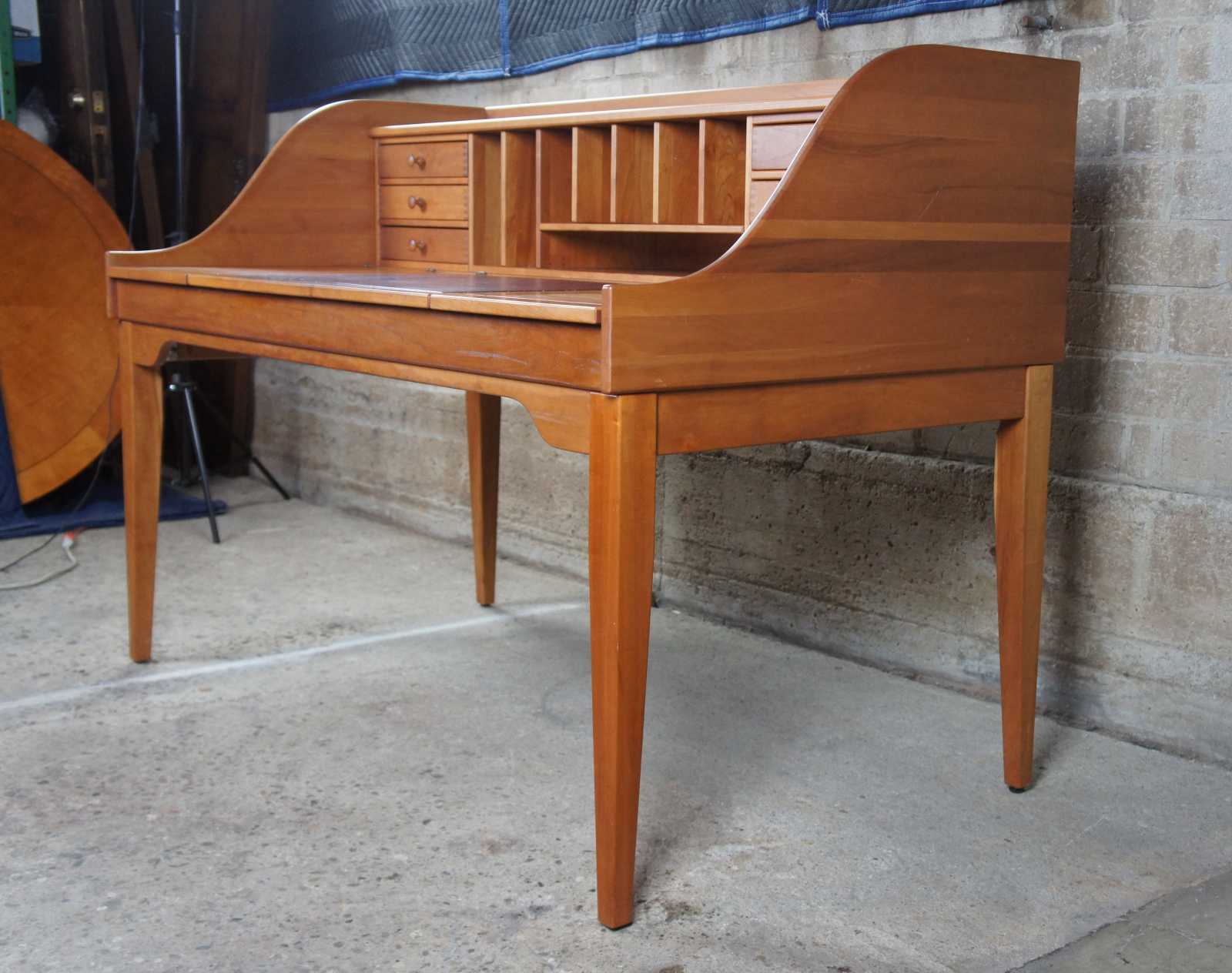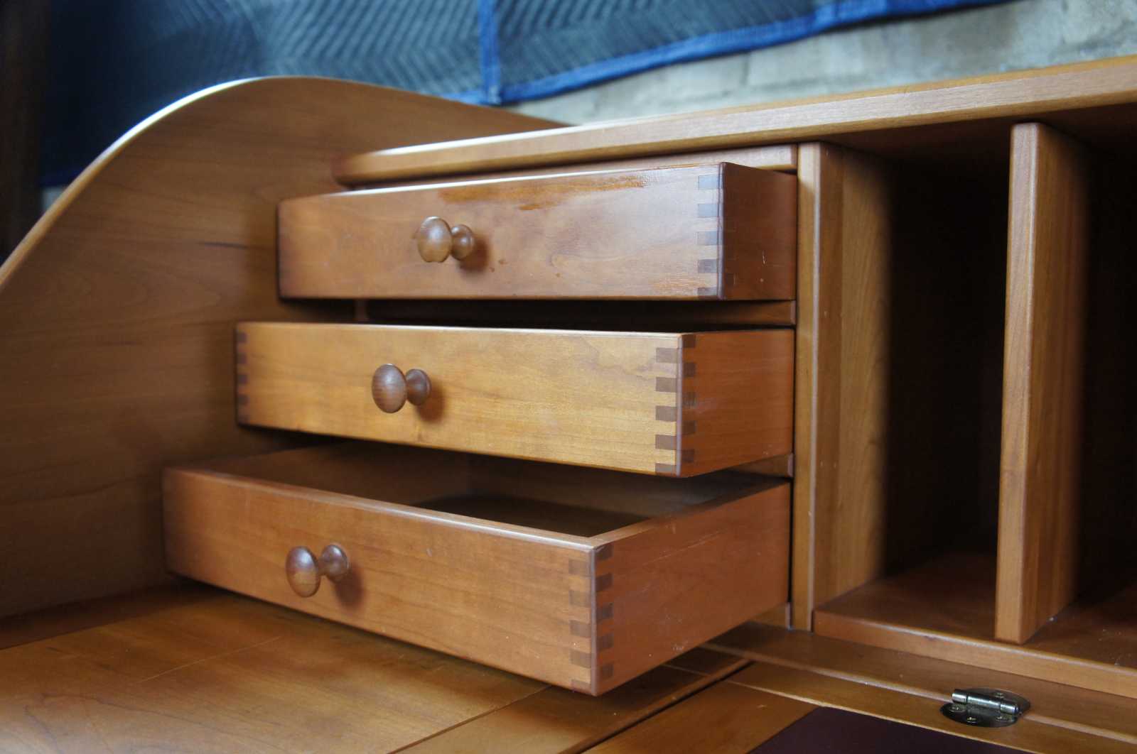 An incredible desk by Holmes County Chair Company. Made from solid cherry with a minimalist streamline shape. Features six fingertailed drawers along the back and cubbies for storage. Table surface is leather lined along the center and features dual action, hinging open to reveal additional storage. Legs remove for ease of transport. Holmes County near Canton, Ohio has been handcrafting furniture since 1980.