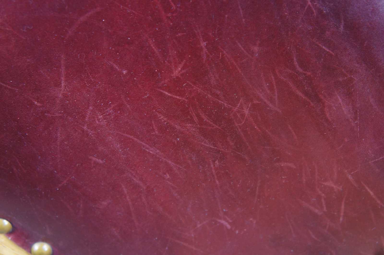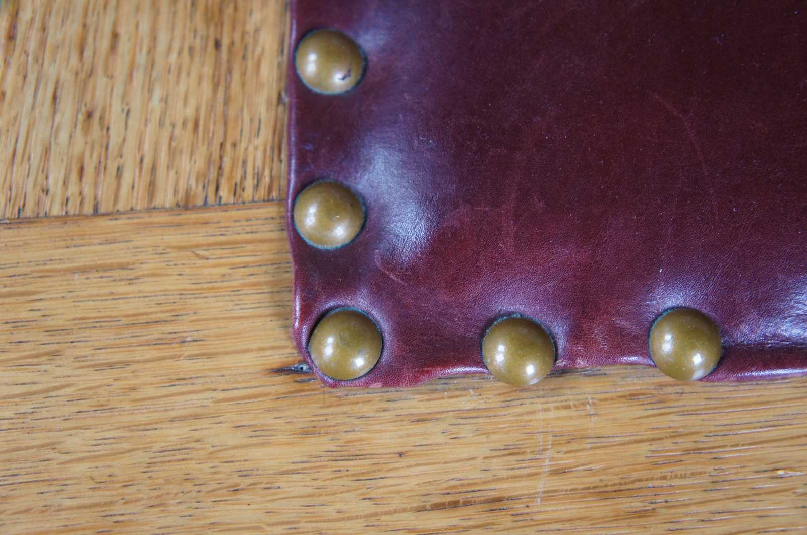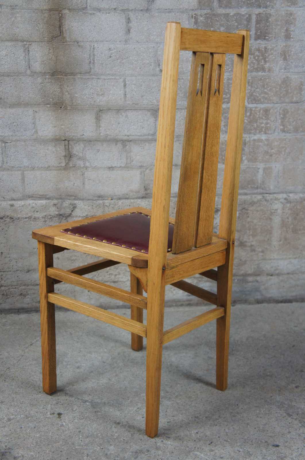 Circa 1920s arts and crafts oak dining or side chair. Features a burgundy leather seat with nailhead trim and a pierced rear splats with ribbon design.