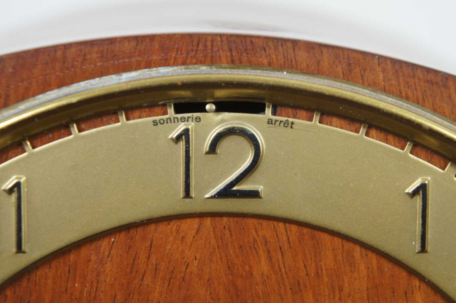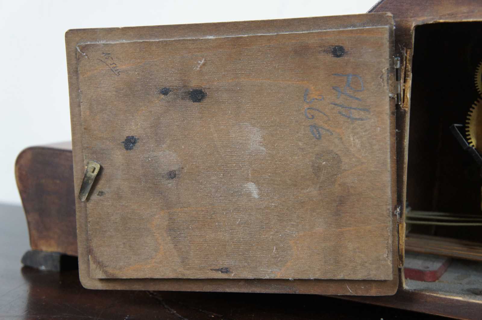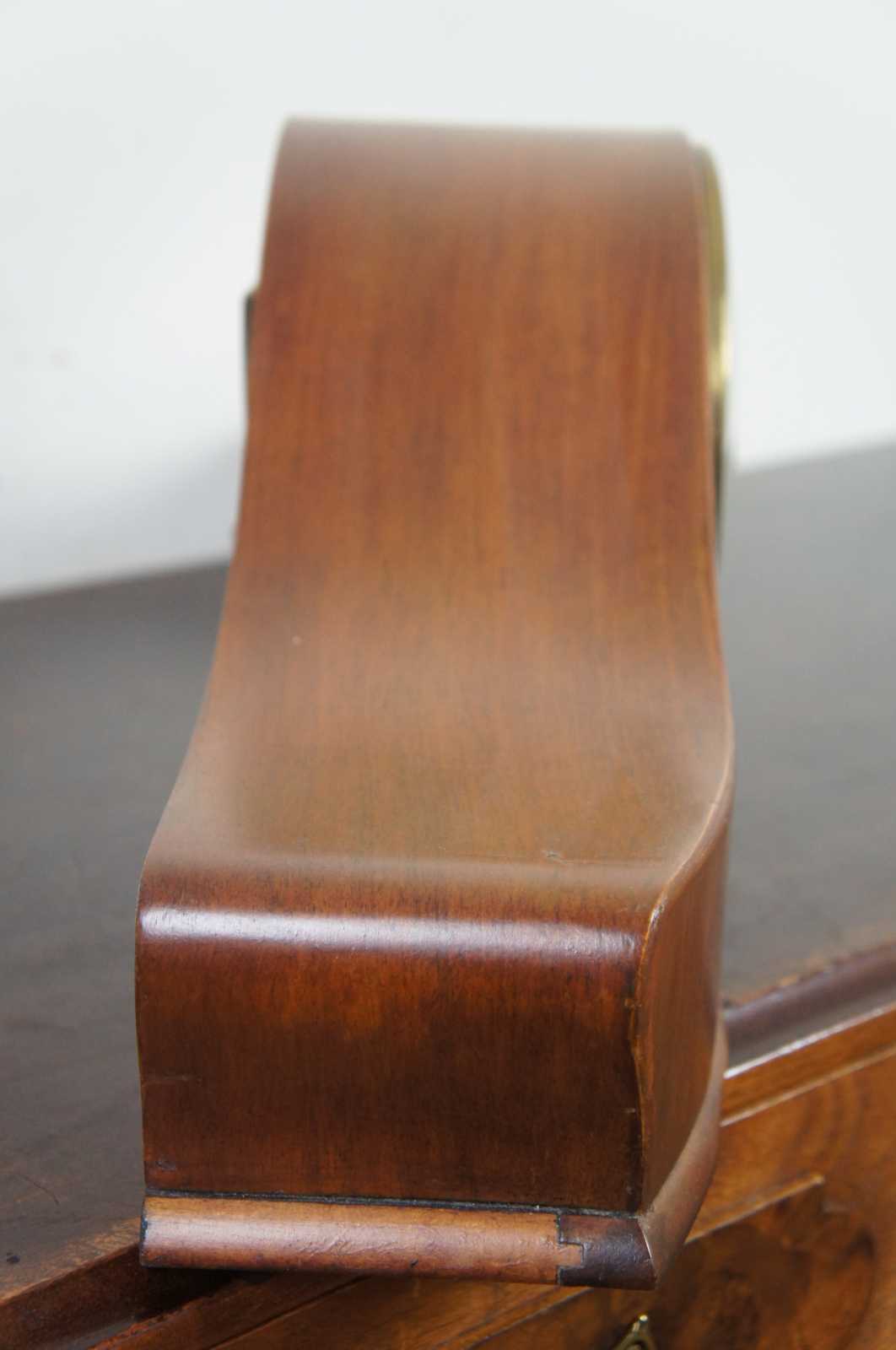 Antique art deco style, key wound, chiming mantel clock with a wooden oxbow/yoke shaped case and brass numbers.