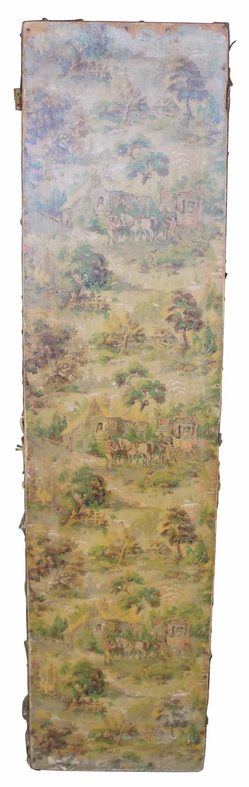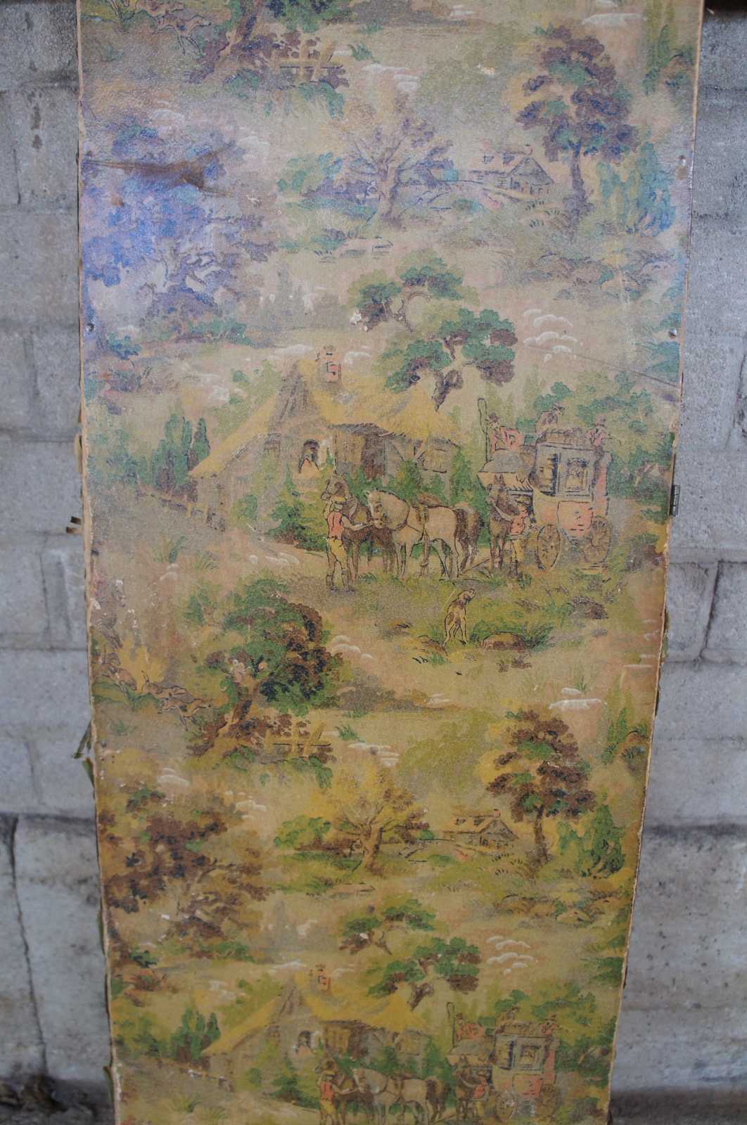 Late Victorian room divier. Features a repeating country landscape with a horse and buffy being loaded outside of a cottage.