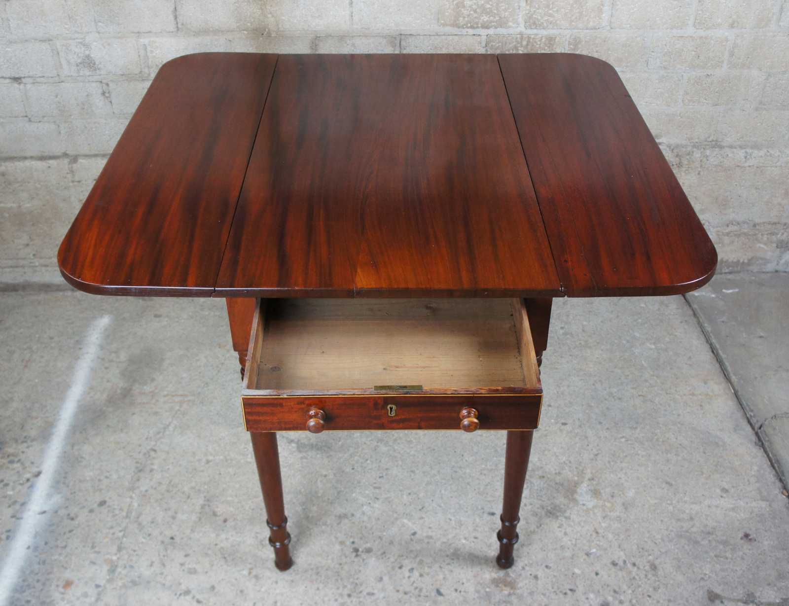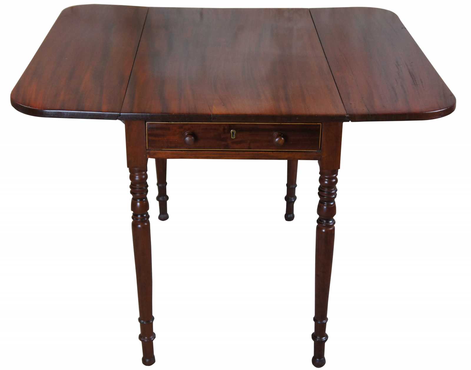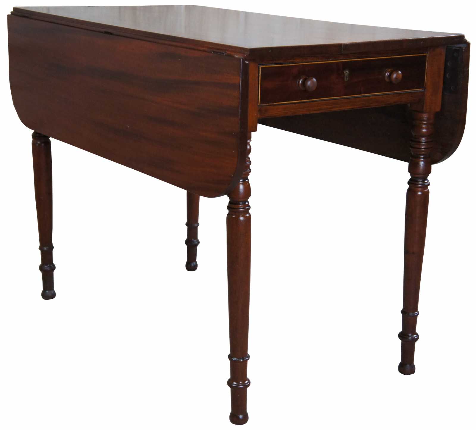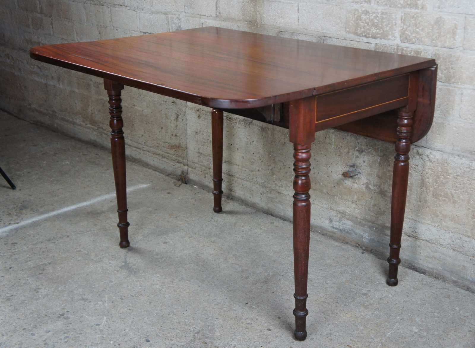 Early 19th century Federal drop leaf dining table. Made from mahogany with hand dovetailed and inlaid drawer over turned and tapered legs.