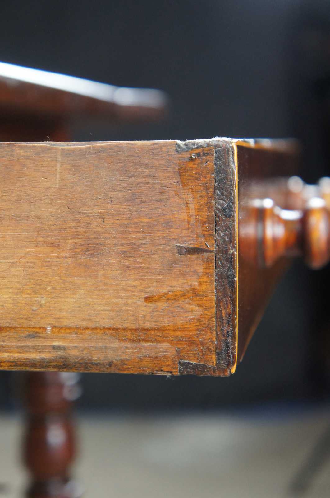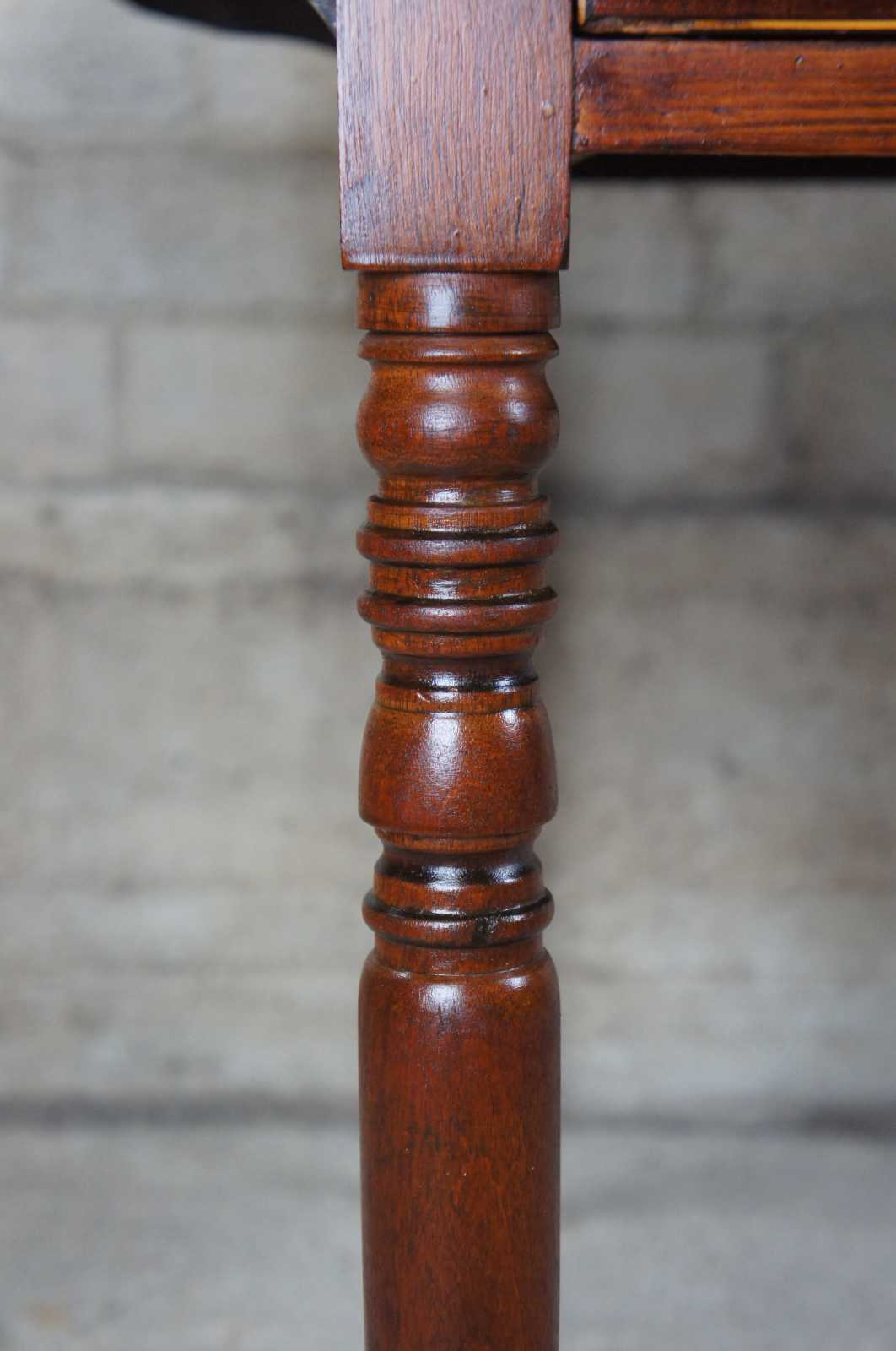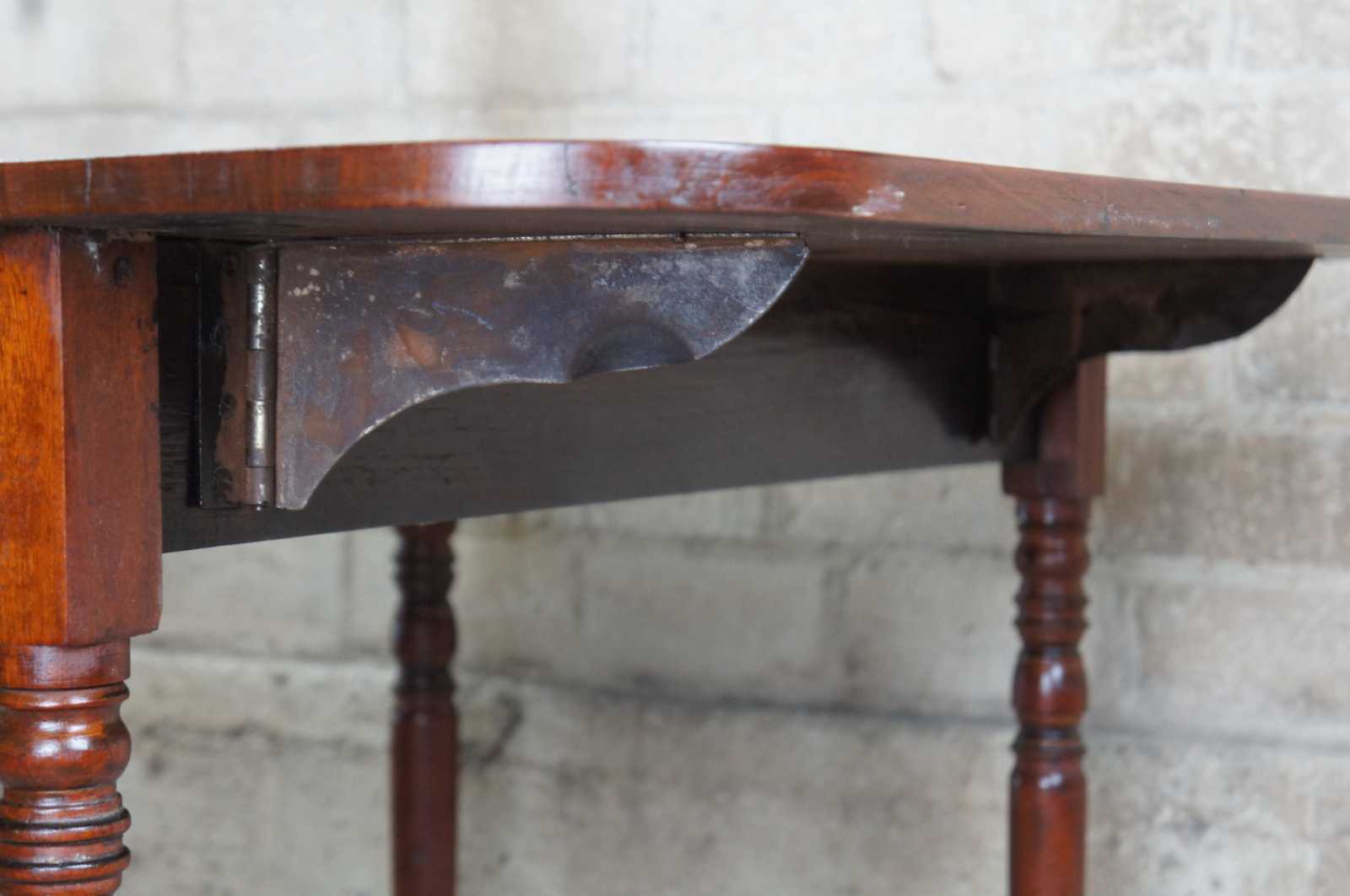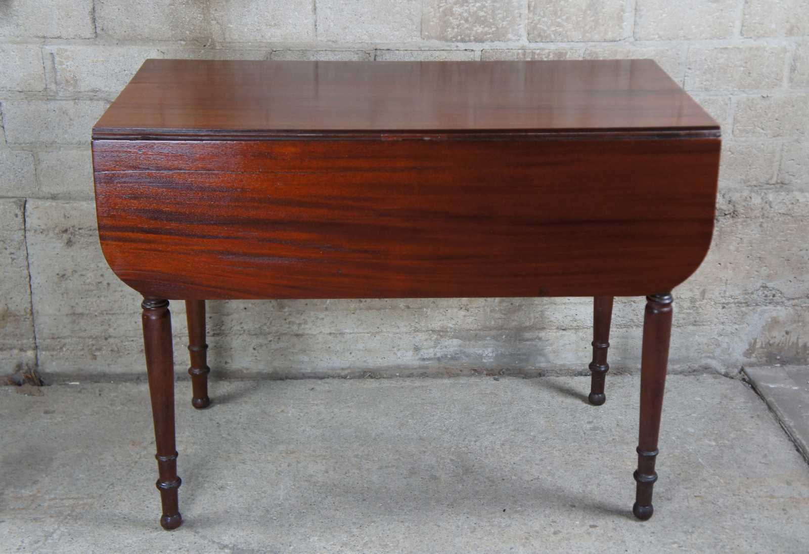 Early 19th century Federal drop leaf dining table. Made from mahogany with hand dovetailed and inlaid drawer over turned and tapered legs.