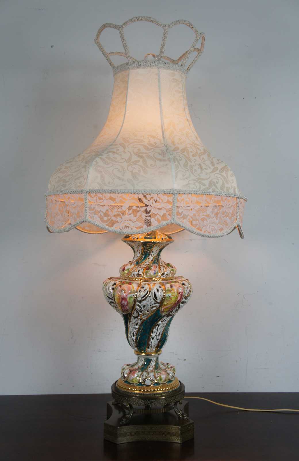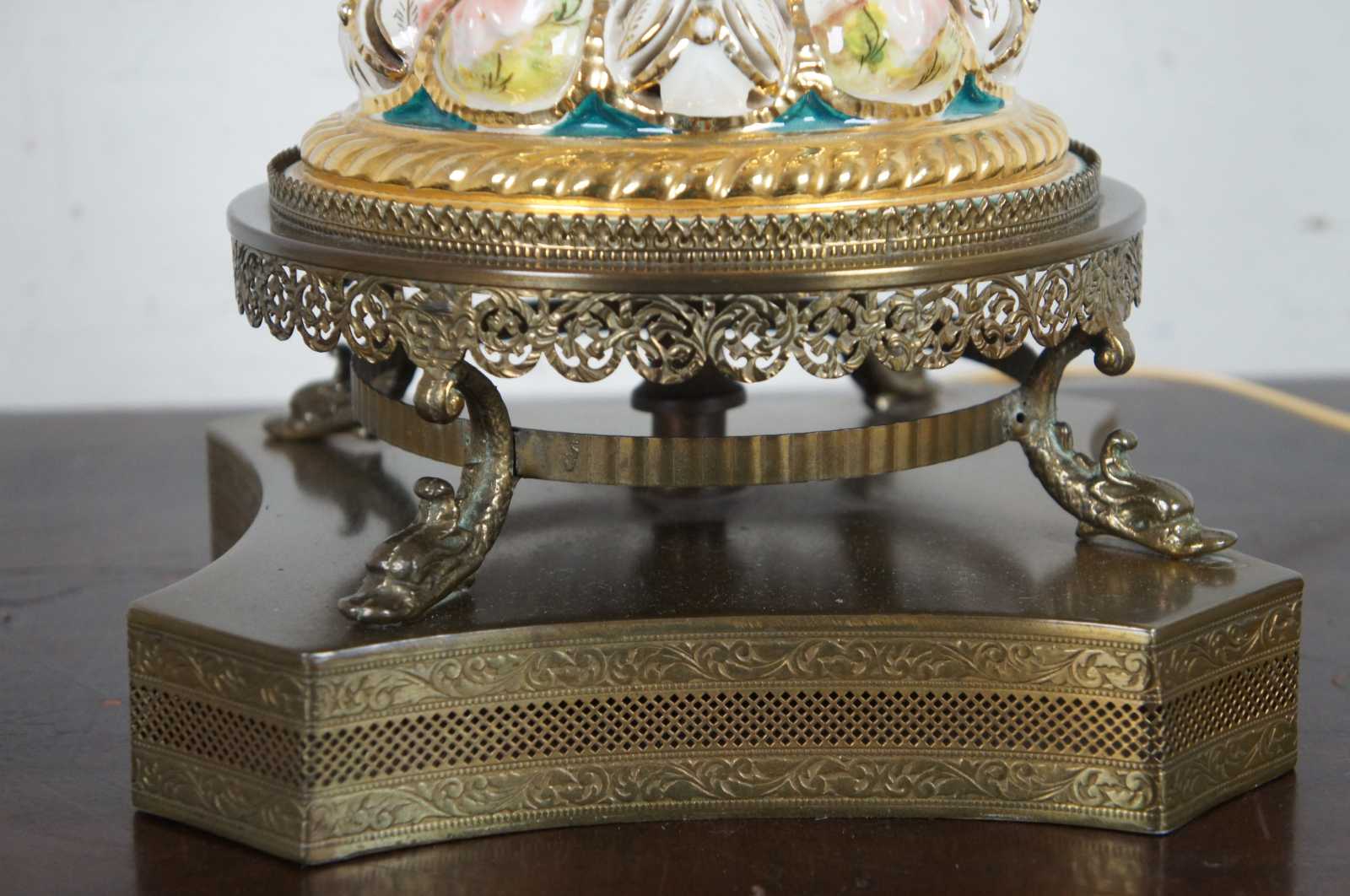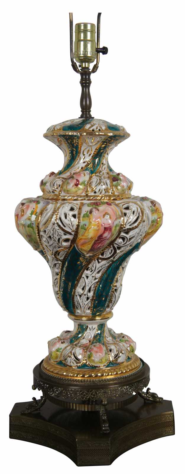 Antique Italian capodimonte style table lamp featuring a swirling, reticulated pattern of green and white stripes along an urn shaped body with painted figures and cherubs, standing upon a brass dolphin footed base. Also includes a white brocade and lace shade.