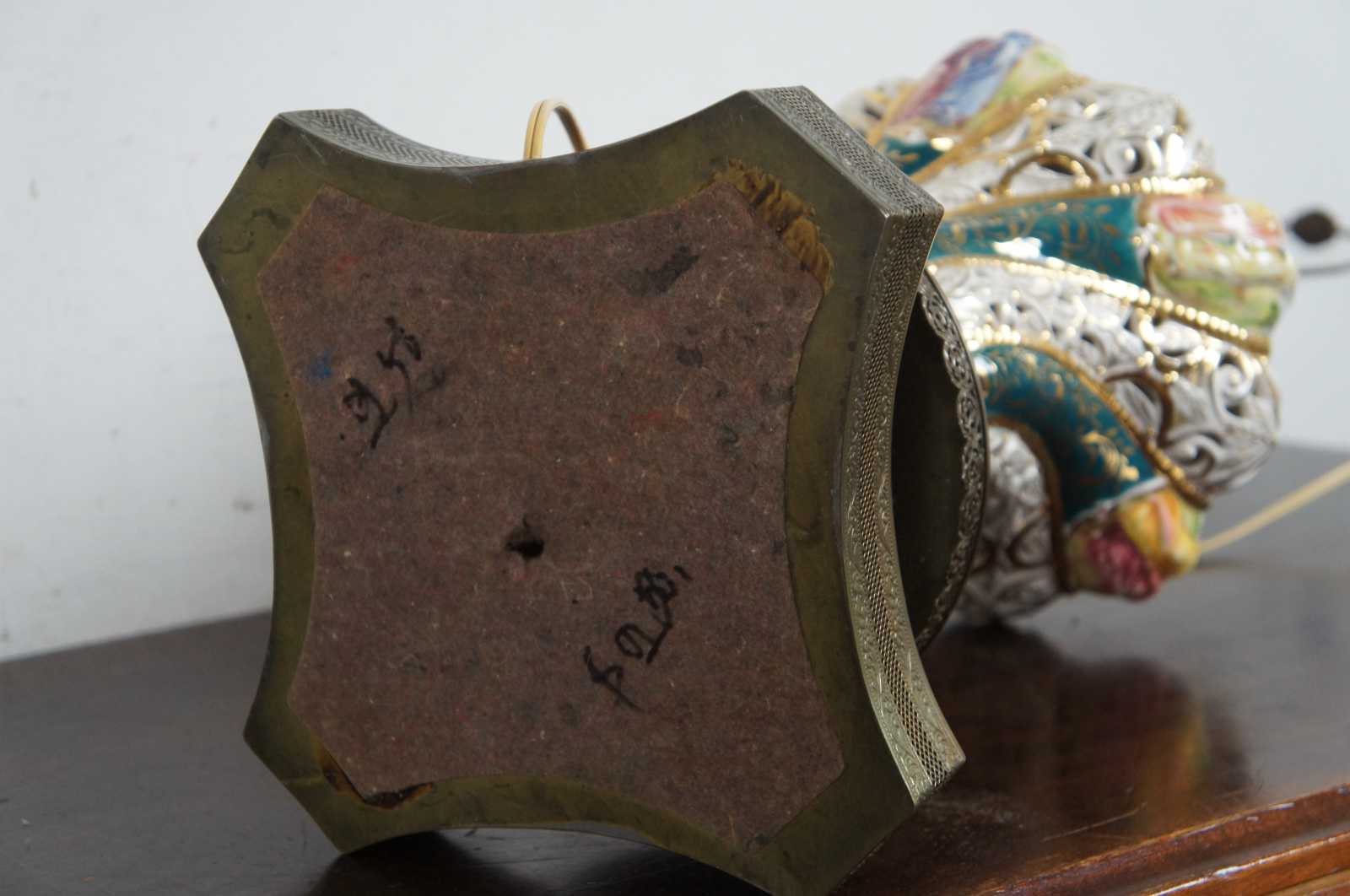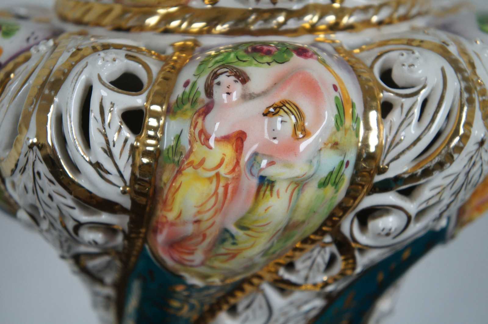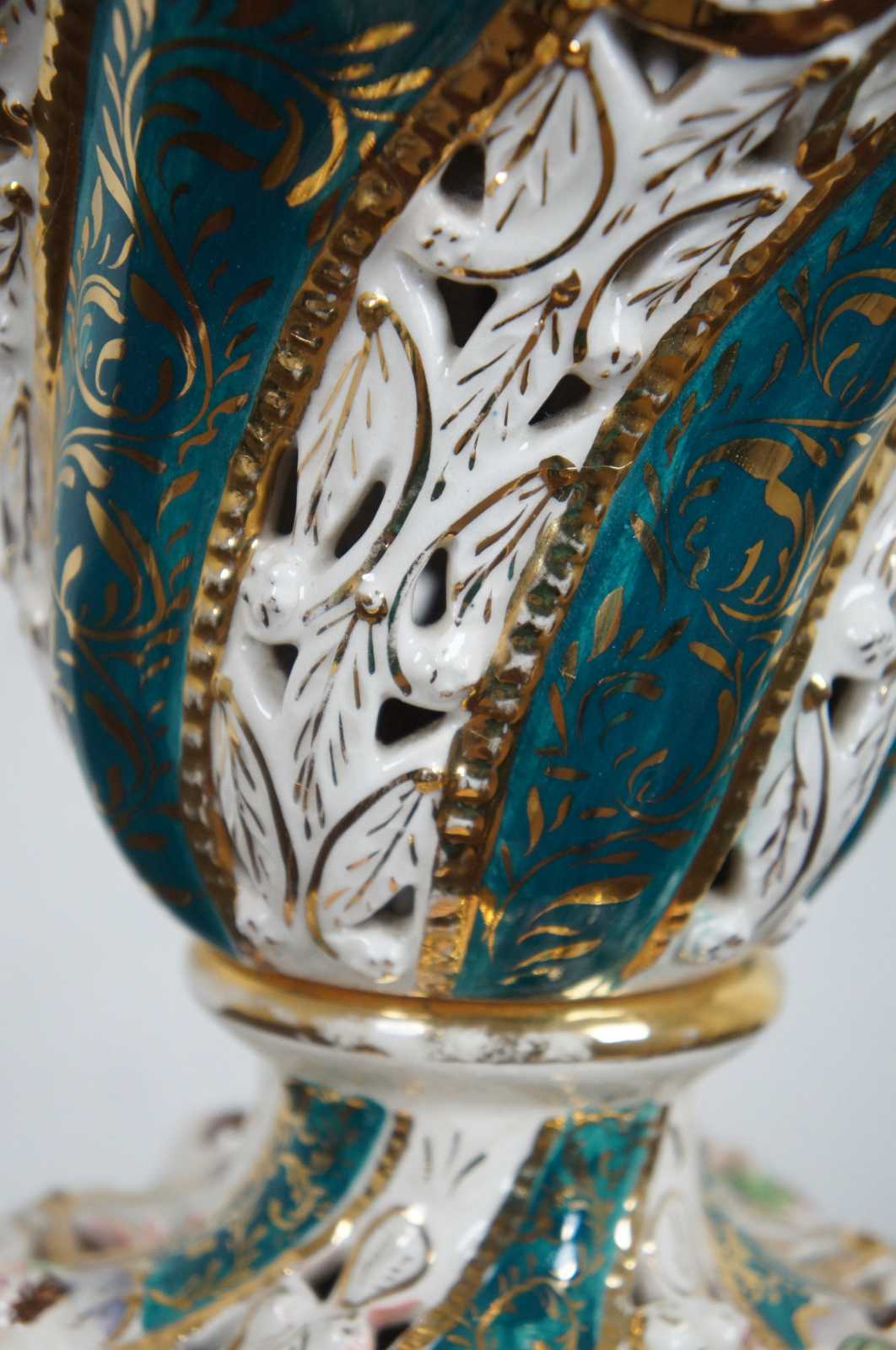 Antique Italian capodimonte style table lamp featuring a swirling, reticulated pattern of green and white stripes along an urn shaped body with painted figures and cherubs, standing upon a brass dolphin footed base. Also includes a white brocade and lace shade.