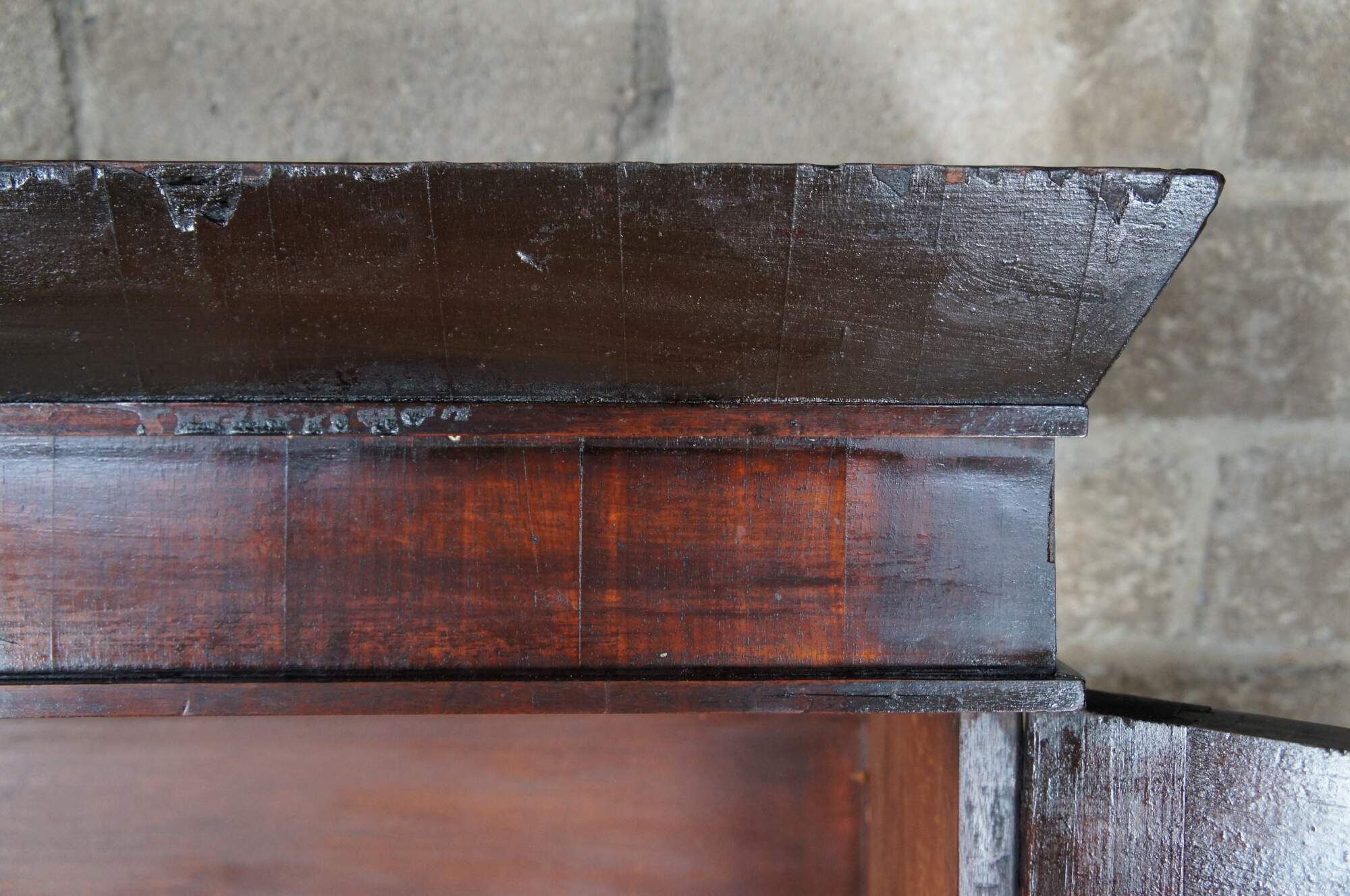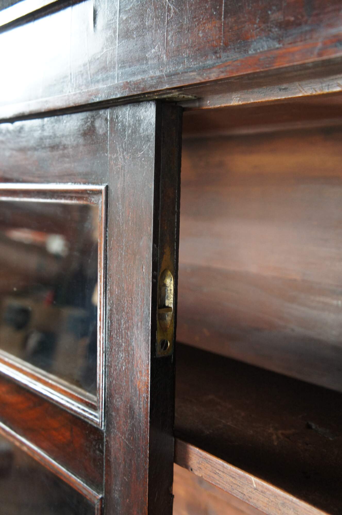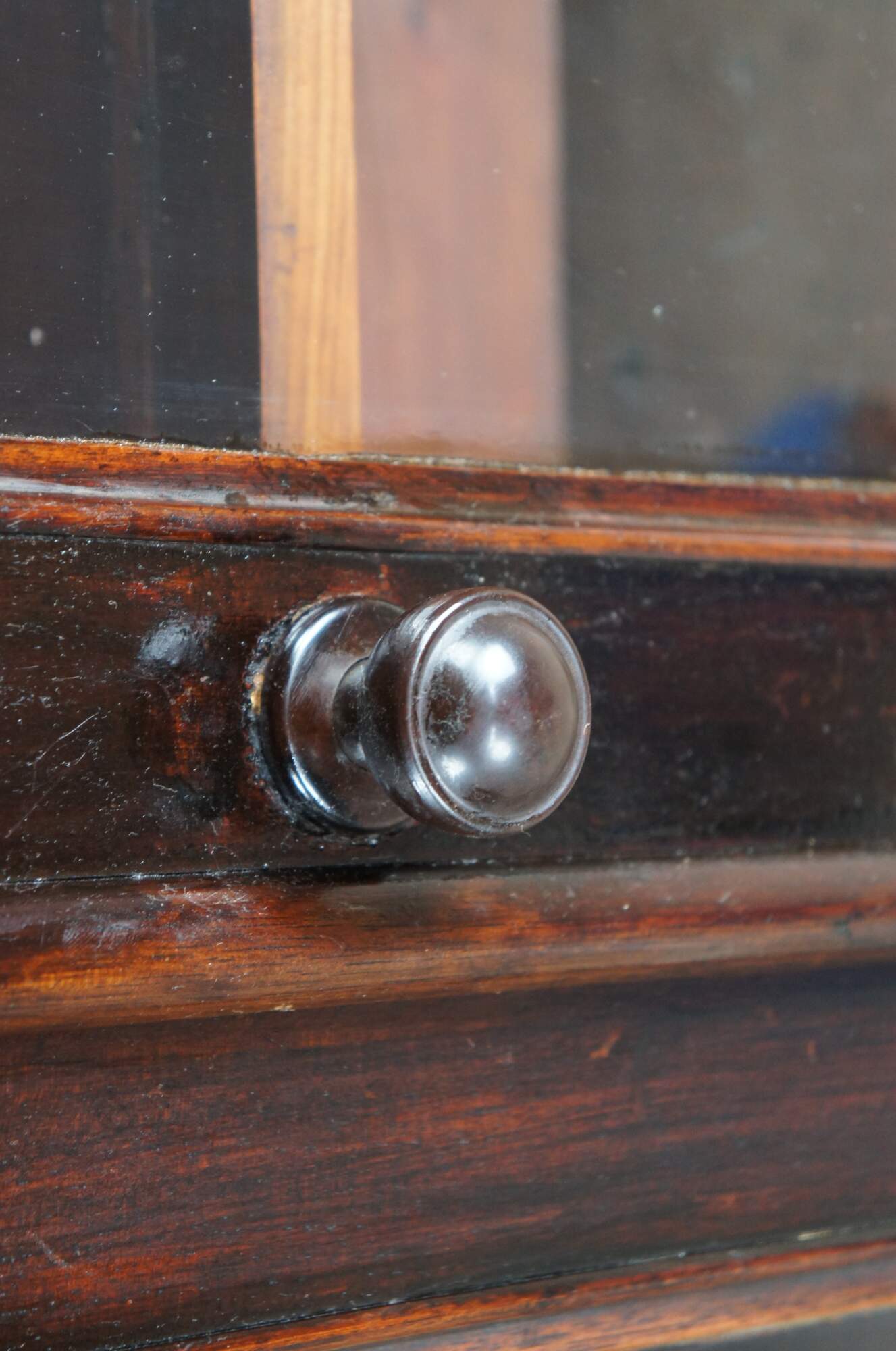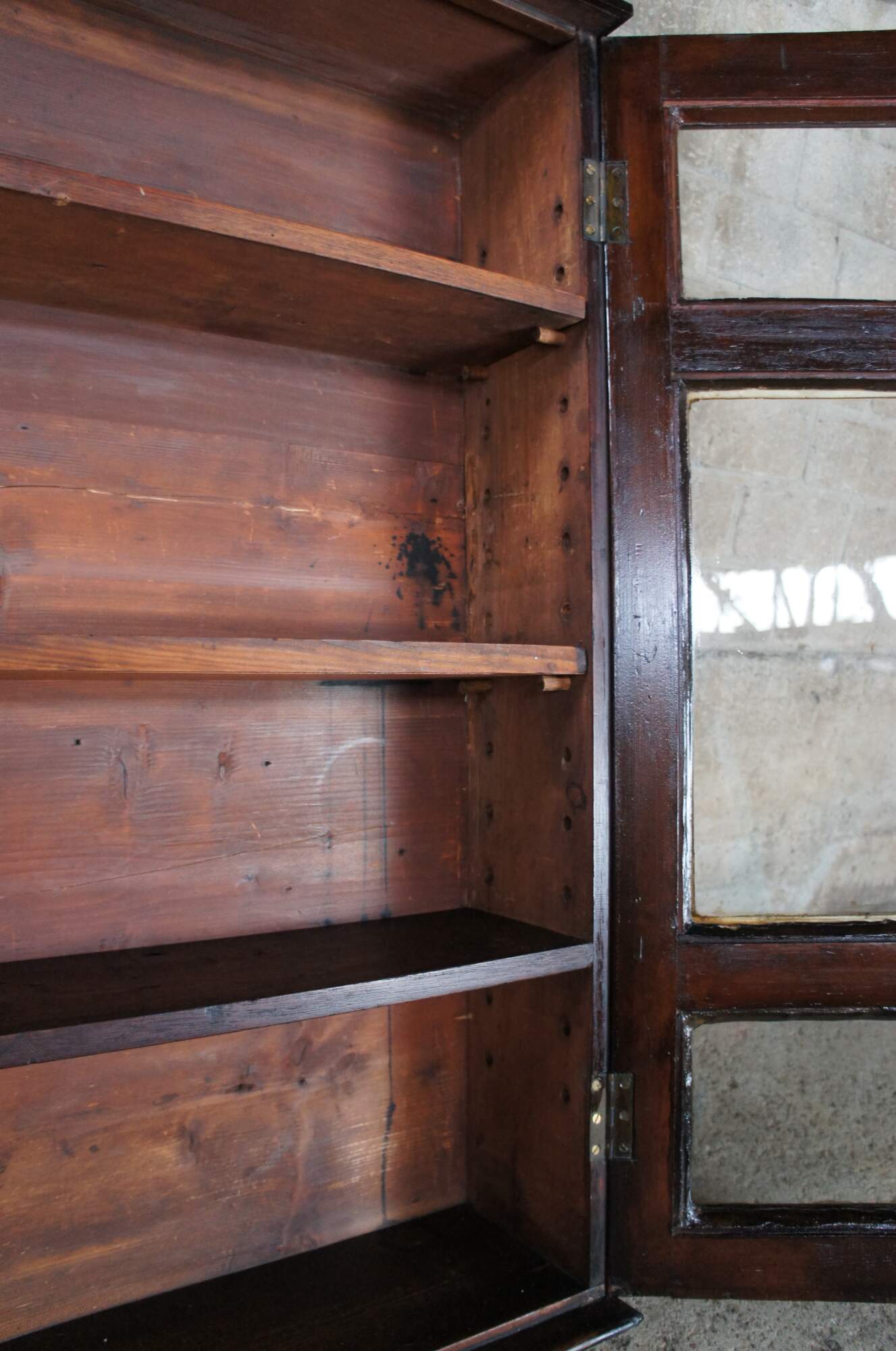 A stunning Victorian era American Country wall hanging curio cabinet Made from mahogany with three adjustable shelves behind original glass paned doors. It's large stature allows for versatile use. A great spice cabinet, hanging cupboard, display cabinet, bookshelf, medicine or apothecary piece.