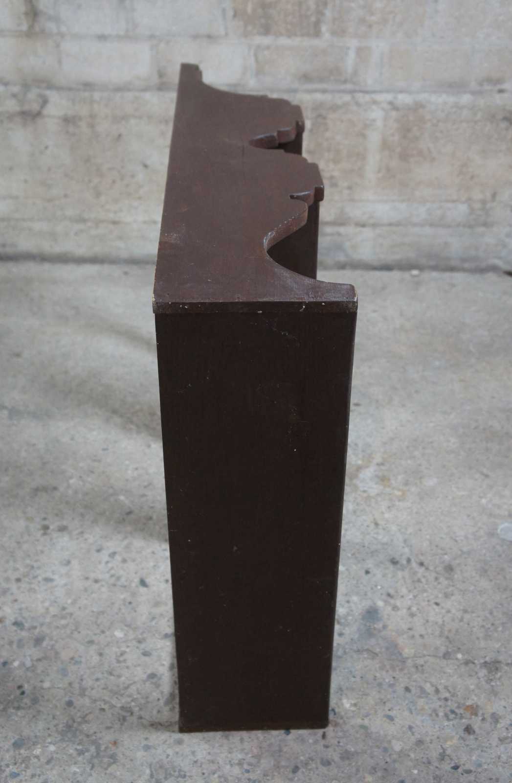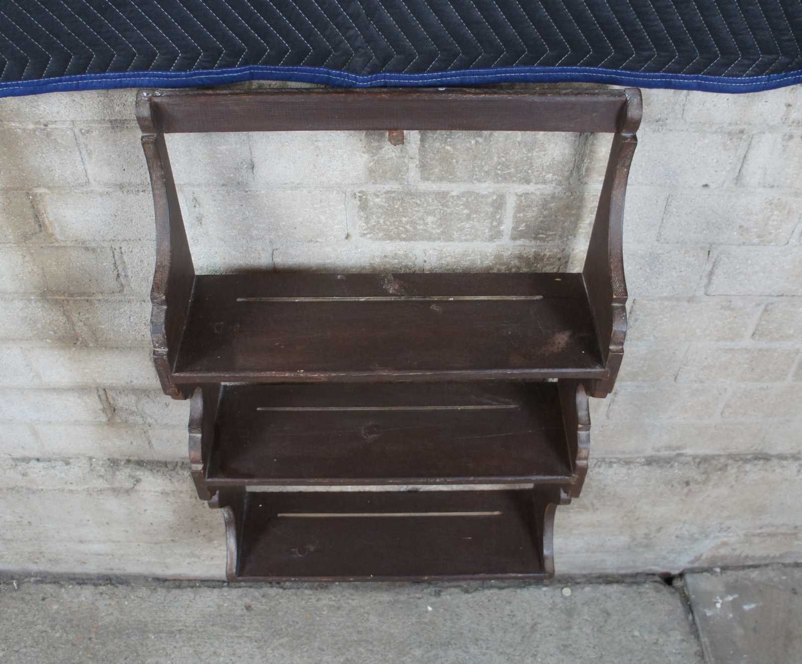20th century pine hanging shelf. Features 3 shelves with a serpentine design along the sides. Includes grooves along the back for plate storage. Finished in brown paint.