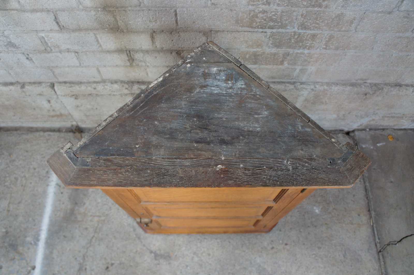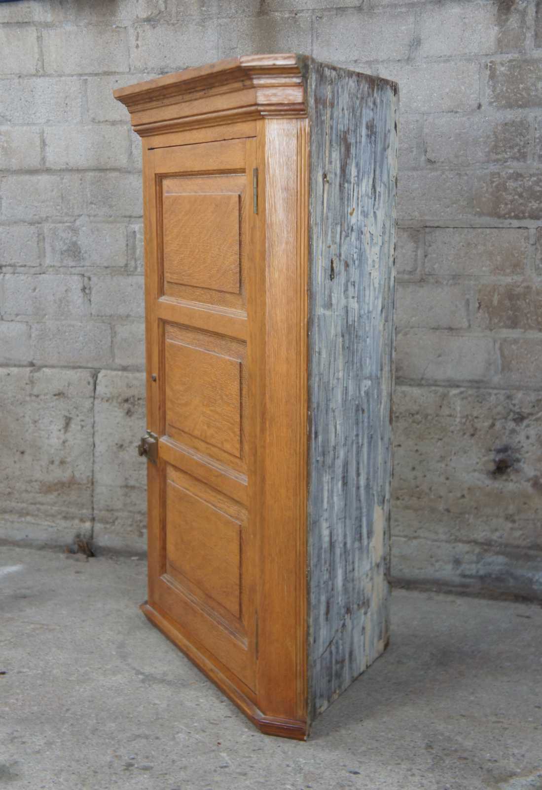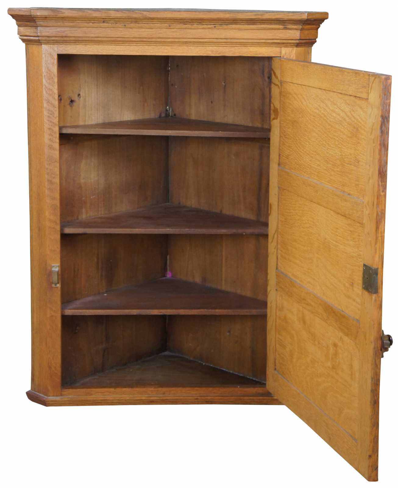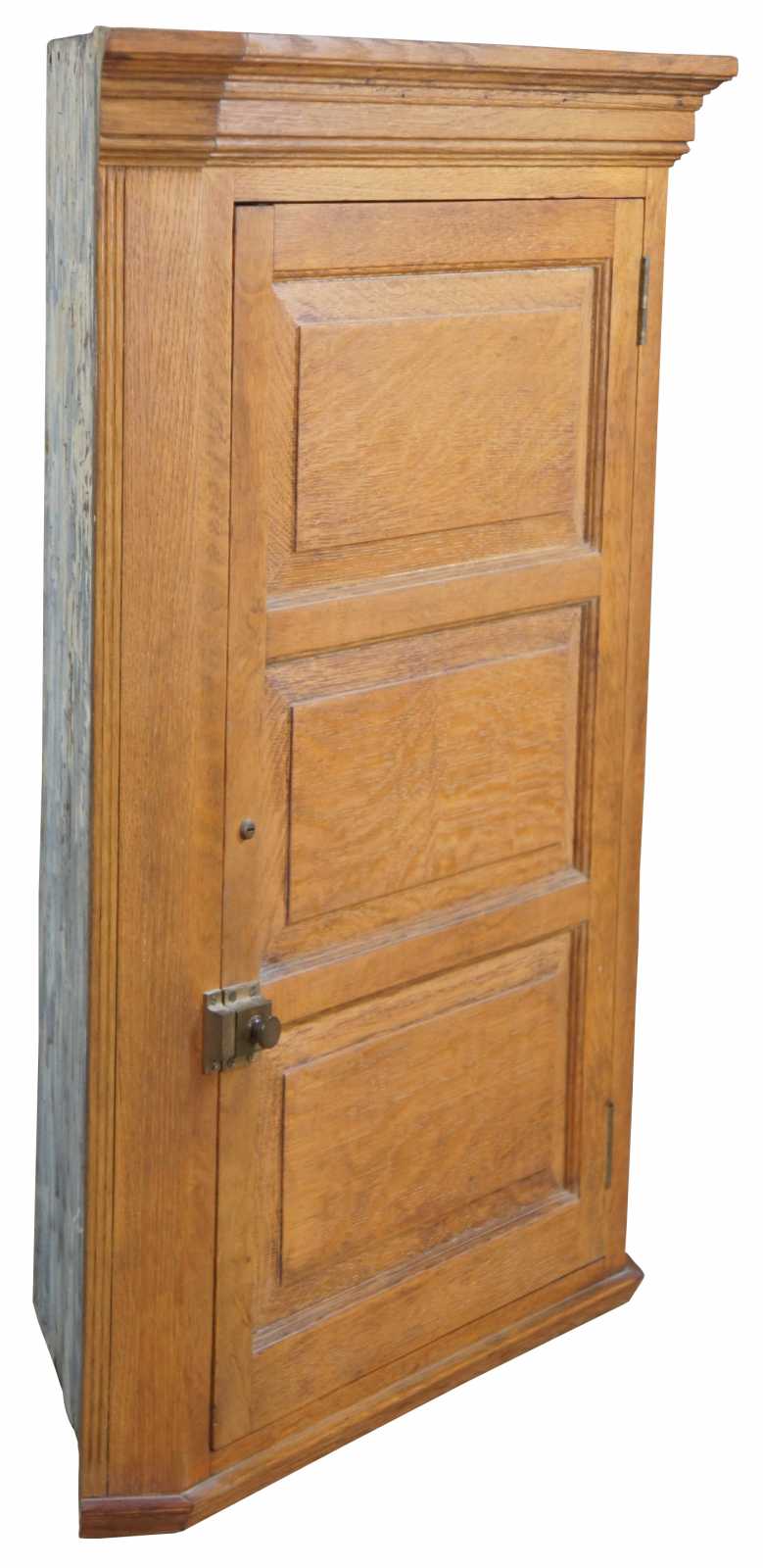 Early 20th century oak haning corner cabinet or cupboard. Features 3 shelves behind a paneled (tiger) quartersawn oak door with brass latch.