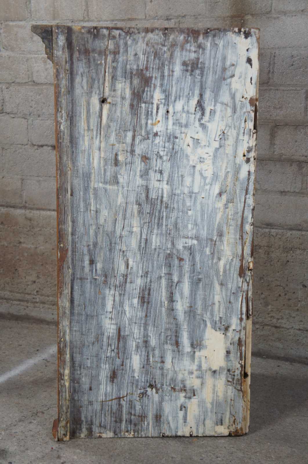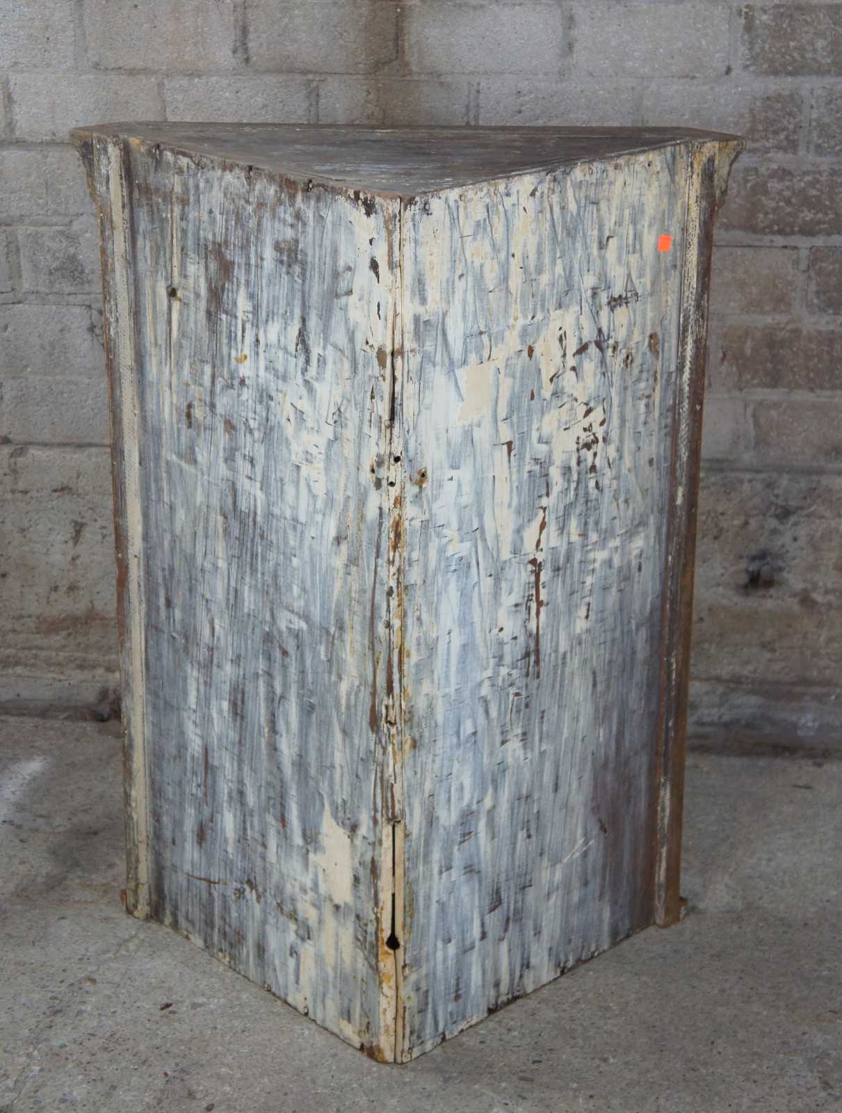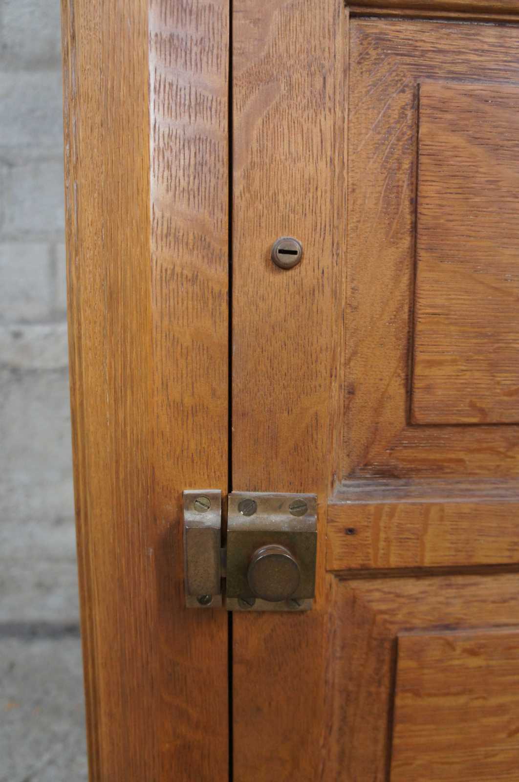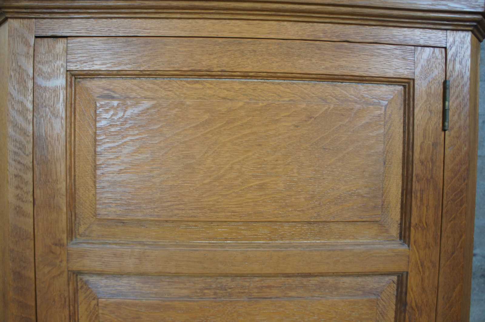 Early 20th century oak haning corner cabinet or cupboard. Features 3 shelves behind a paneled (tiger) quartersawn oak door with brass latch.