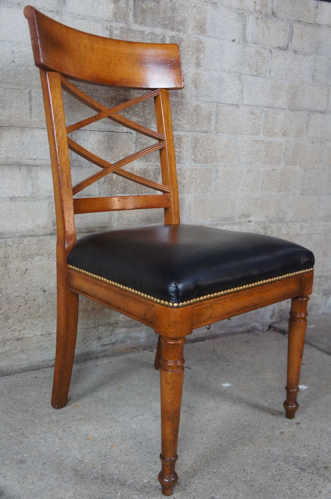Milling Road for Baker (American, Grand Rapids, 1903-), late 20th century. Set of Neoclassic walnut dining chairs, featuring a curved crest, an open double X-form fluted lattice back, with molded aprons, tapering tuned legs, and black leather and brass nailhead tack upholstery. Manufacturer's labels to underside. Product number MR3041. Made in Italy.