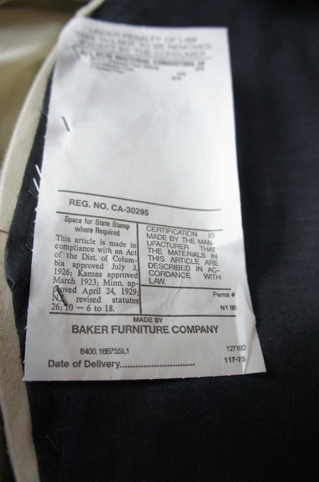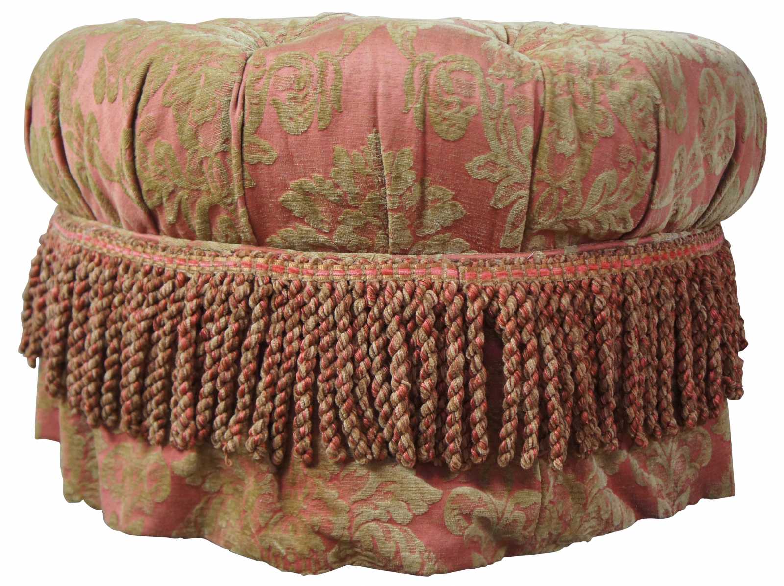 Late 20th century Baker Furniture tufted ottoman. Features a french style fabric in pink with olive green floral accents and tassels. The footstool or ottoman is supported by four tapered legs and shepard castors. GCN111.
