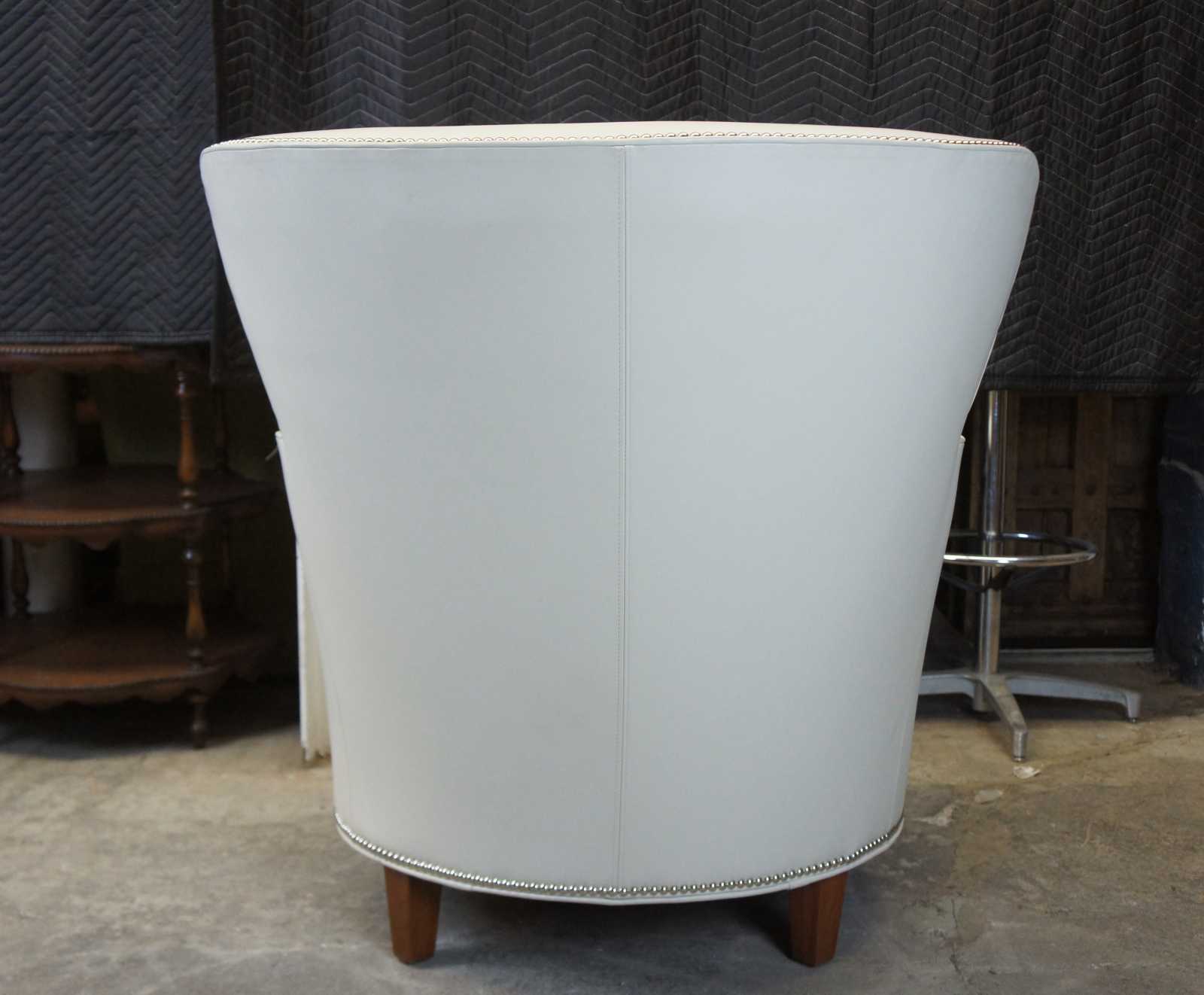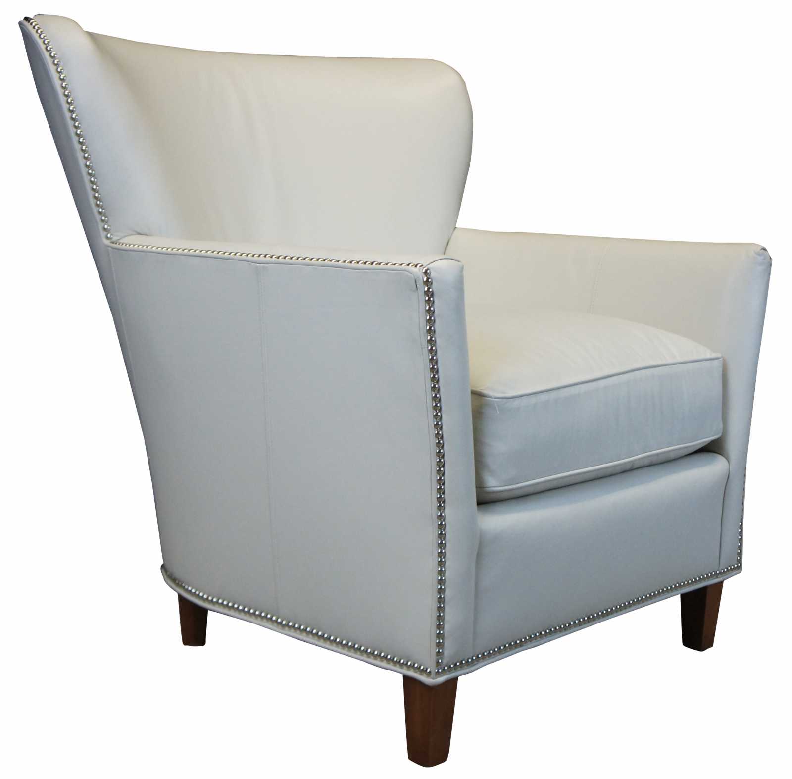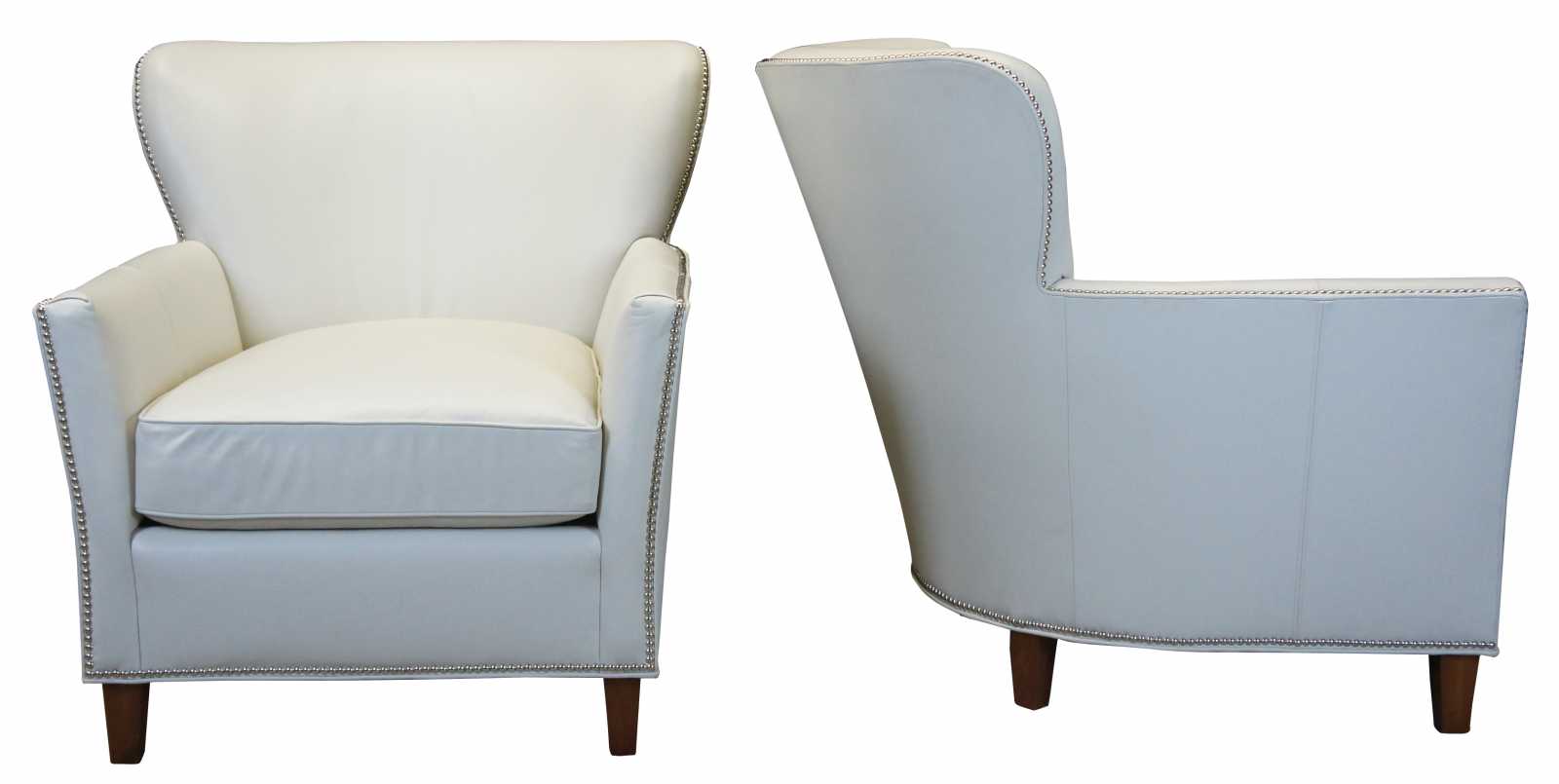 Two Harden Furniture wingback chairs. Made in McConnellsville NY in 2011. Upholstered in leather with silver nailhead trim. Chair is supported by square tapered legs. Perfect addition to any living room or library setting.