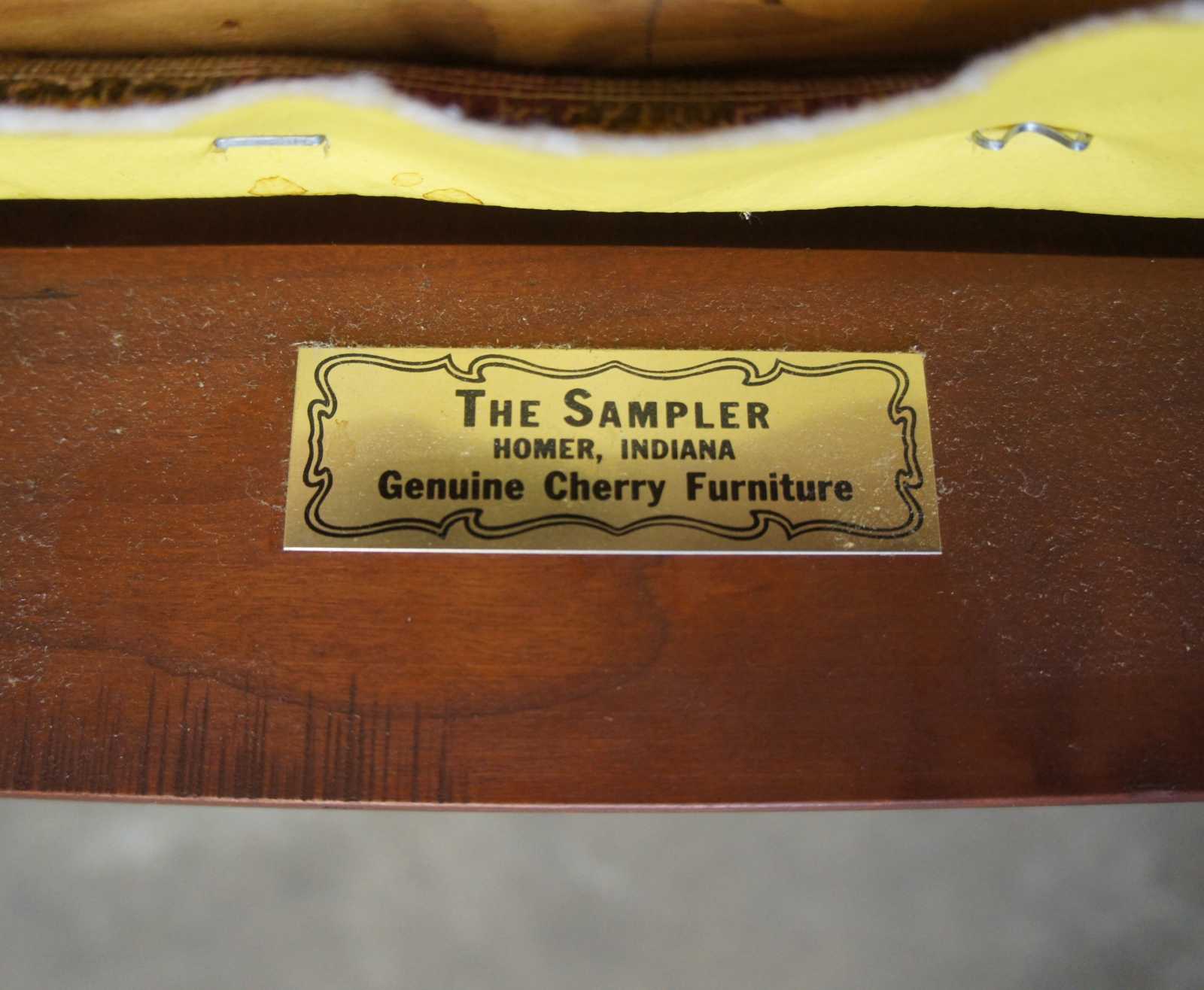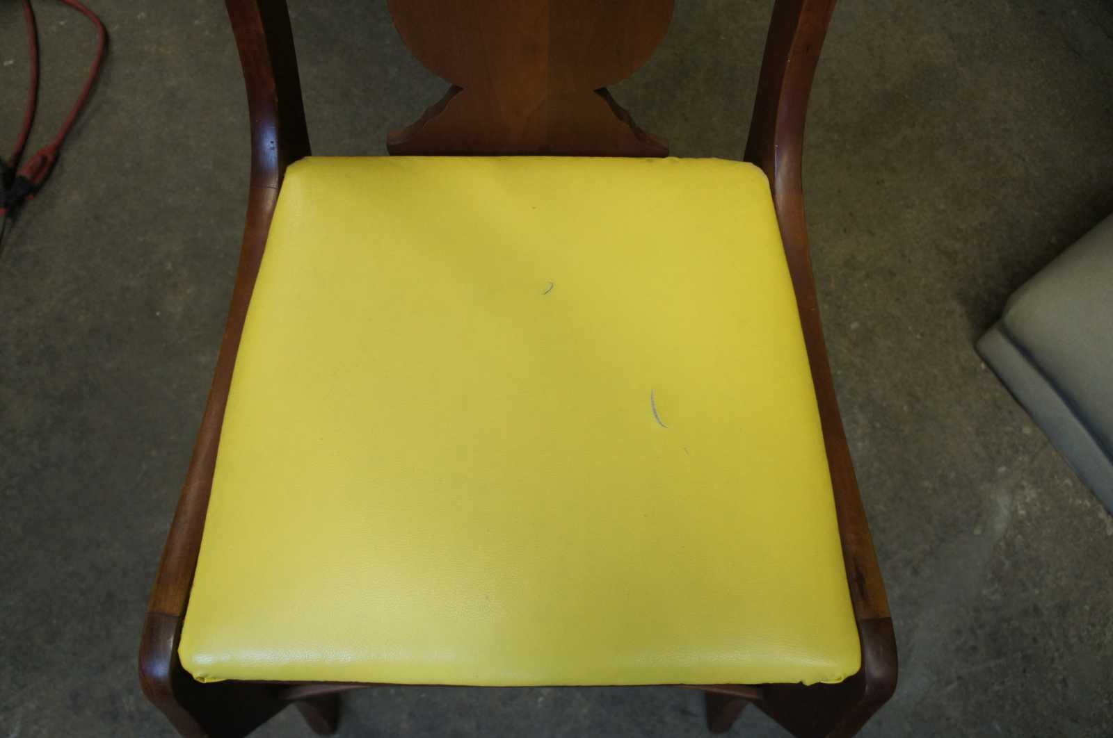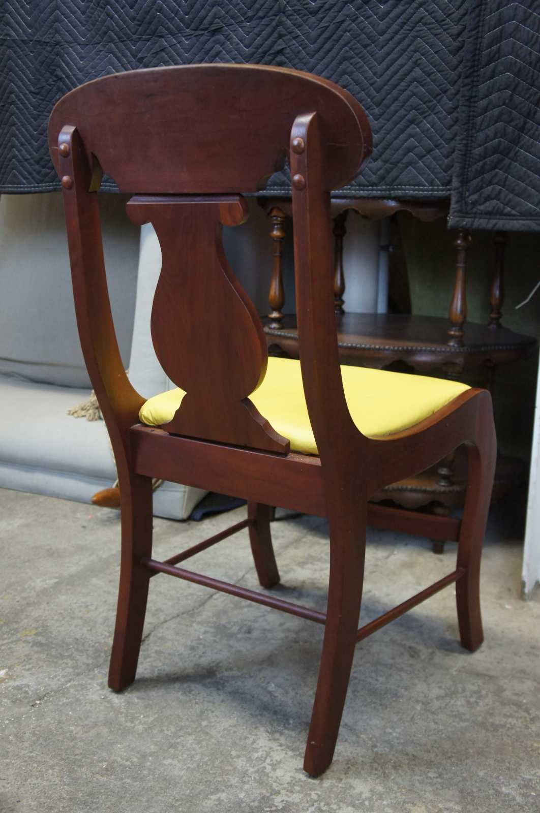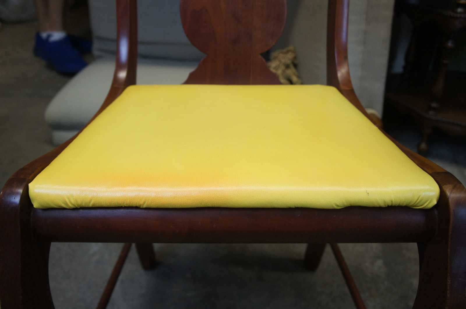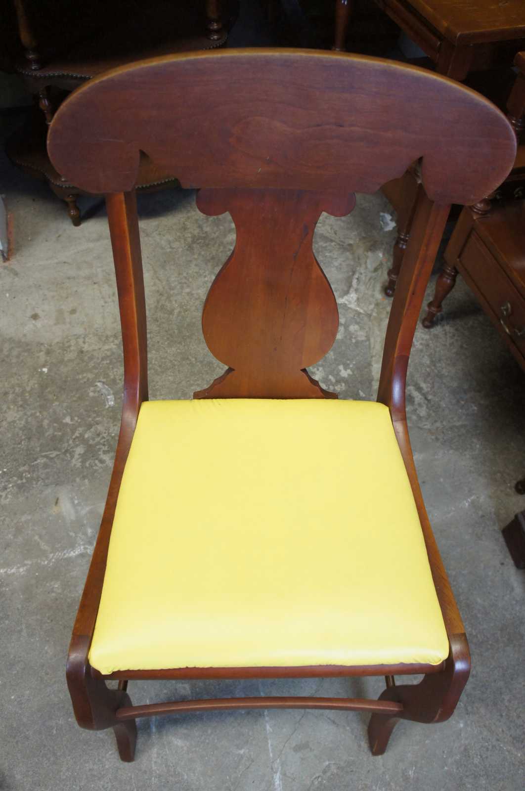 4 American Empire style dining chairs by The Sampler. The Sampler, out of Homer Indiana, has been making fine cherry furniture since 1946. Each of the four chairs is made from solid cherry, with a curved back rail over vase shaped splat and yellow vinyl seat. Circa 1980s.