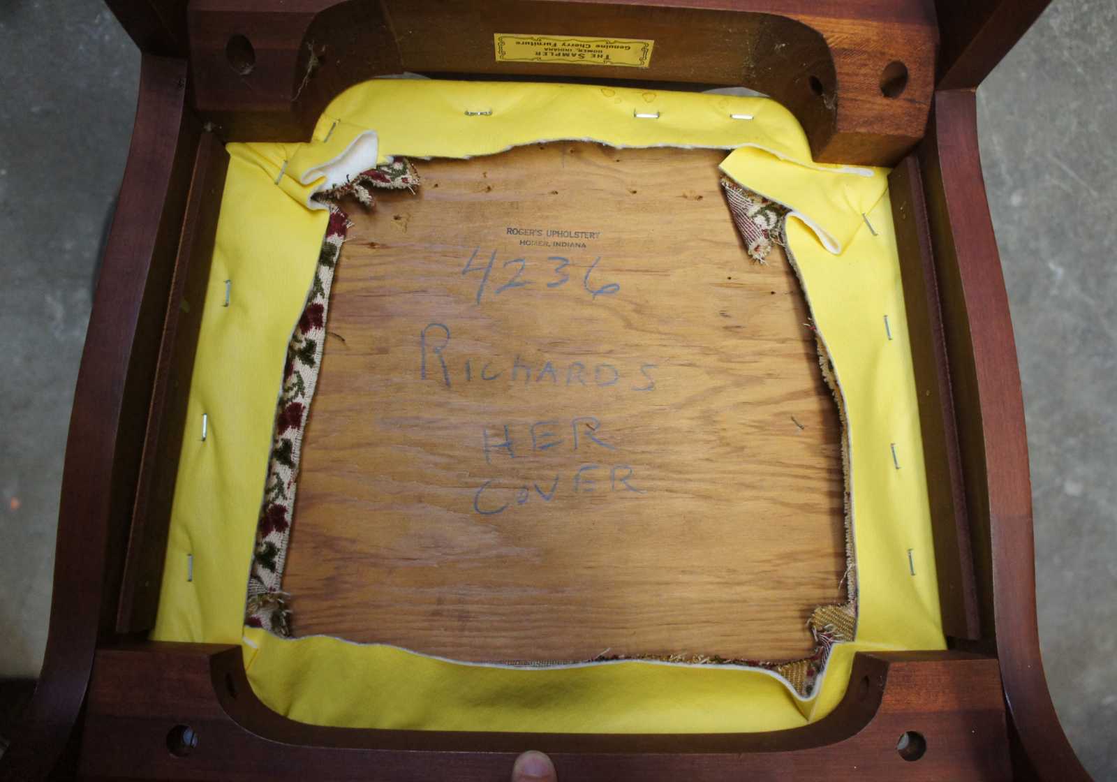 Gently used, Some staining and distressing to wood and vinyl, cushions were originally needlepoint, but were covered. The original fabric may still be able to be used, see pictures.