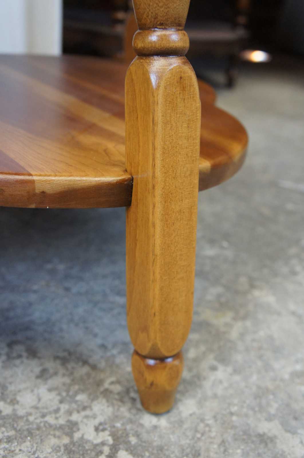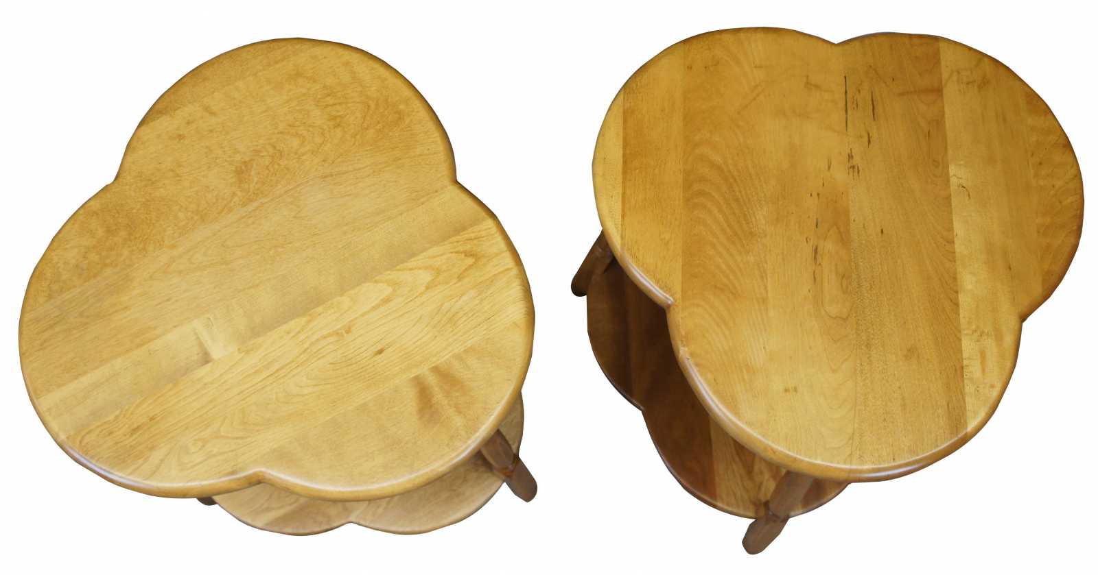 Two handmade trefoil tables. Features a trefoil top and lower shelf, supported by turned spindle legs. Made from Birch.