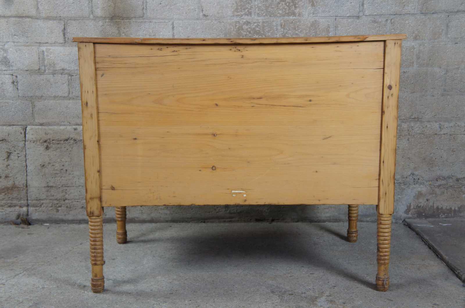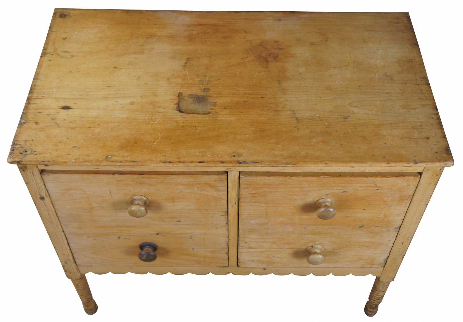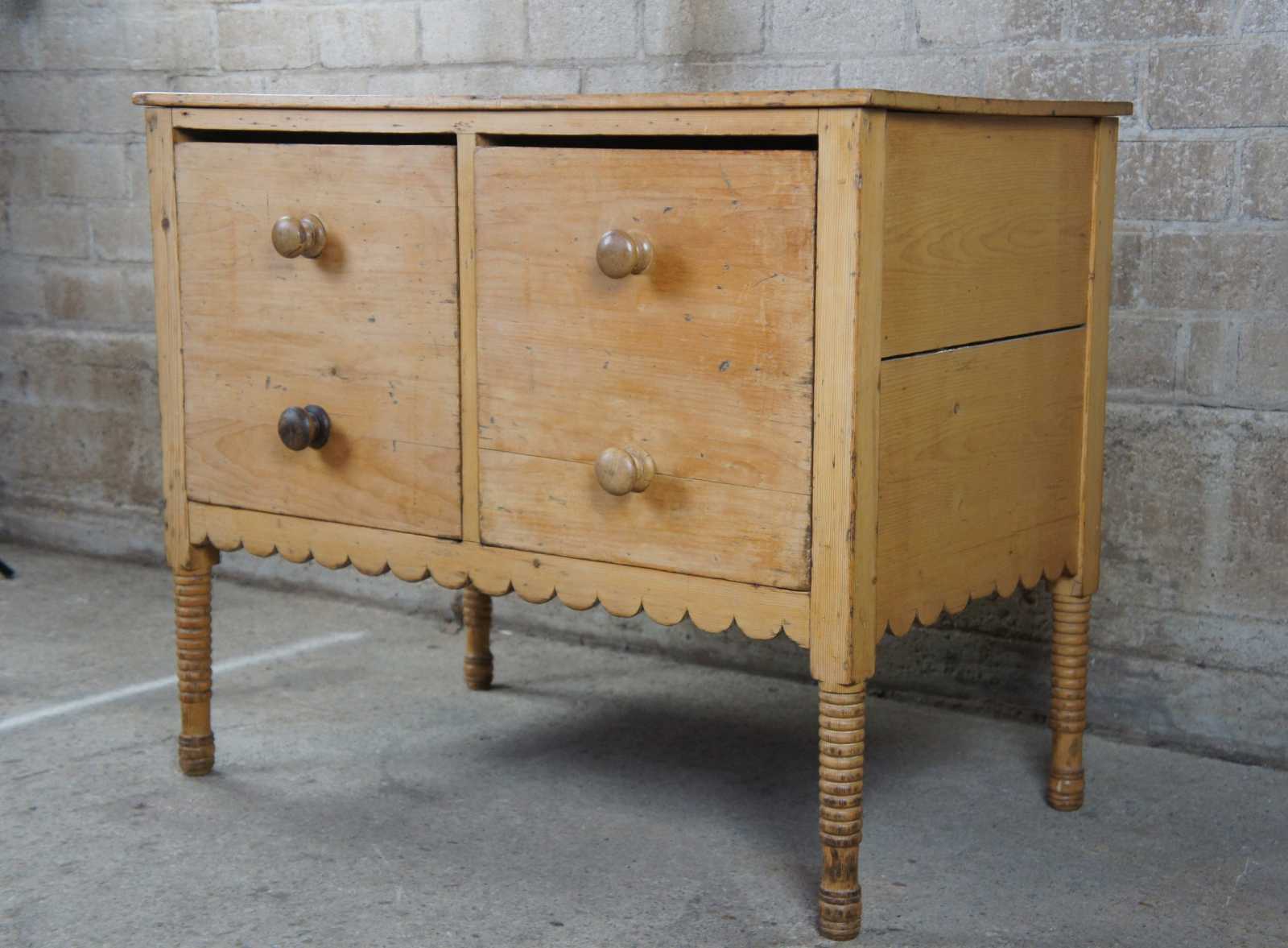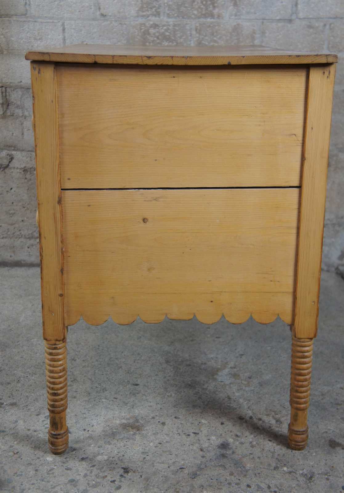Antique 19th century early American pine chest. Features two large hand dovetailed drawers making for perfect use as a dough bin slash box. Includes carved aprons and ribbed legs.