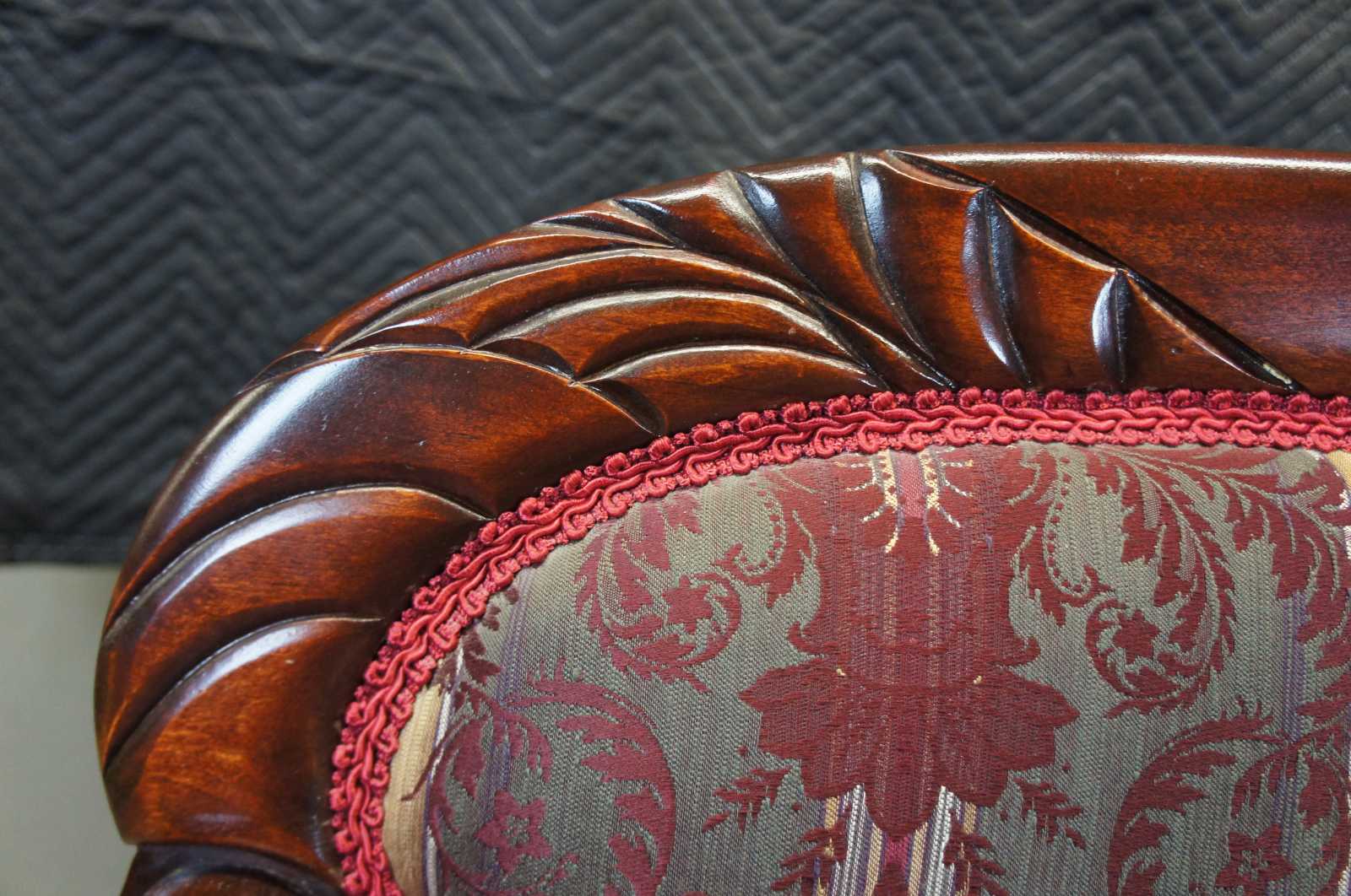 Good antique condition, some light wear to the coording, some stains to back bottom of wood frame on settee, round pillow not fully upholstered on back side, general wear from use and age, see pictures.