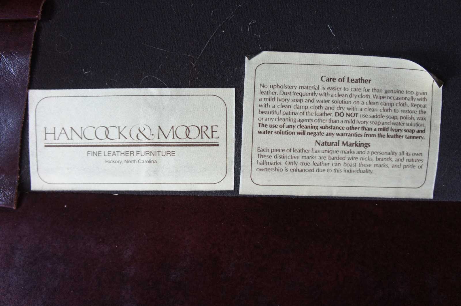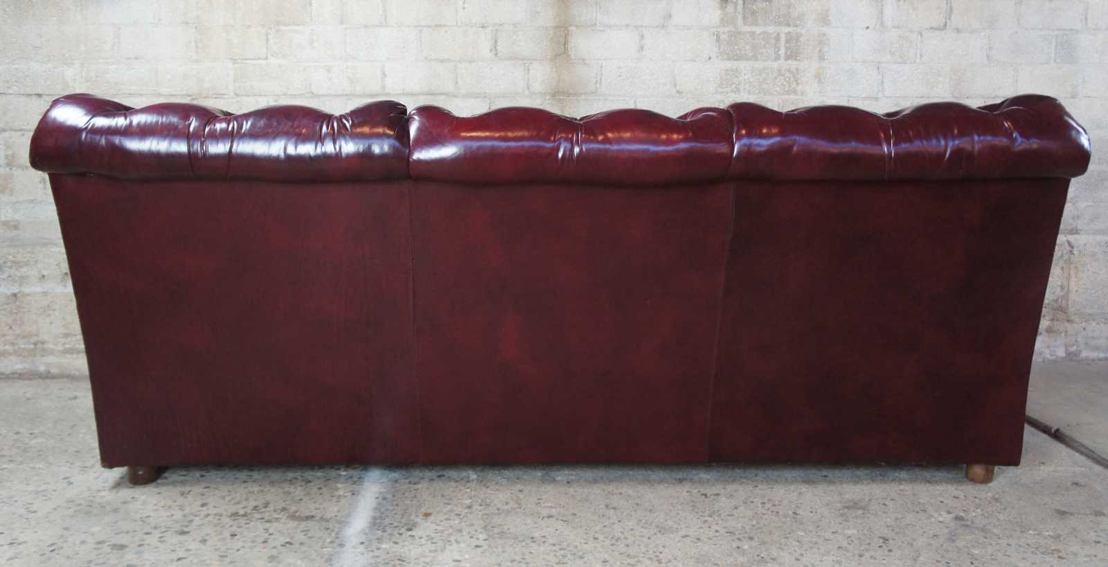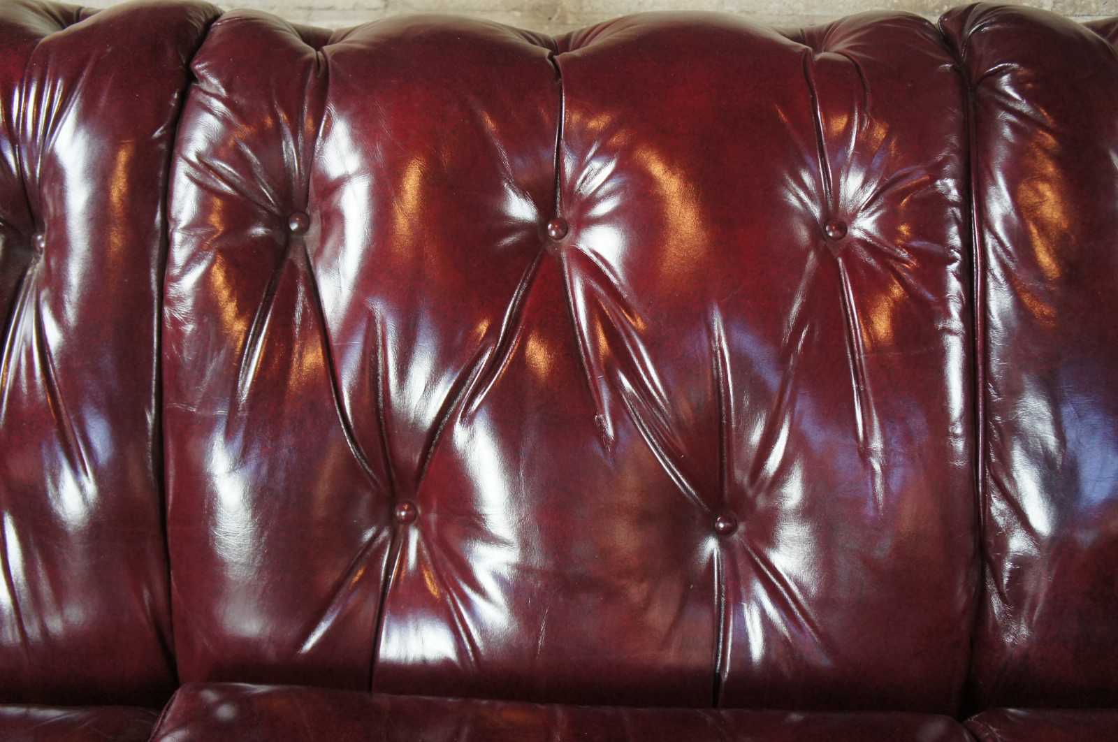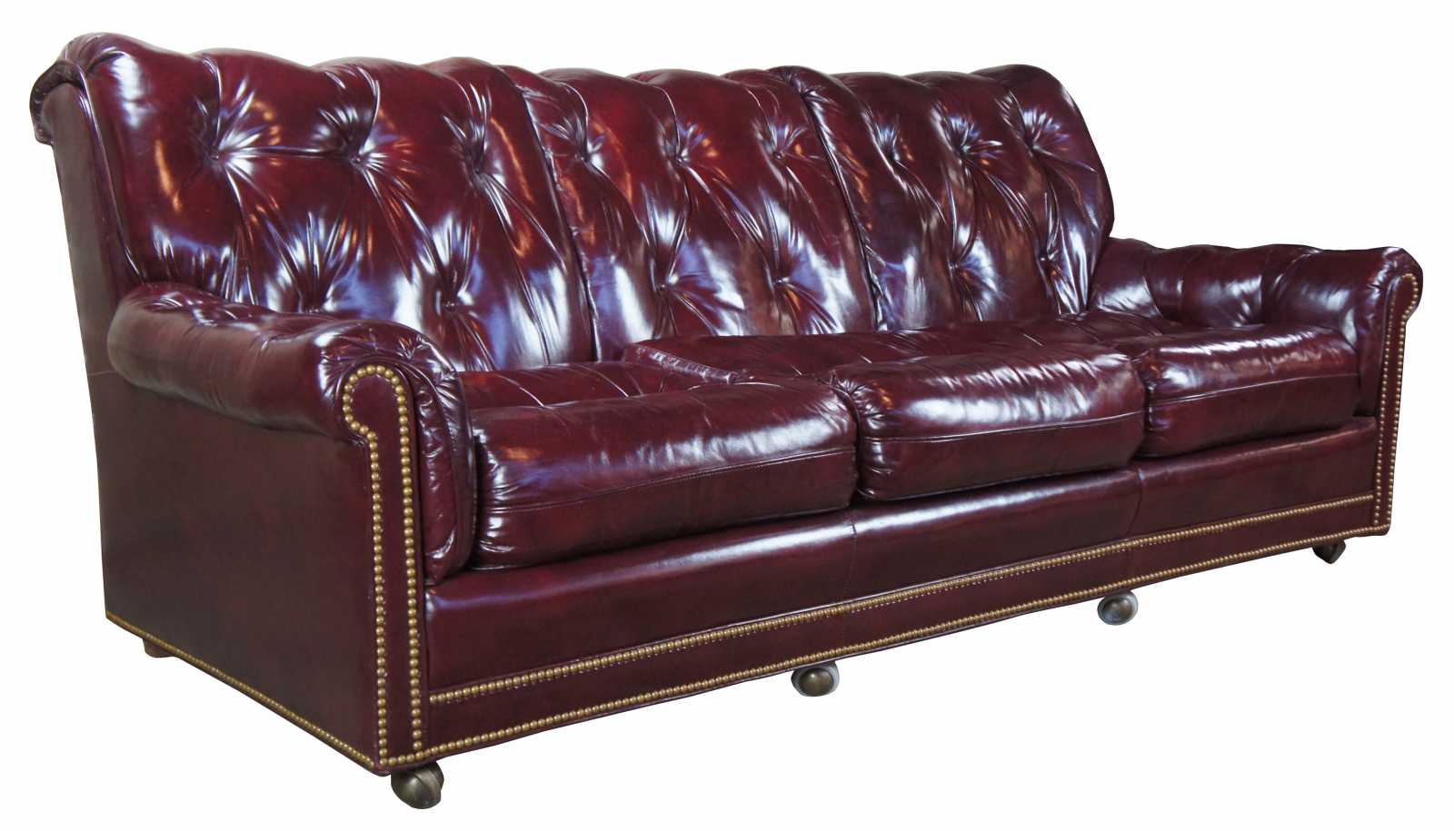 Vintage Hancock & Moore topgrain leather sofa. Features a burgundy or dark red tufted leather and plush rolled back with brass nailhead trim. Circa 1980s. On castors for ease of movement.
