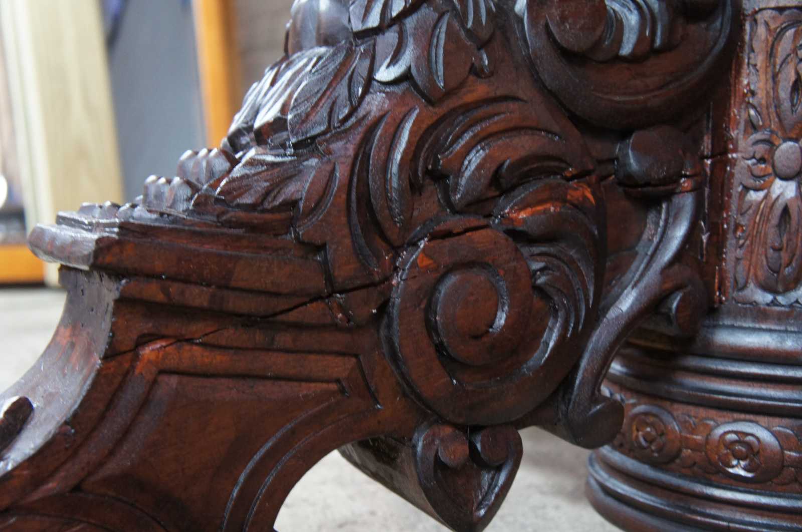 Antique Black Forest walnut dining or center or library table. Features high relief carved edge, floral cut apron and robust carved base.