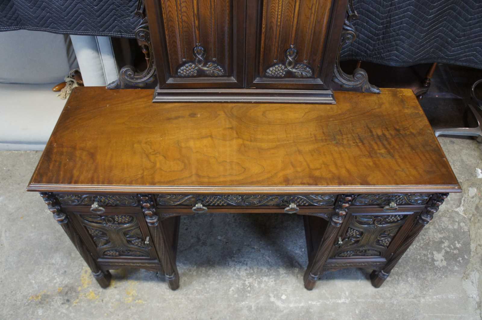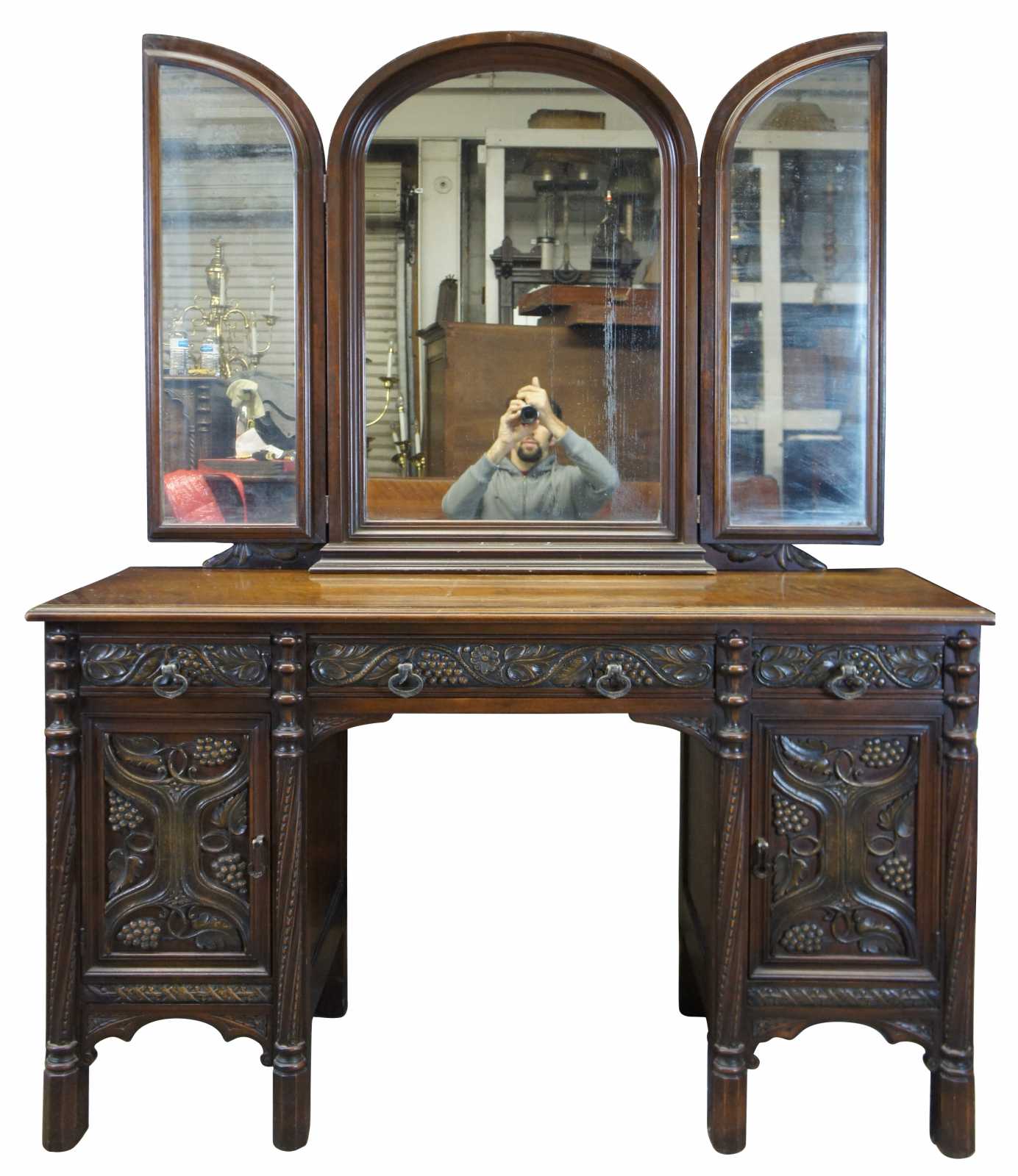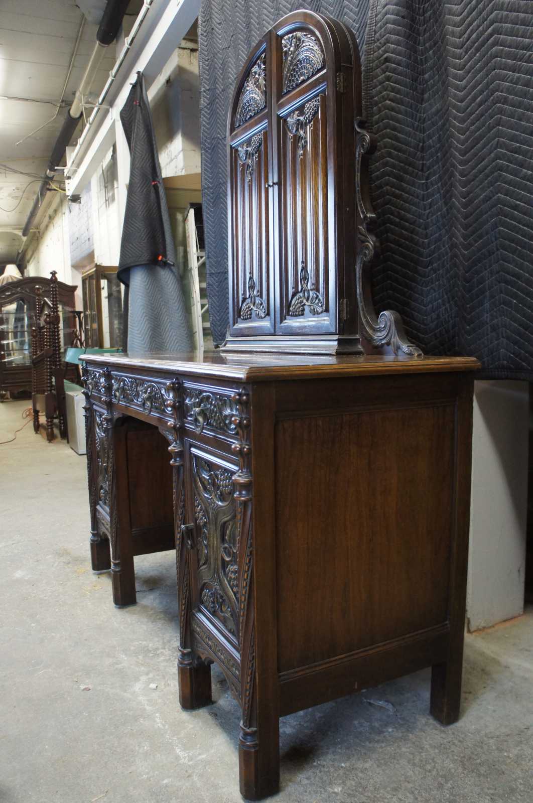 American Furniture Company Gothic or Spanish Renaissance Revival vanity desk and mirror. Operating out of Batesville Indiana since 1899, they worked closely and collaborated in part with Romweber. Specializing in high grade bedroom suites & furniture. Made from American Walnut with low relief floral carvings, Gothic arched doors that open to mirror, twisted balusters posts. Includes three drawers over lower cabinets. Circa 1930s.