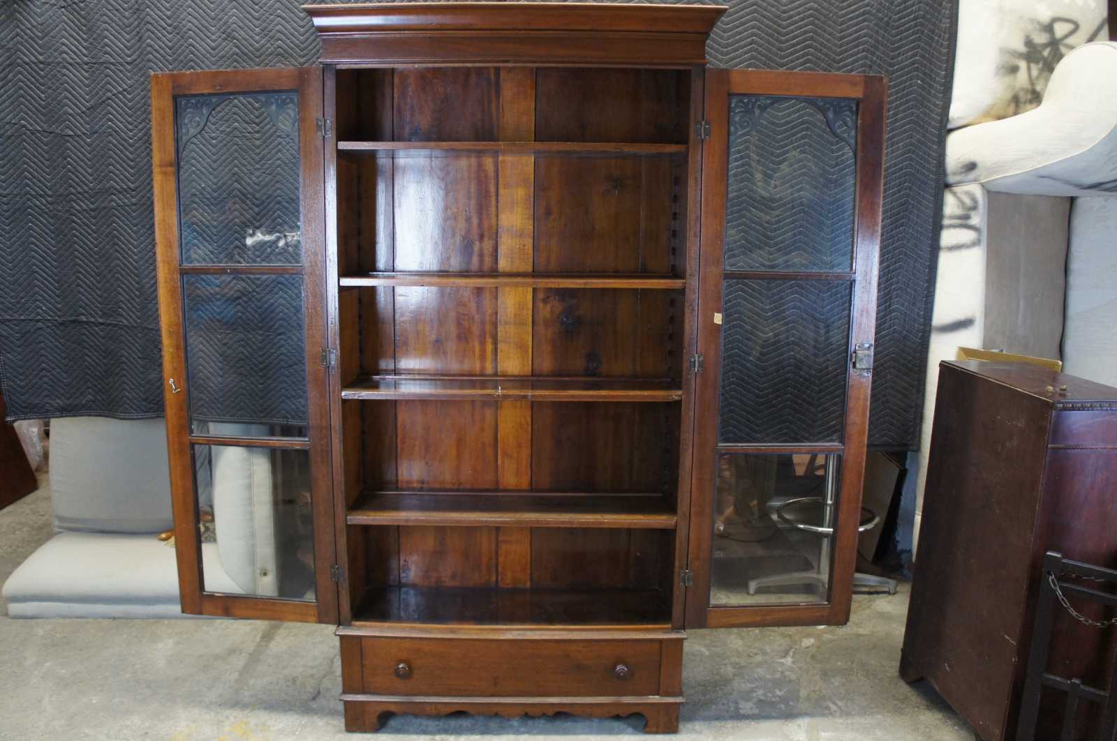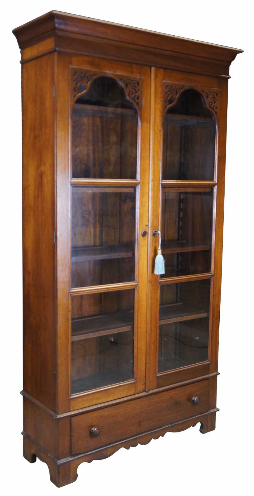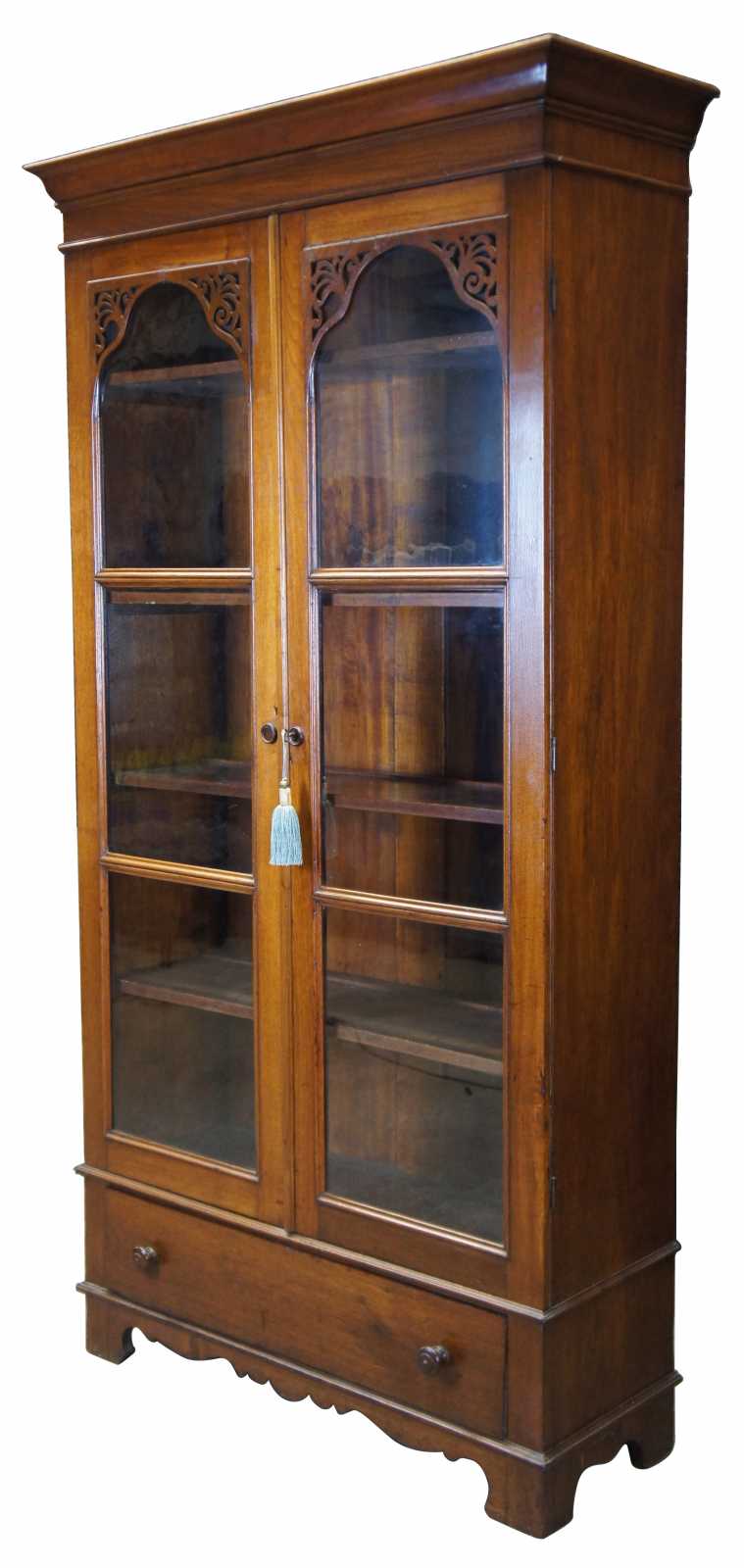 Circa 1870s Victorian china cabinet or library bookcase. Made from walnut with carved fretwork glass doors and lower drawer. The cabinet opens to four adjustable shelves and can be locked with key.