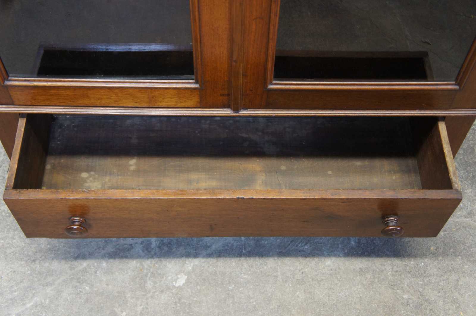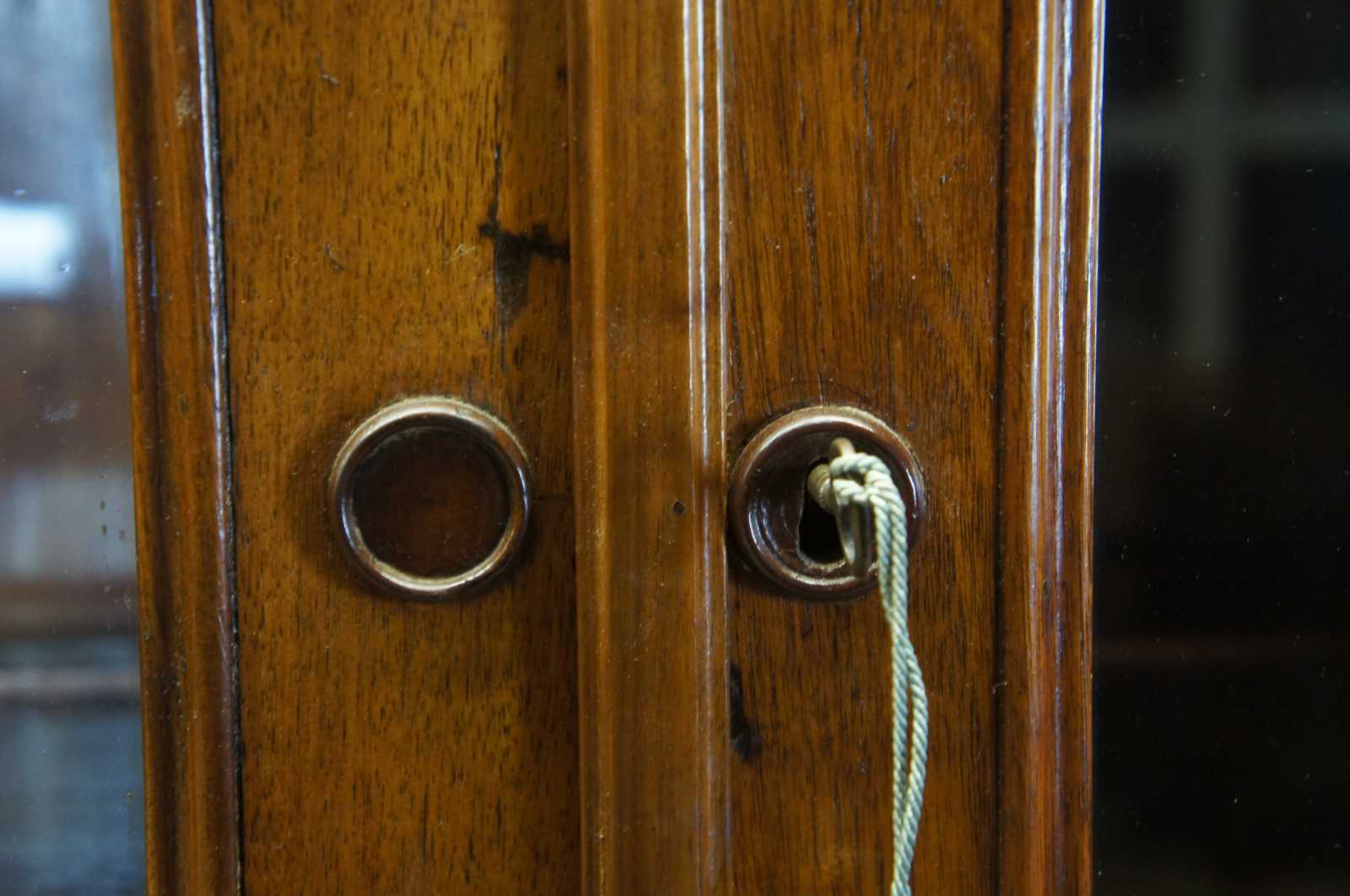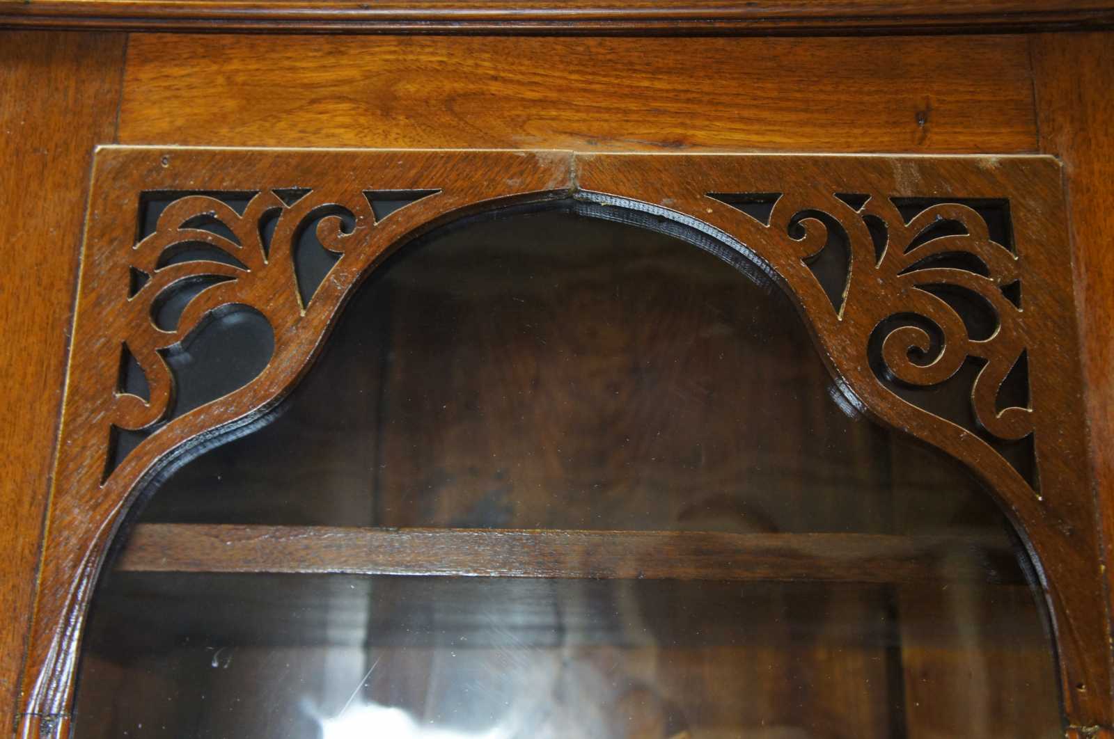 Circa 1870s Victorian china cabinet or library bookcase. Made from walnut with carved fretwork glass doors and lower drawer. The cabinet opens to four adjustable shelves and can be locked with key.