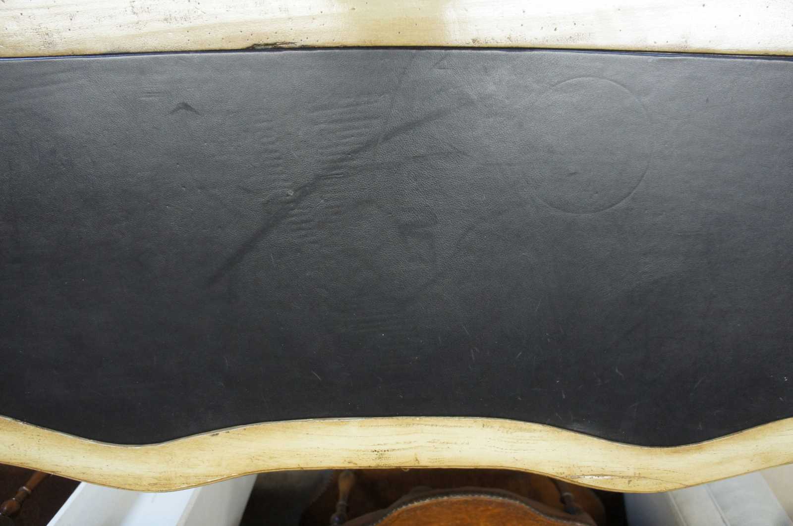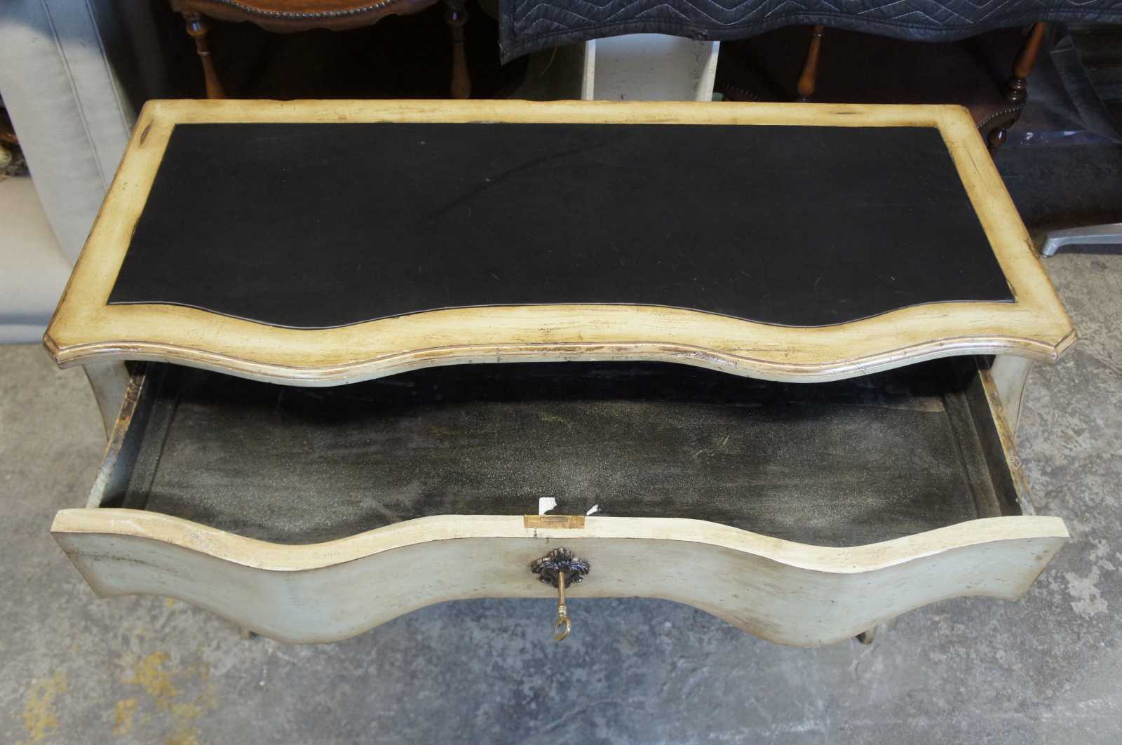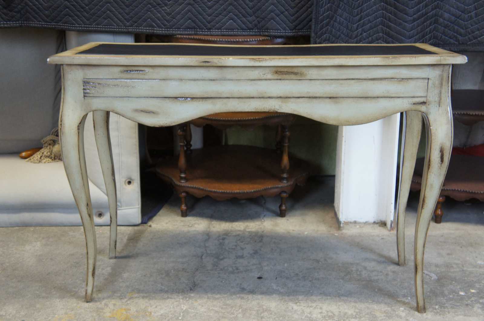 20th century reproduction of a French Oxbow console table. Features a painted oak finish with distressing, inset leather top and large drawer with lock and key. The table is supported by four long cabriole legs.