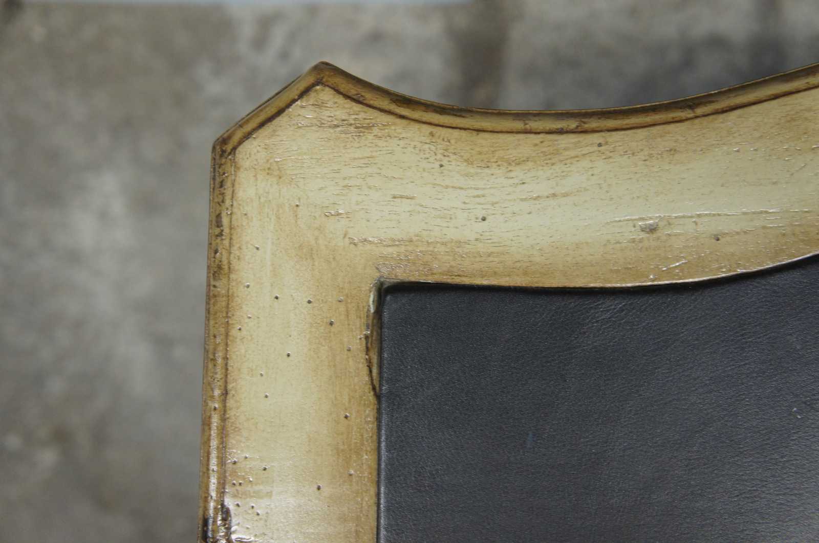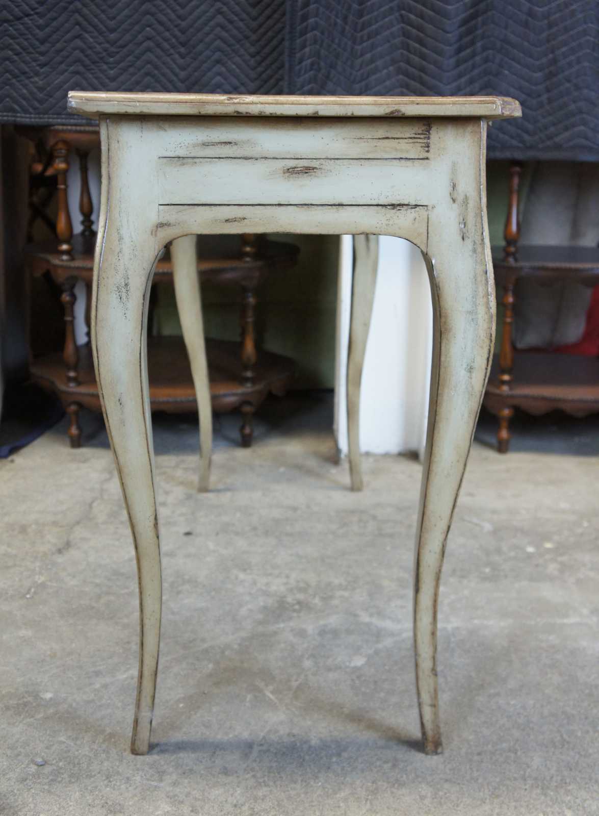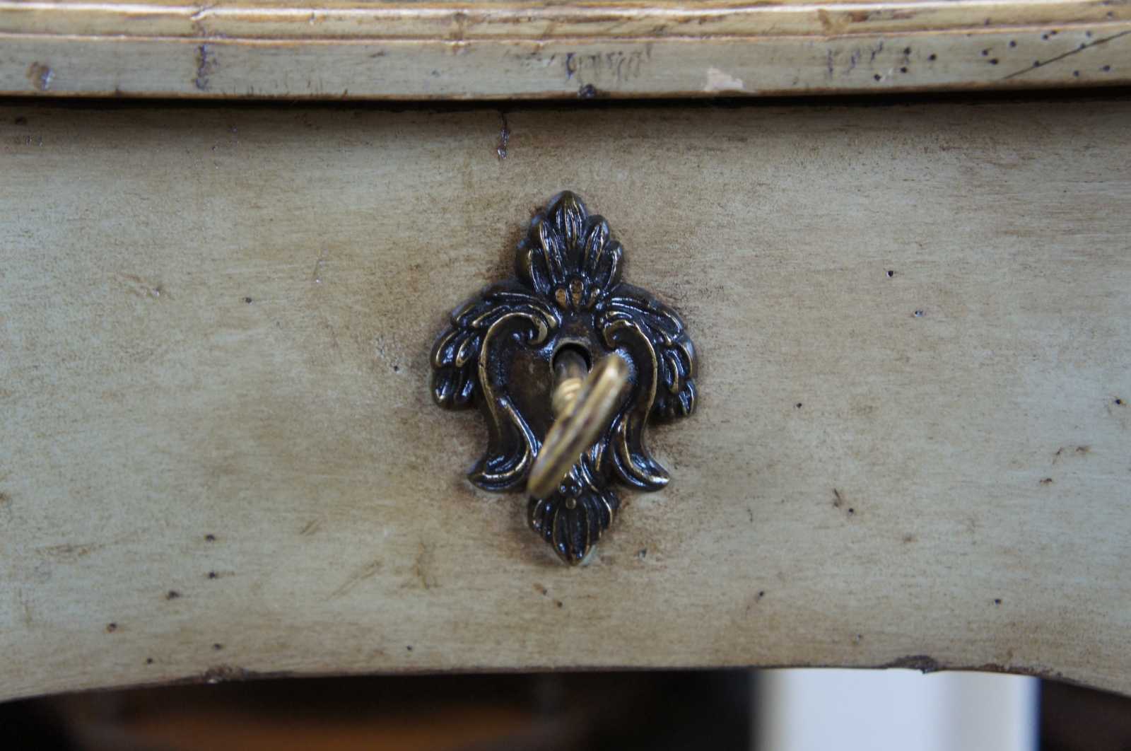 20th century reproduction of a French Oxbow console table. Features a painted oak finish with distressing, inset leather top and large drawer with lock and key. The table is supported by four long cabriole legs.