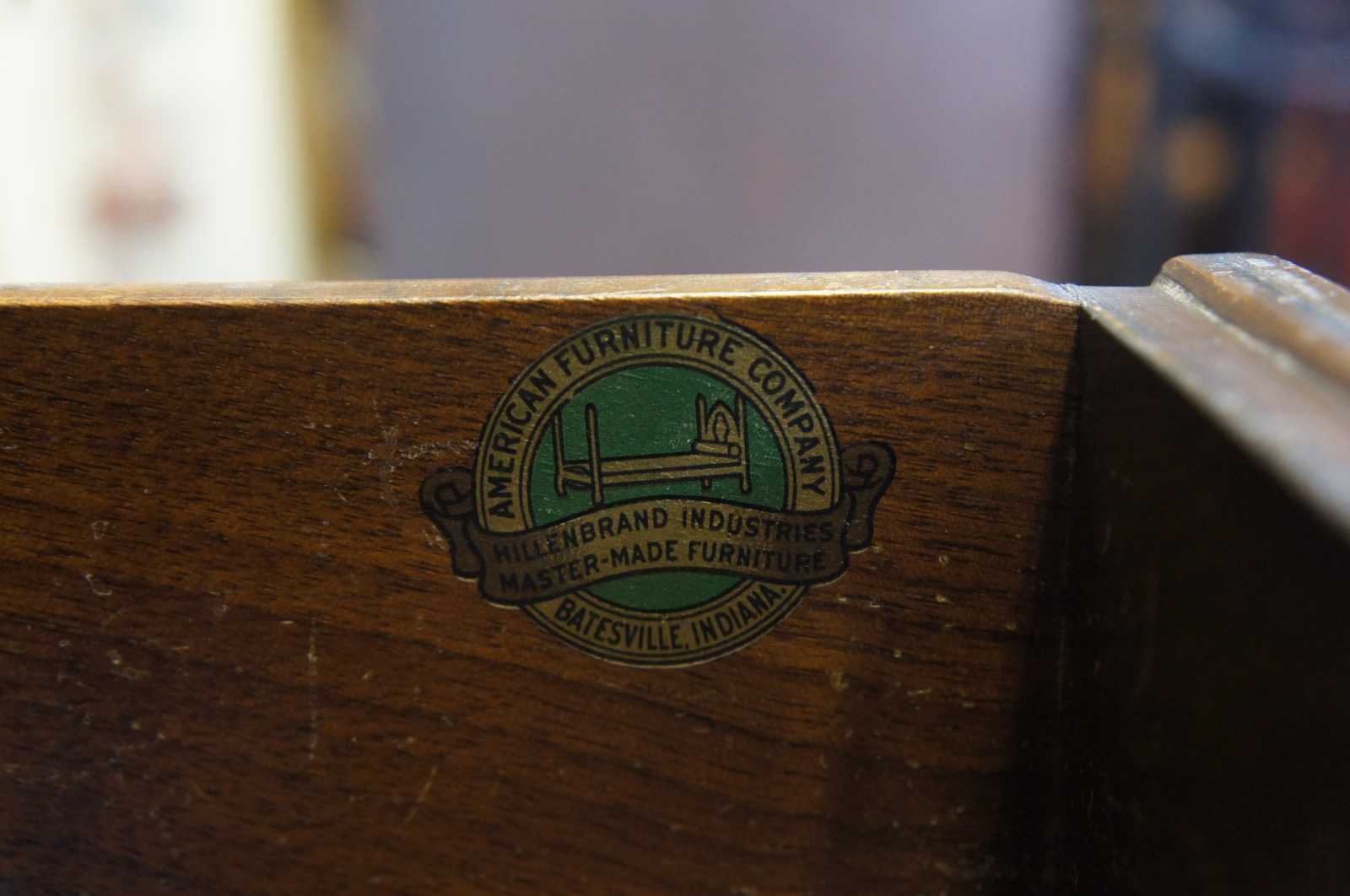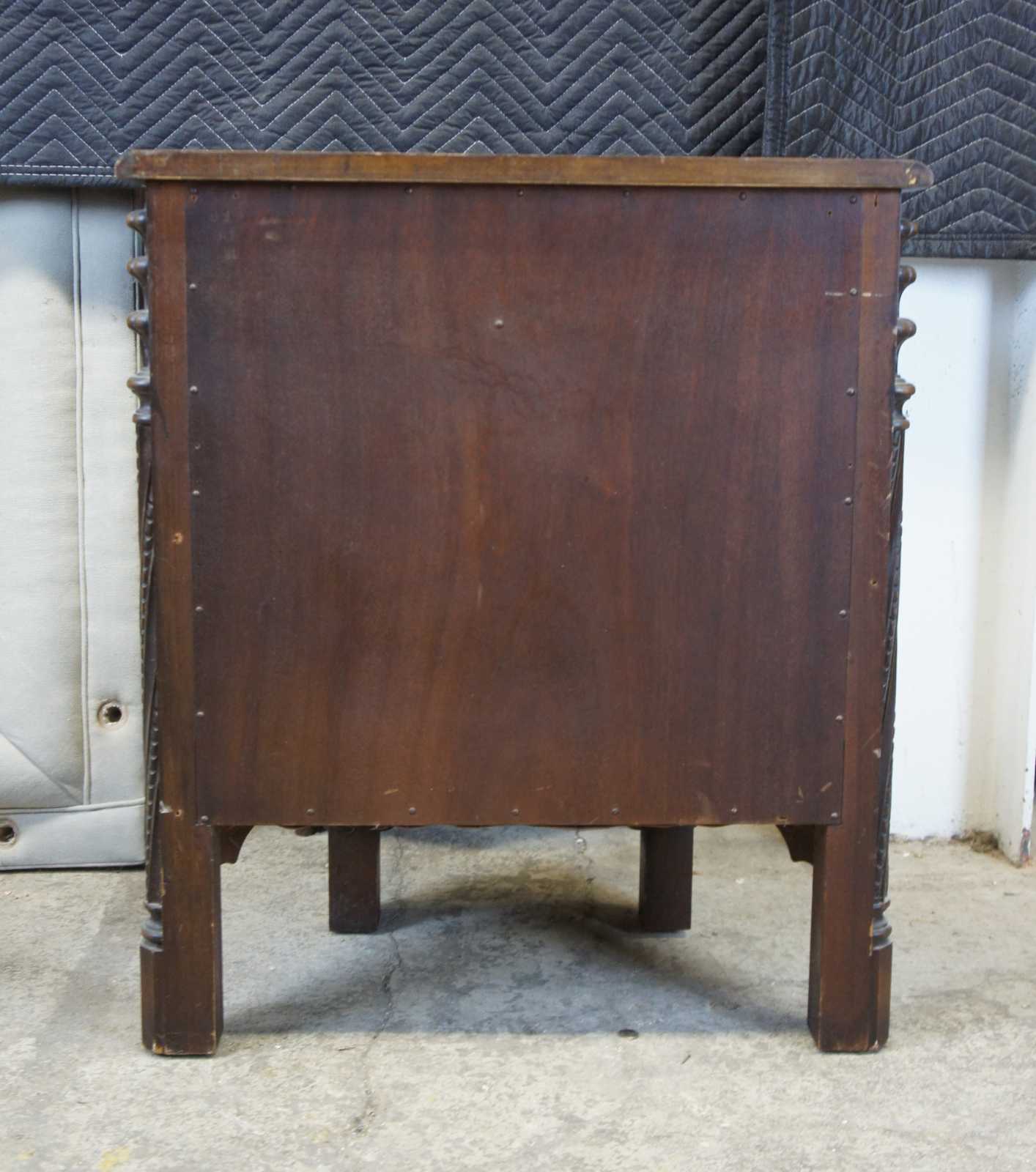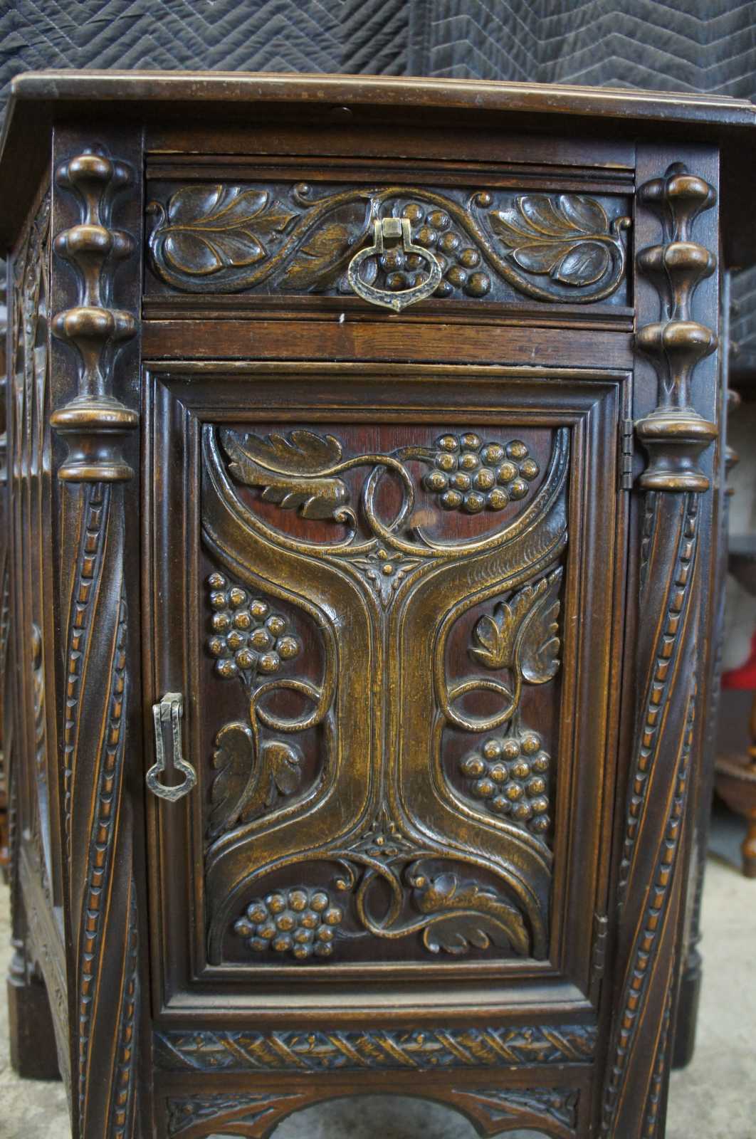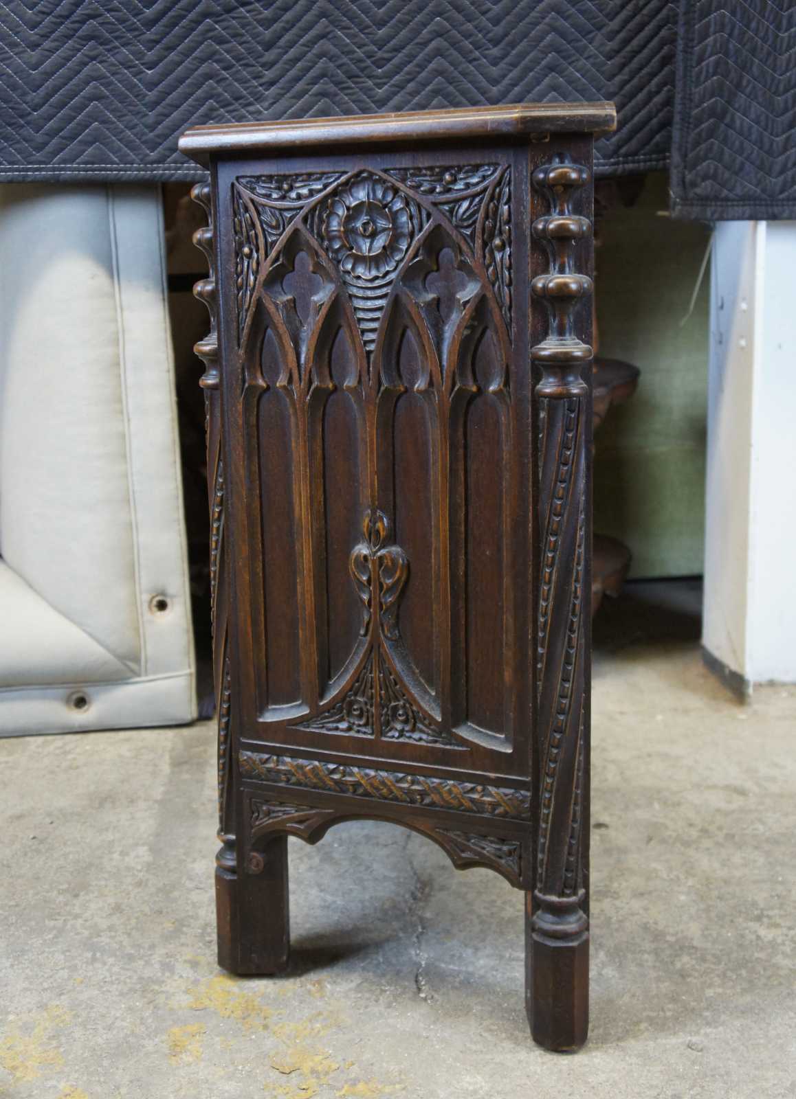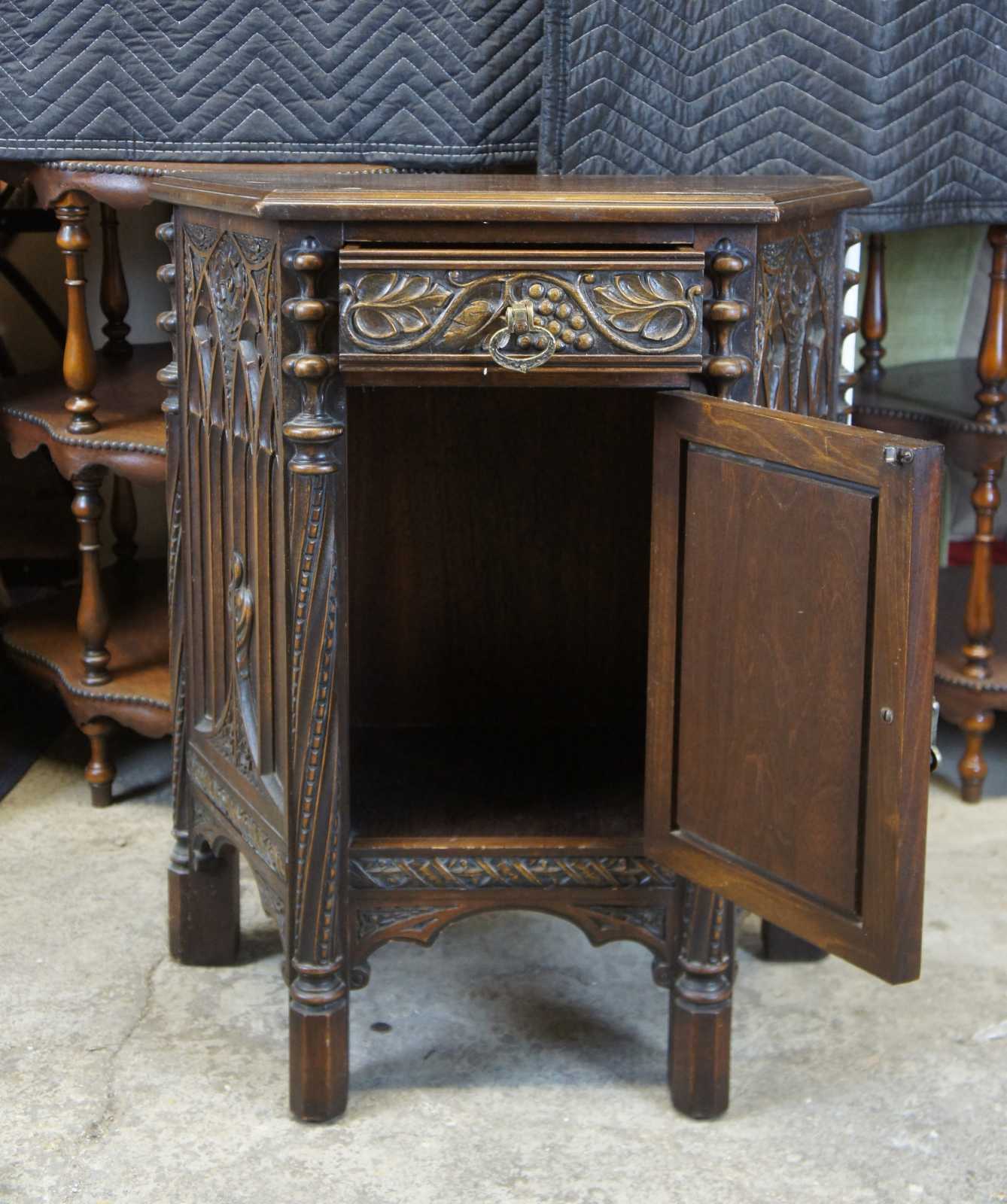 American Furniture Company Gothic or Spanish Renaissance Revival nightstand or side table. Operating out of Batesville Indiana since 1899, they worked closely and collaborated in part with Romweber. Specializing in high grade bedroom suites & furniture. Made from American Walnut with low relief carvings, Gothic arches, barley twisted posts, balusters, and includes one door and drawer. Circa 1930s.