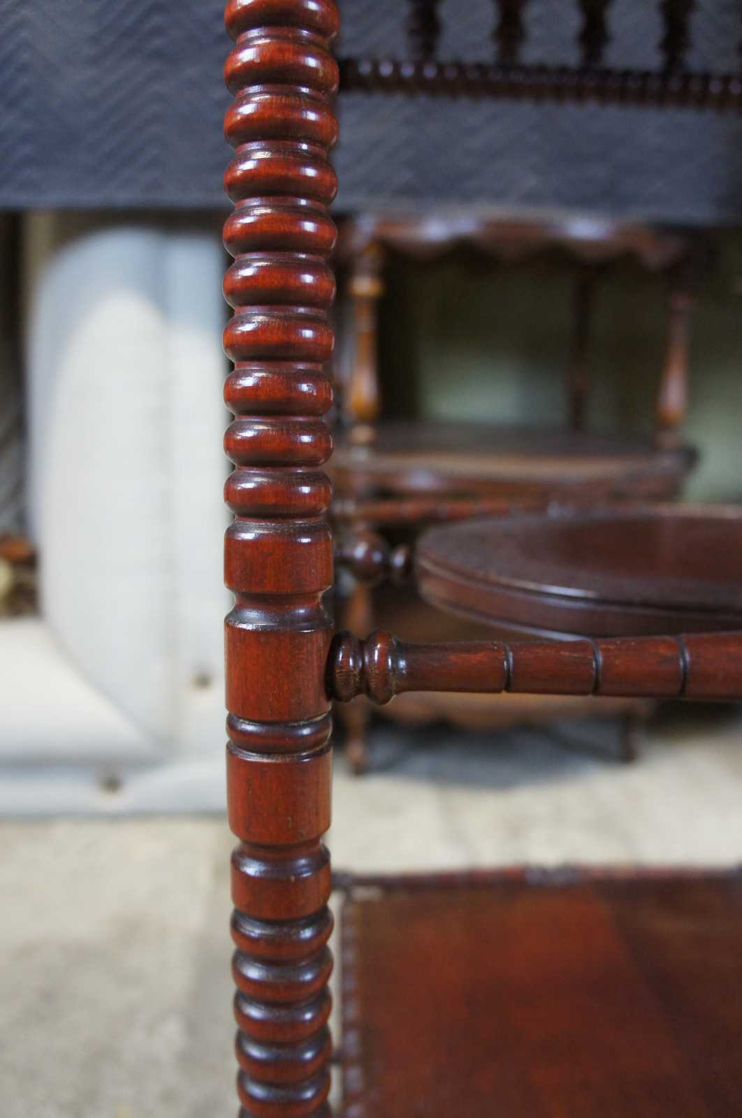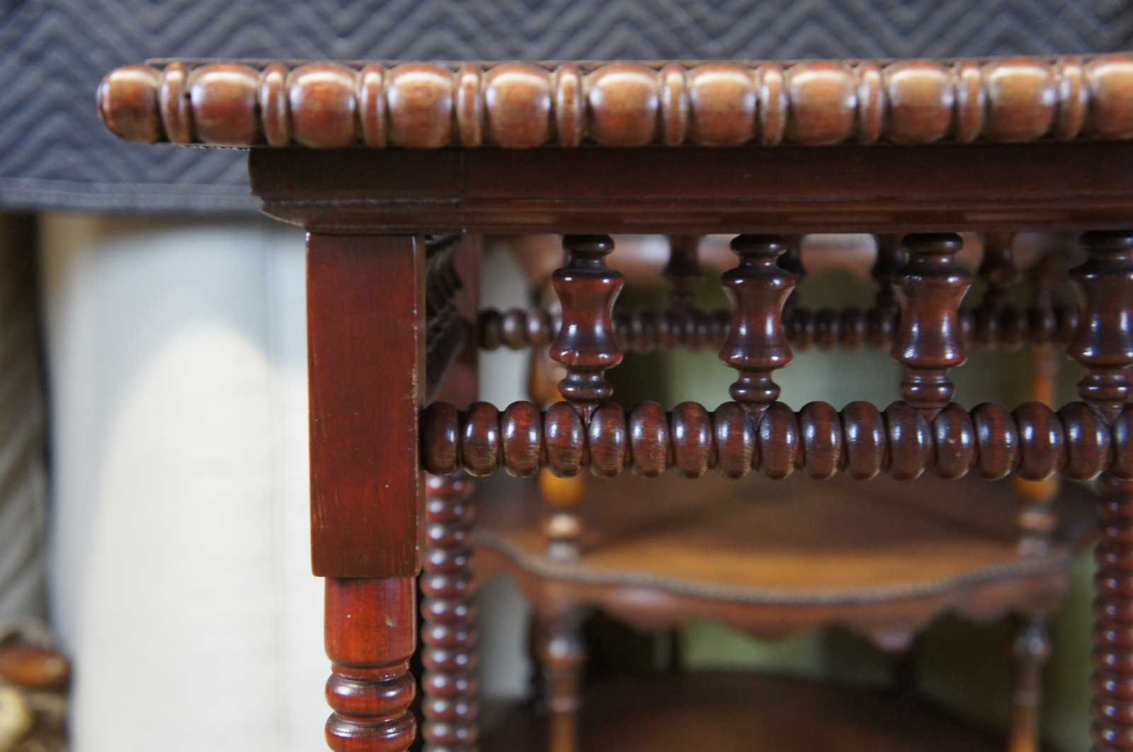 Late Victorian mahogany tiered parlor table with cherry finish. Features spooled legs and beaded apron.