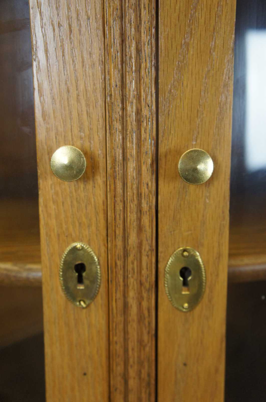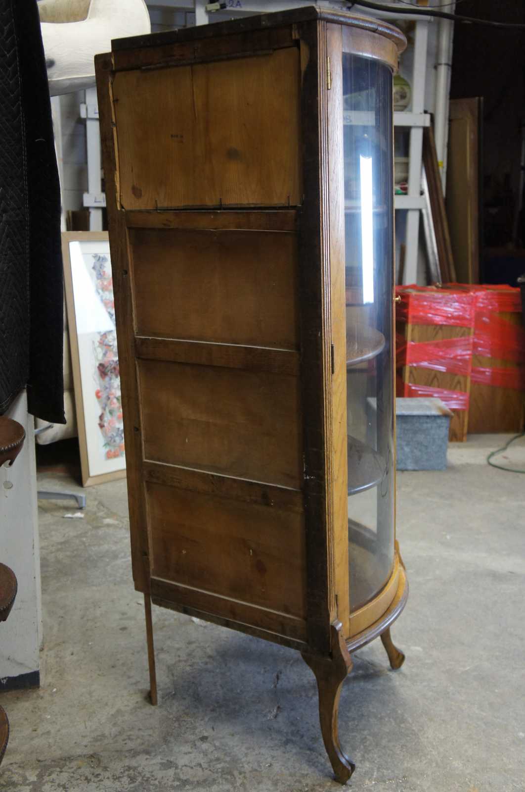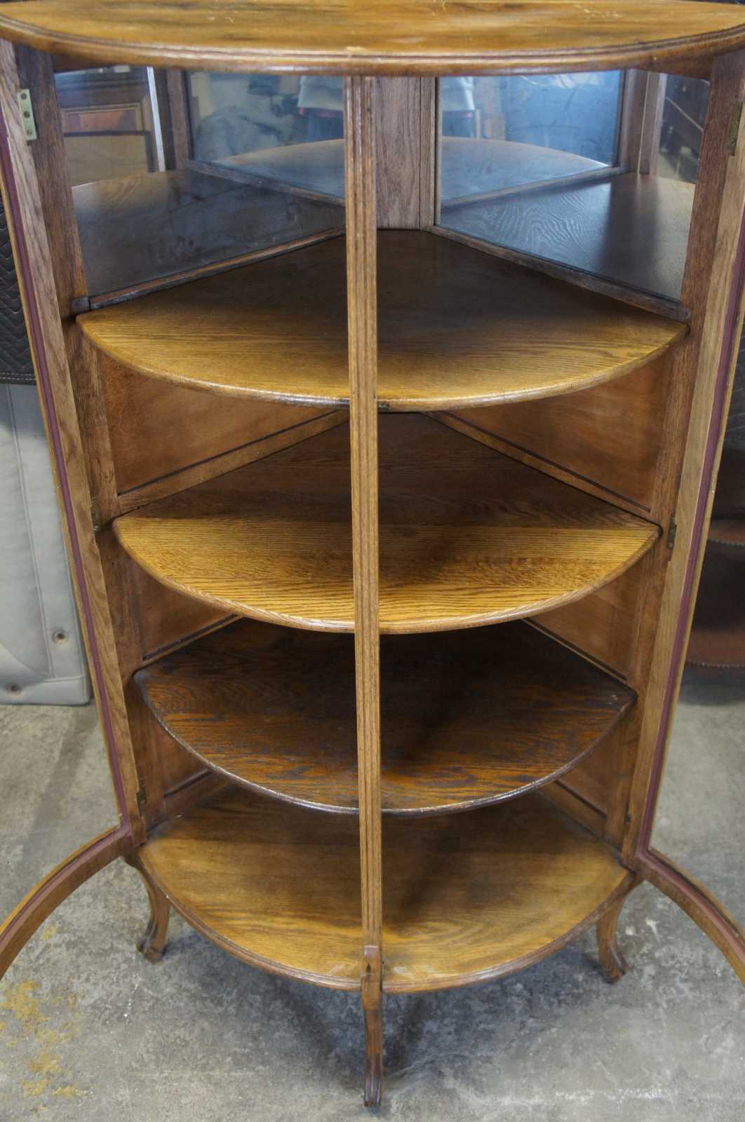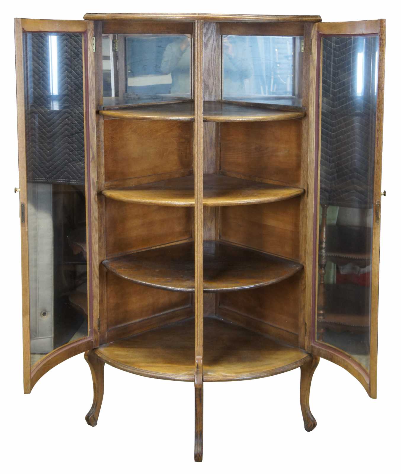 Early 20th century Canadian oak corner curio cabinet. Features three shelves and two mirrors behind doors. Made in Canada.
