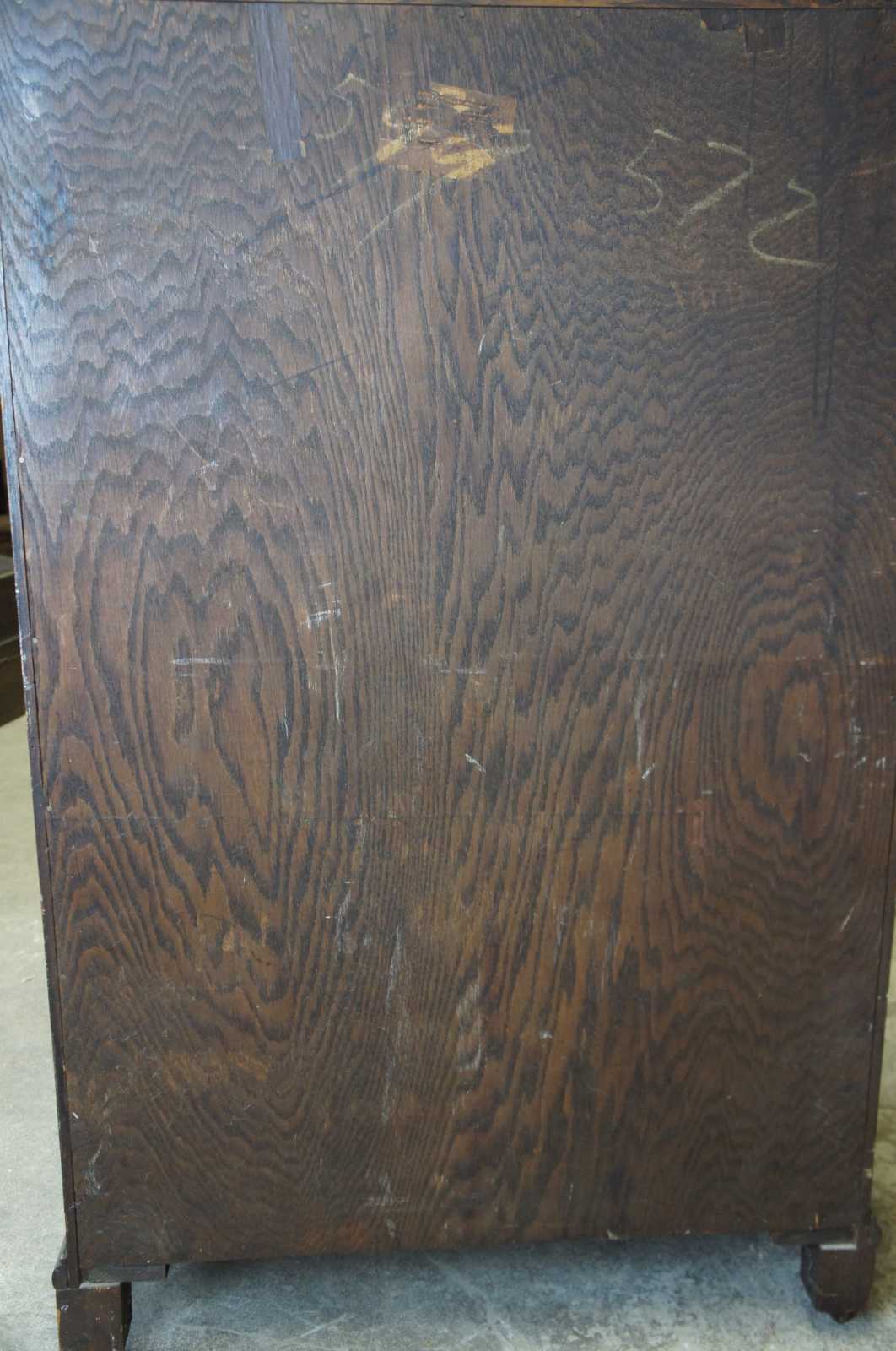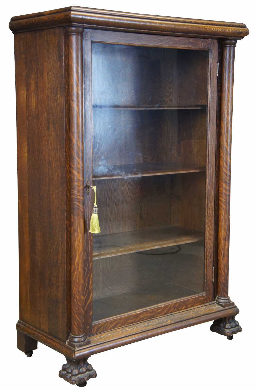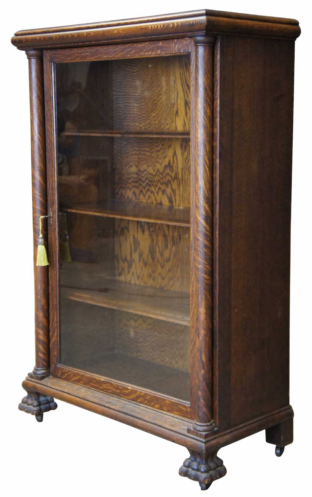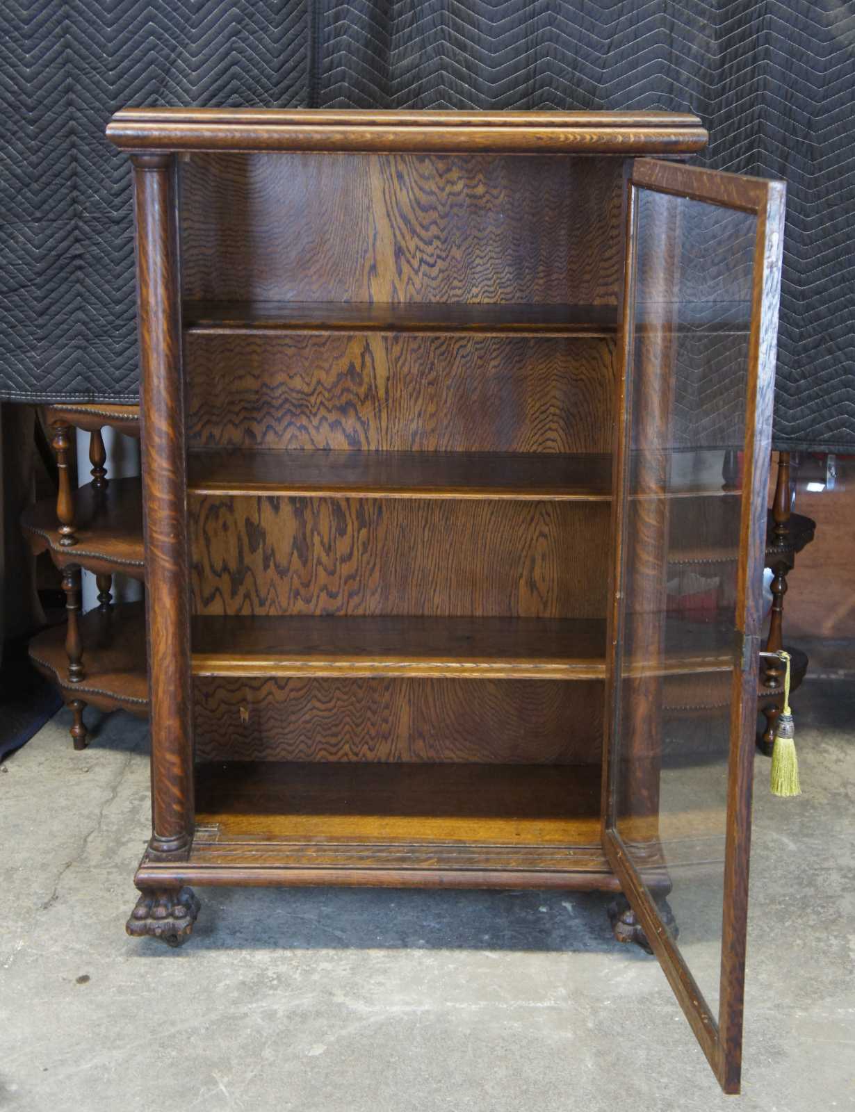 Turn of the 20th century American Empire display cabinet or bookcase. Made from quartersawn "tiger" oak with two columns along the front leading to paw feet. Opens to three adjustable shelves.