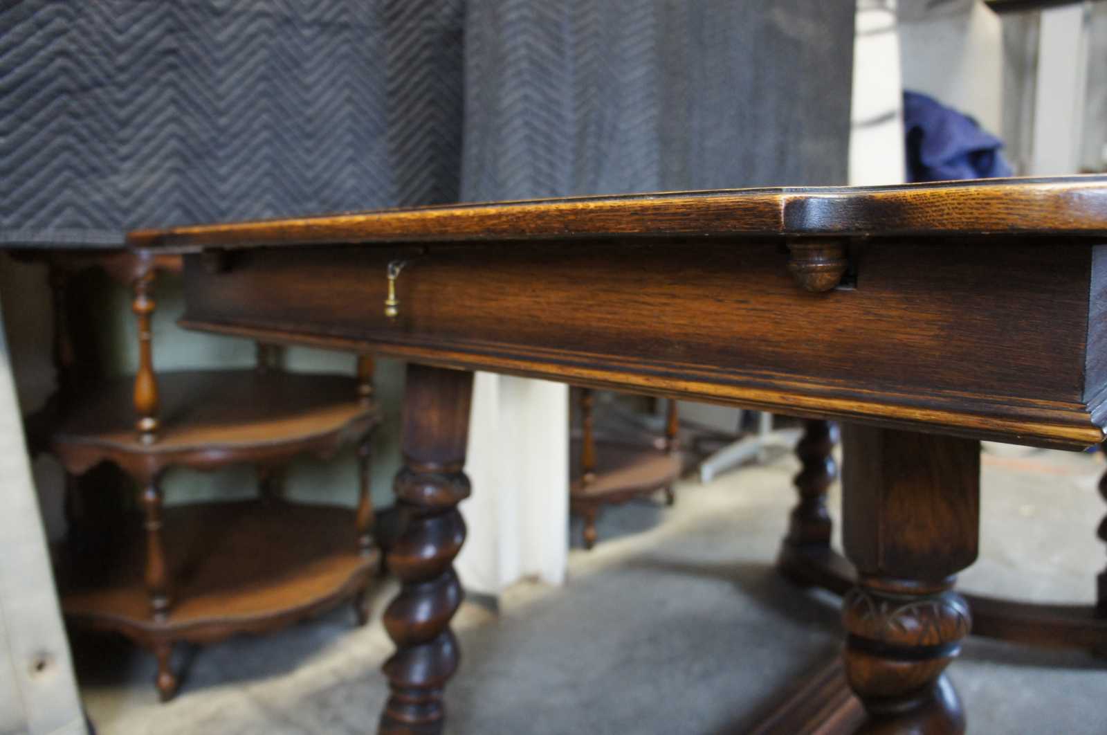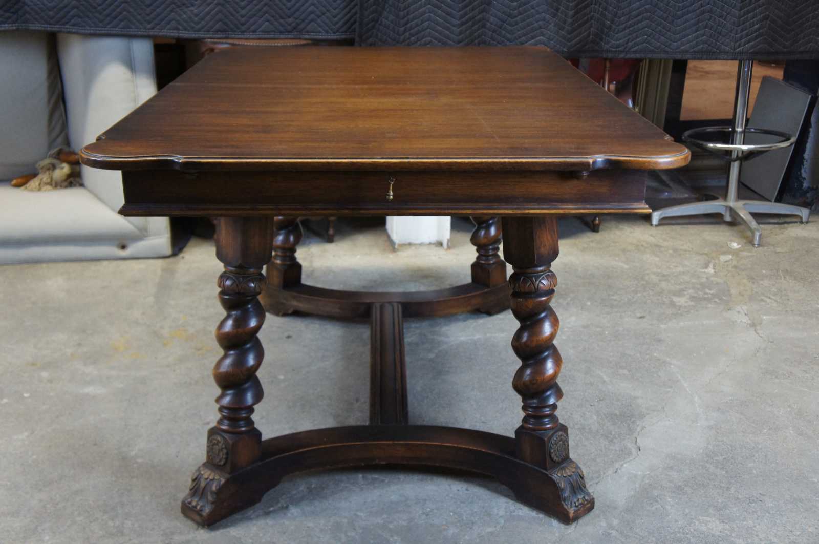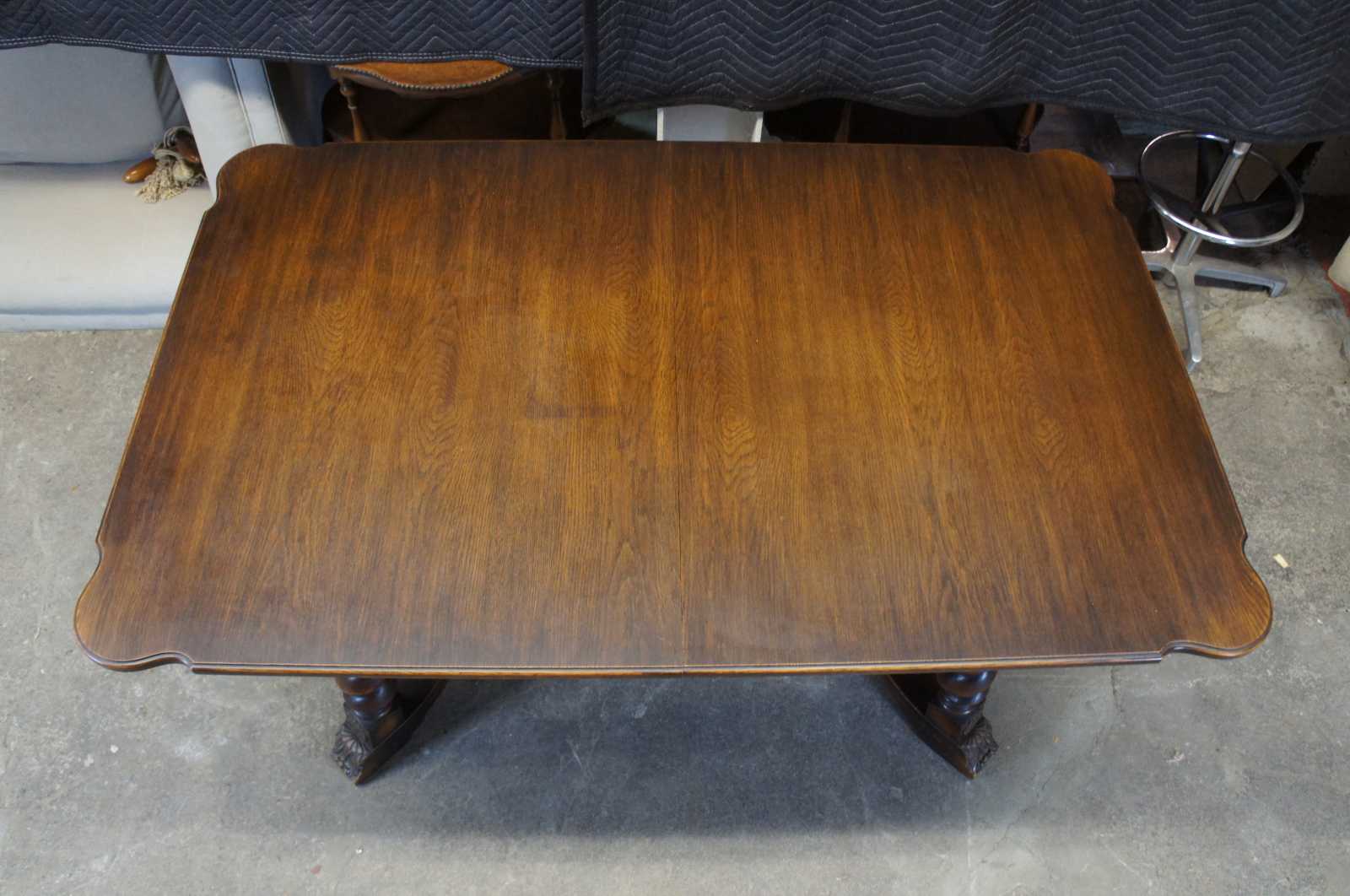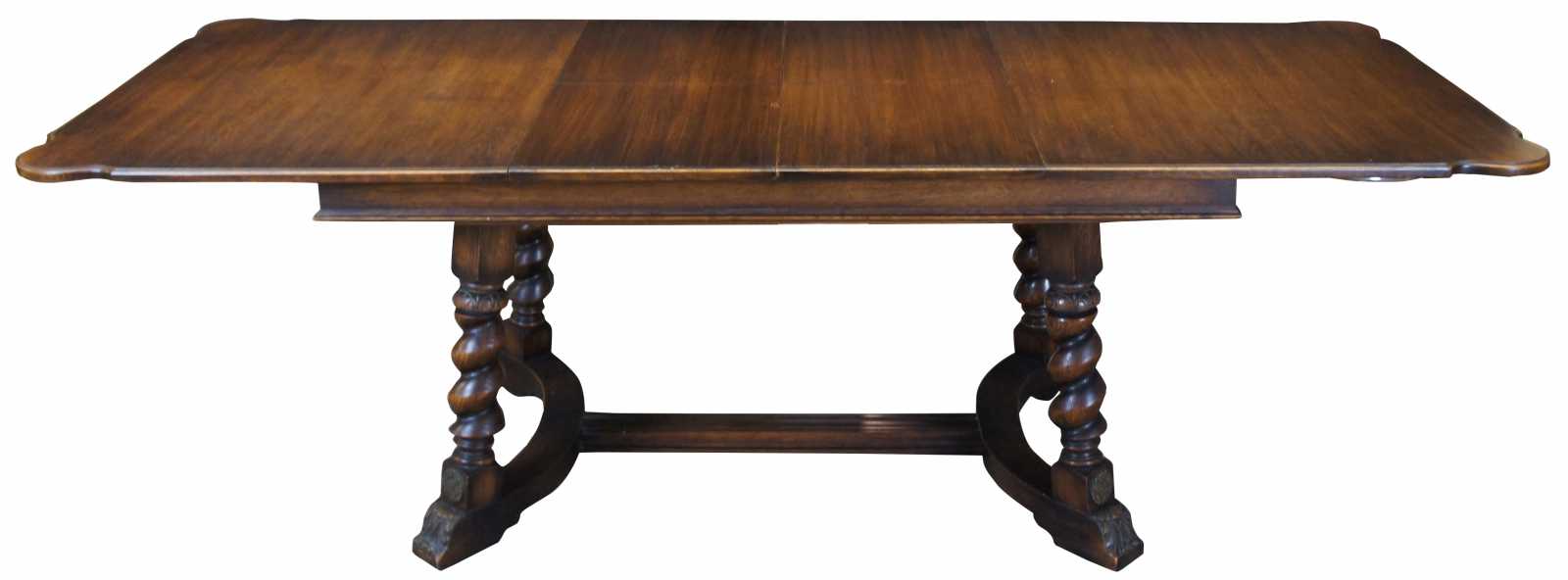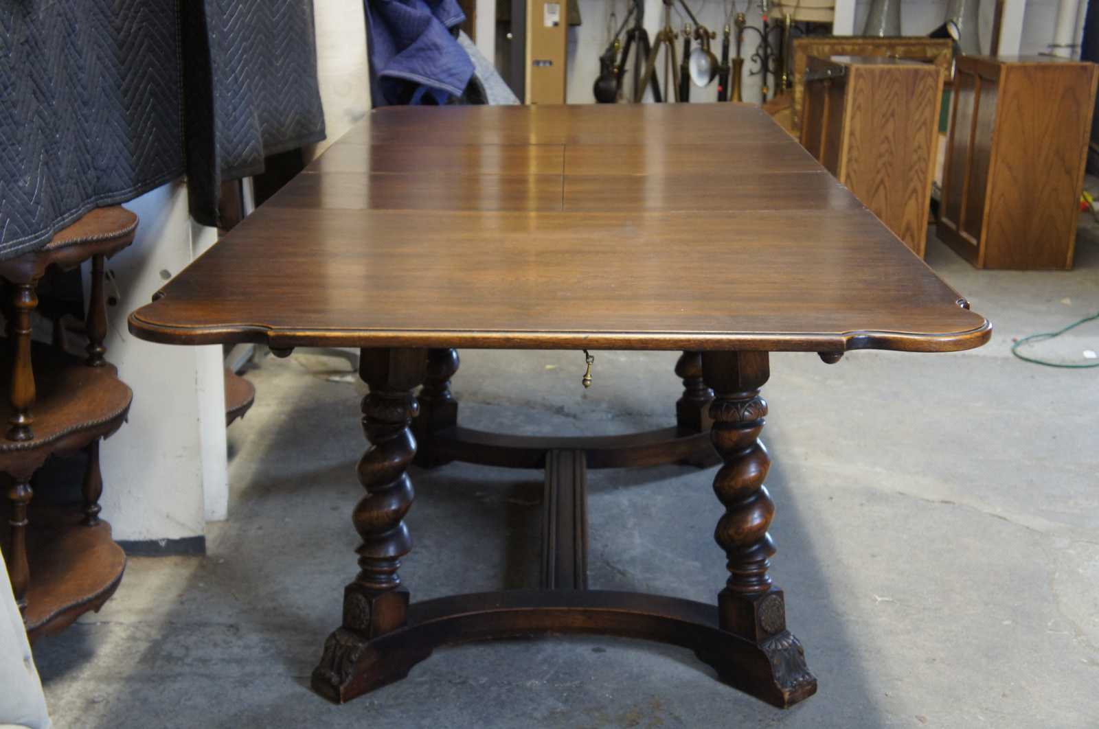 Early 20th century Jacobean inspired dining table. Made from oak with a rectangular top with rounded corners. Over four turned barley twist legs, leading to an acanthus feet connected by H stretcher / trestle base. The table expands with a unique mechanism using scissor leaves that fold out when needed. Includes table pads.