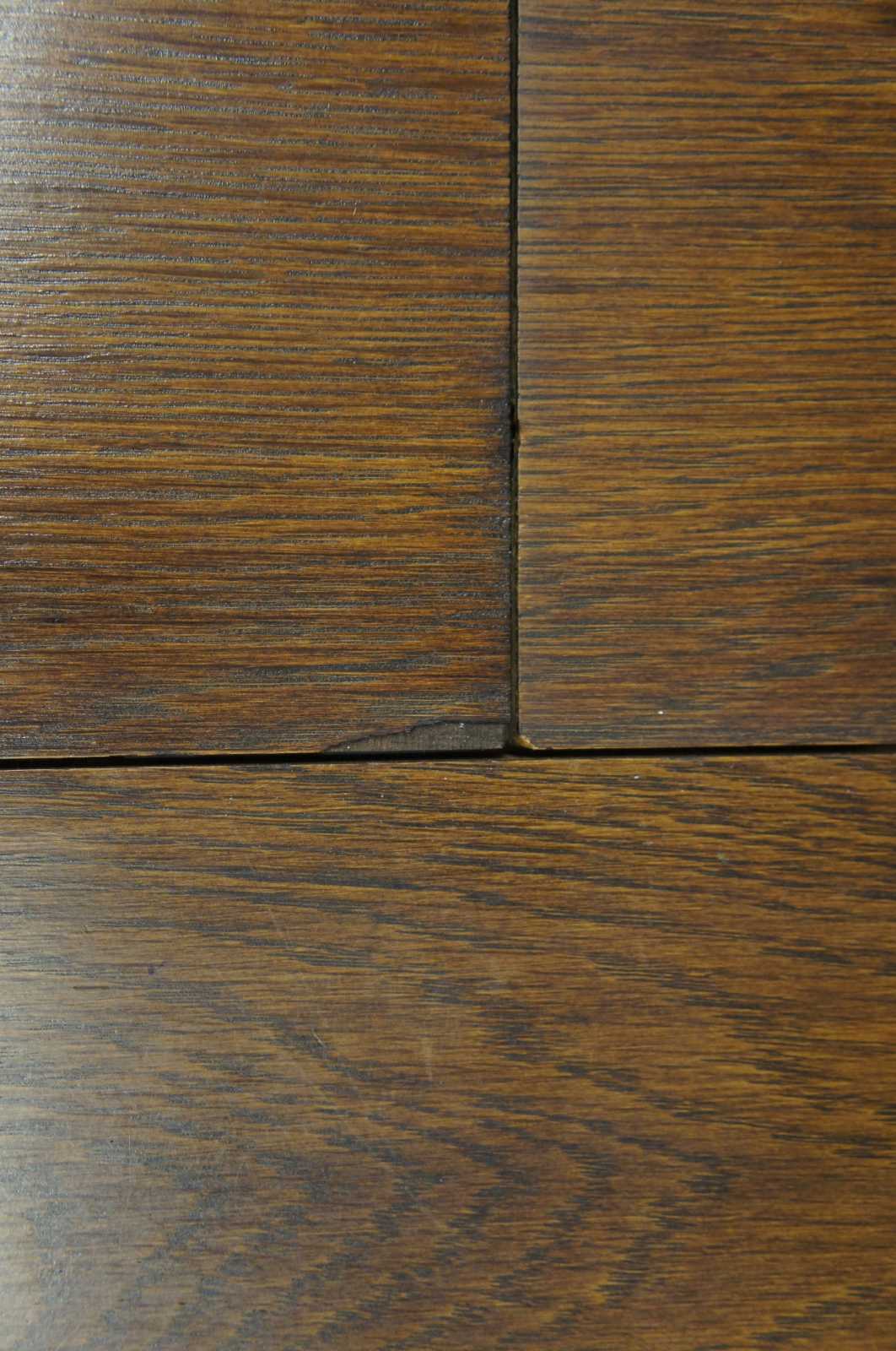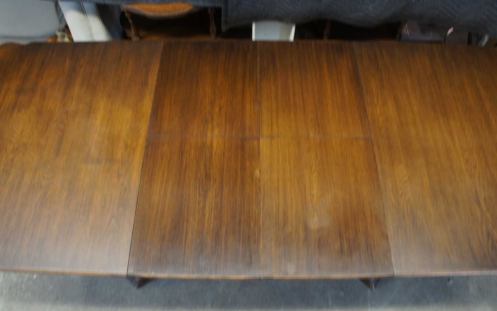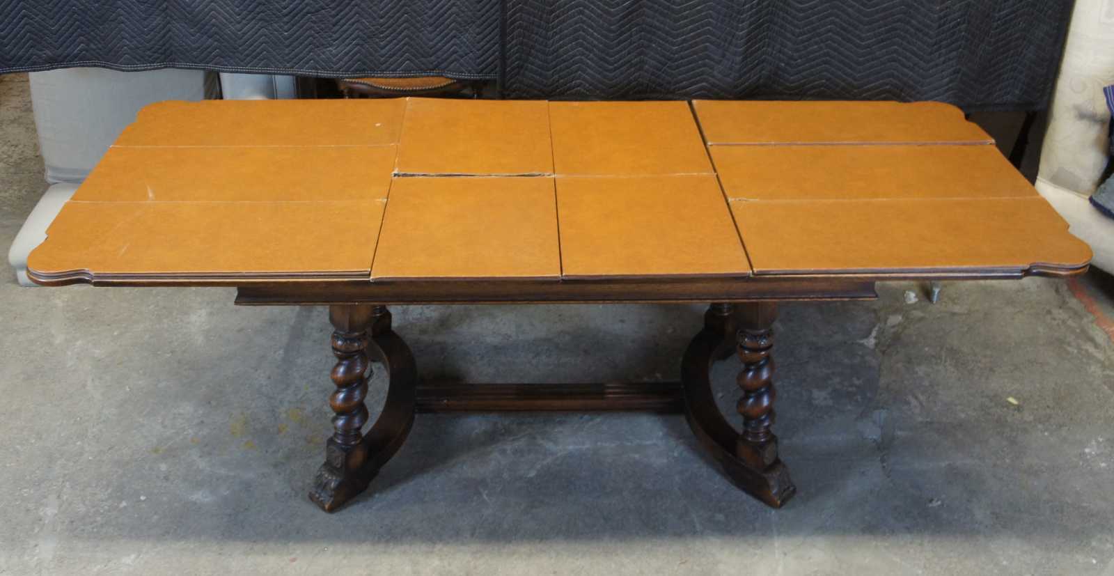 Good antique condition, leaves and table slightly different color due to fading, blemishing to table top, small veneer spot missing on corner of one scissor leaf, table pads worn, see pictures.