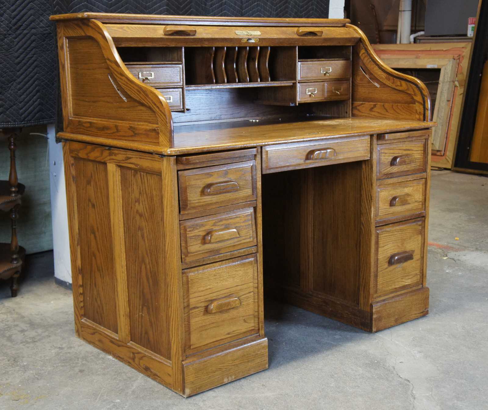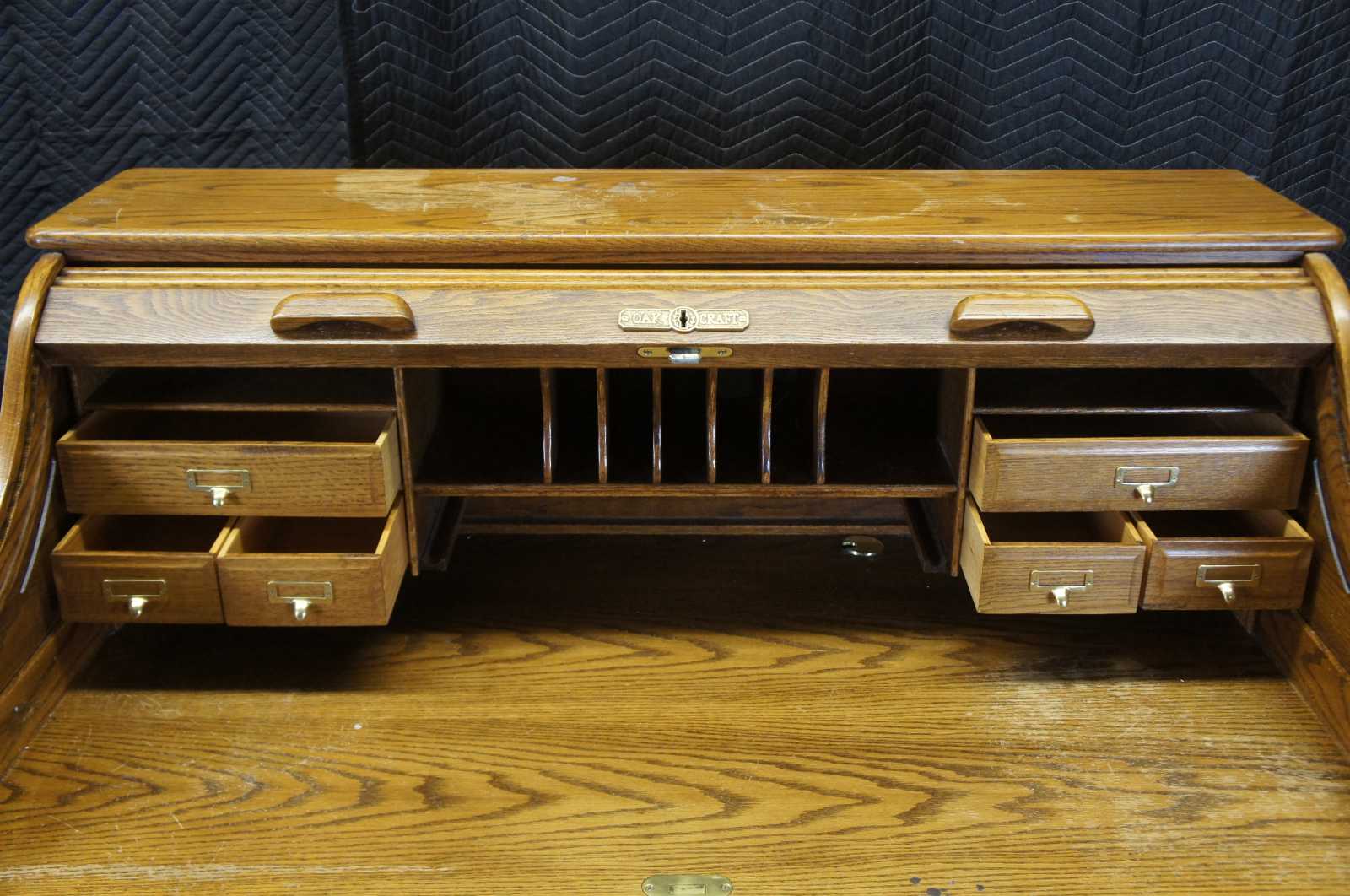 Vintage Oak Craft (Oakcraft) roll top office desk. Features a S curve roll top that opens to a work surface with cubbies for storage and six drawers. The base of the piece has several more drawers for storage.