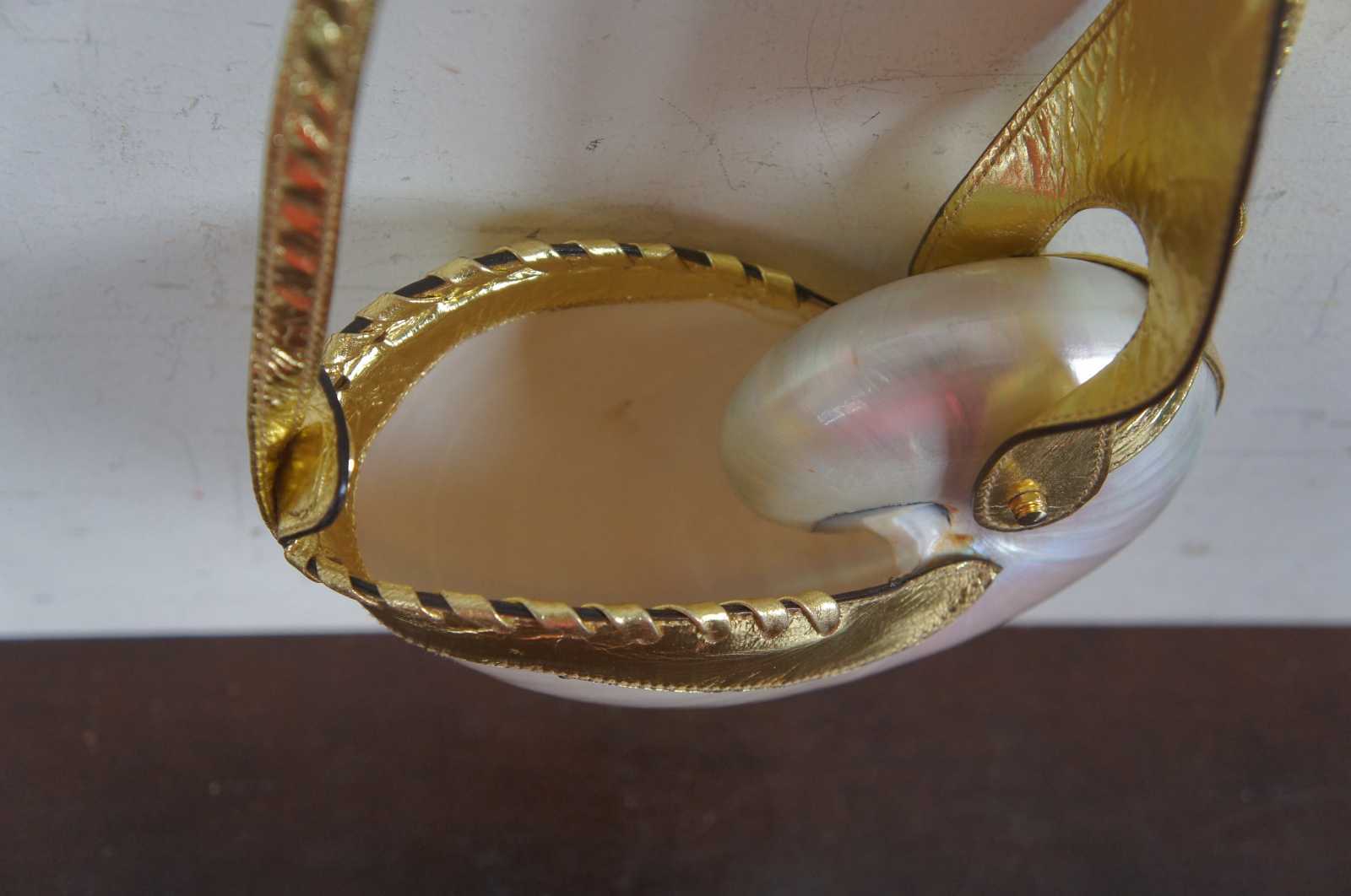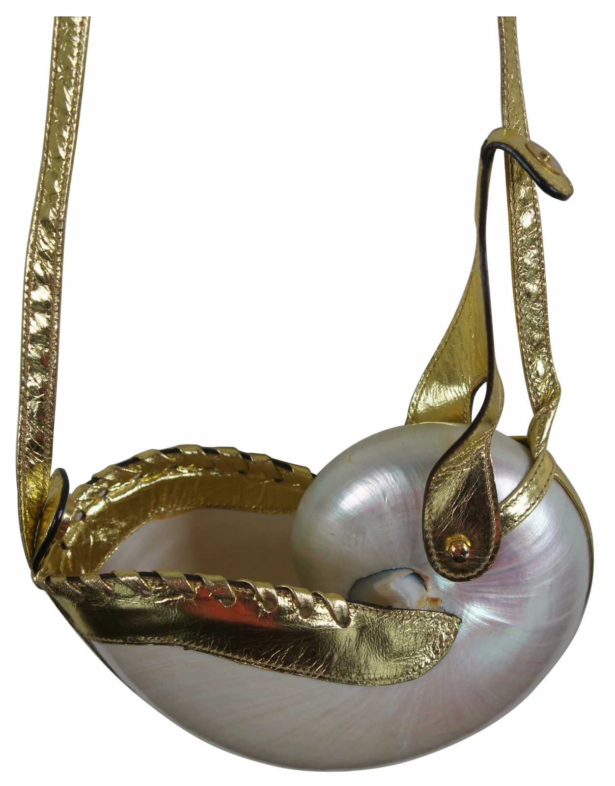 Mother of pearl nautilus purse with gold leather strap and closure. Circa 1970s.