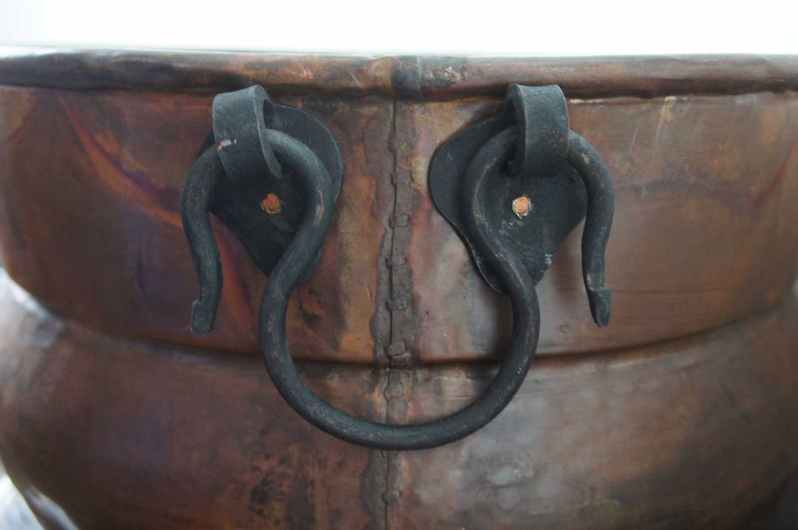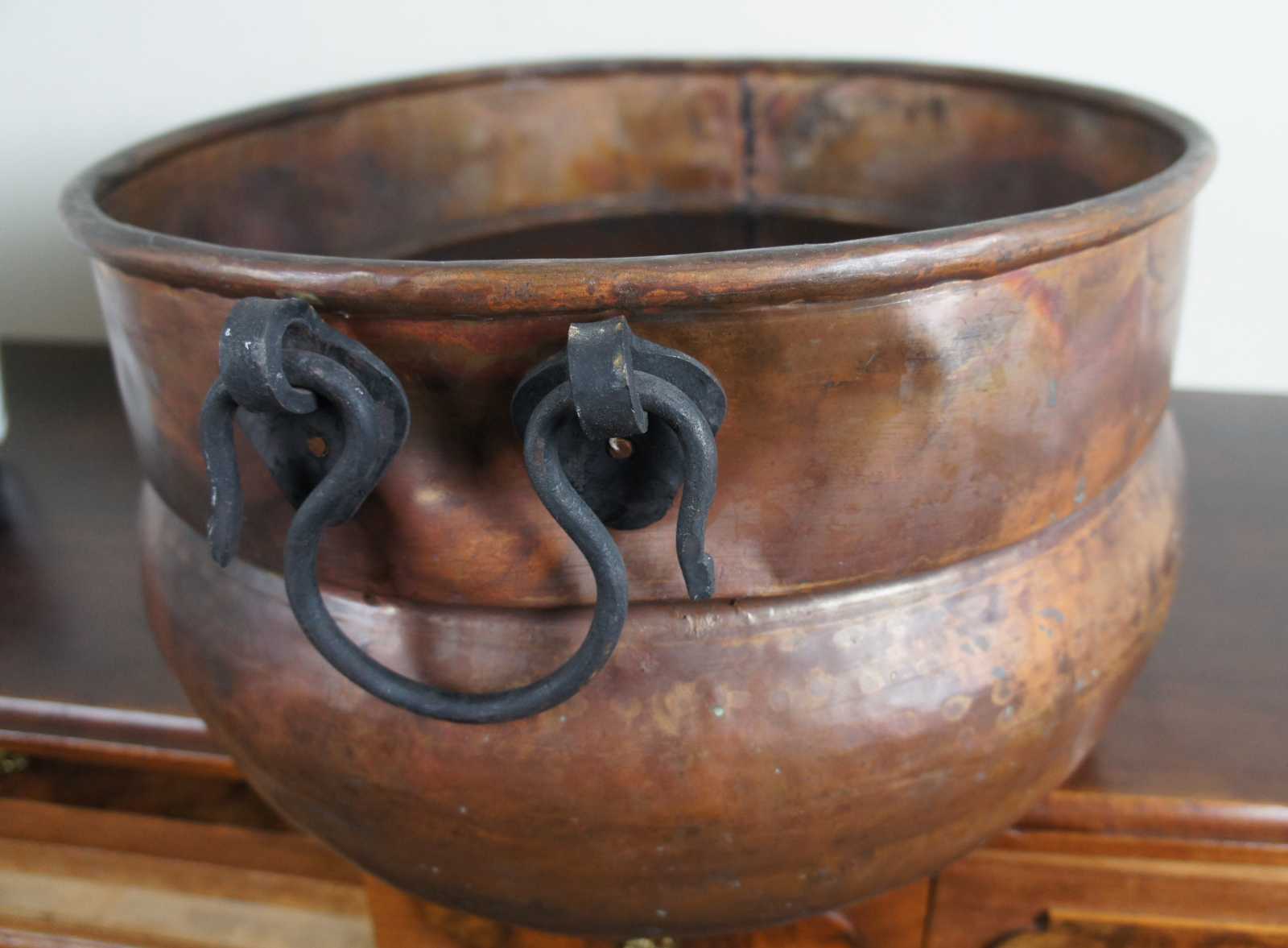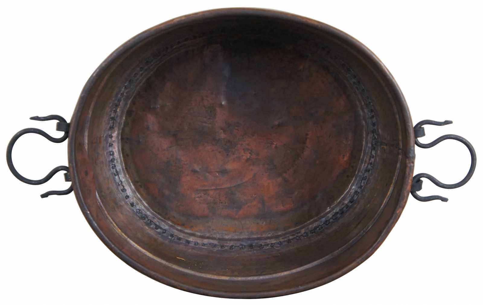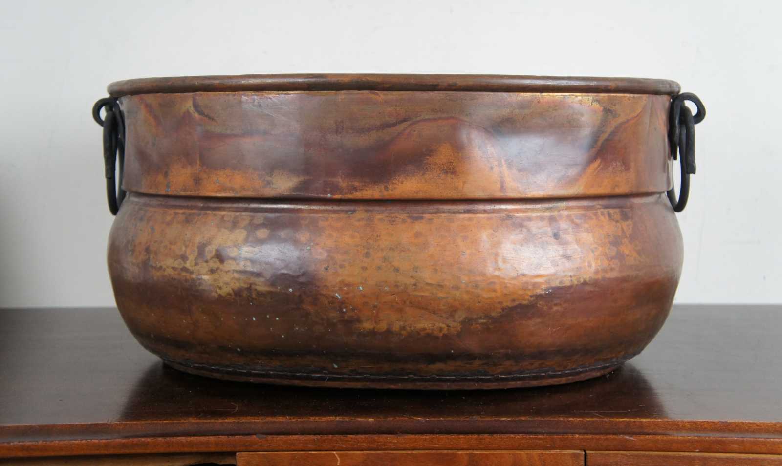 Antique hammered and dovetailed copper roasting pan with wrought iron handles, made in Turkey. Great for use as a planter, bucket, bin, cooler, log holder, boiler, tub, fireplace bucket, log holder, cauldron, pot or for apple butter.