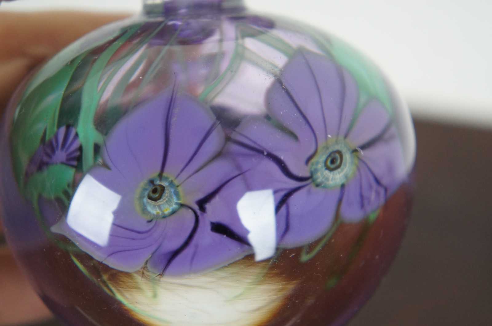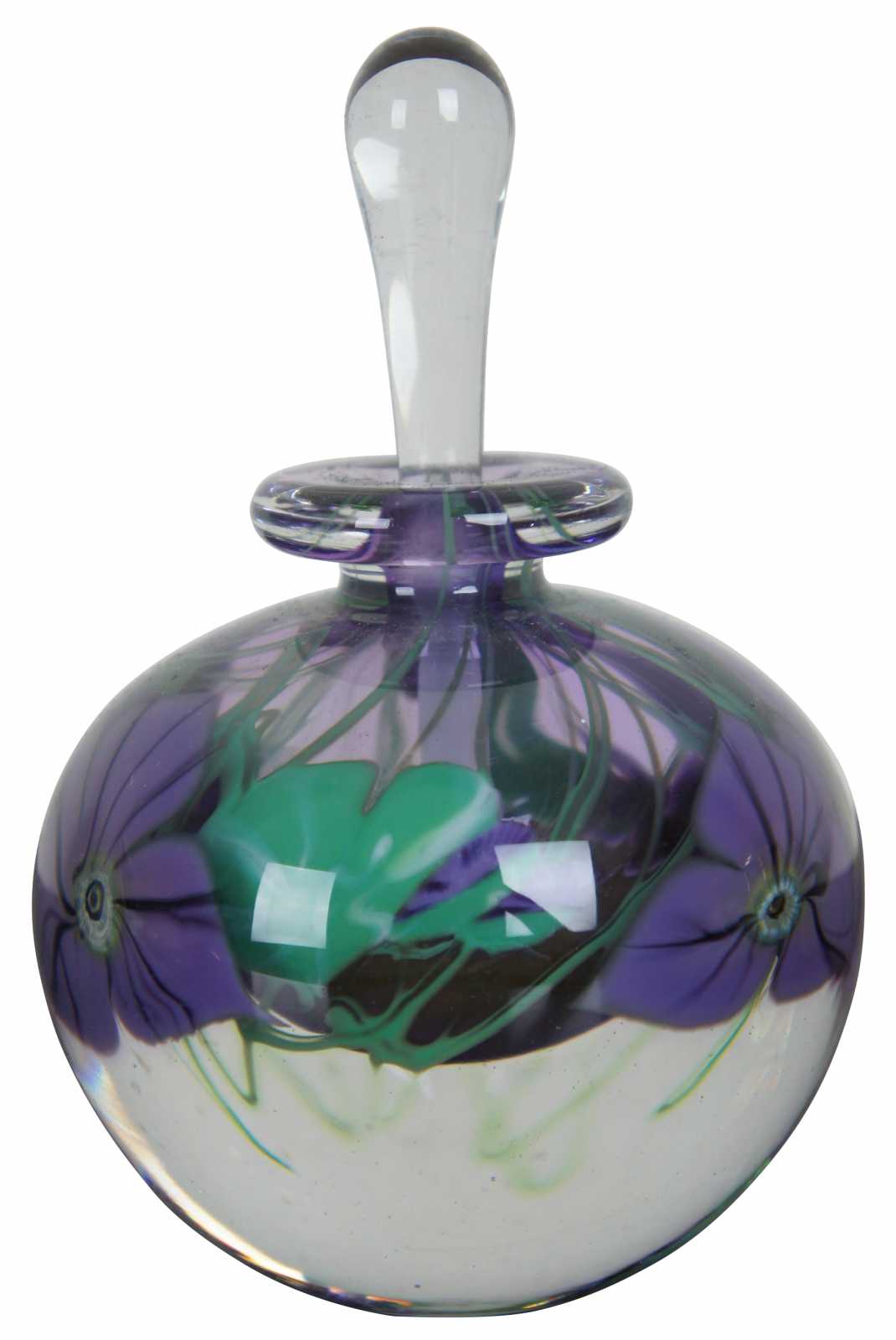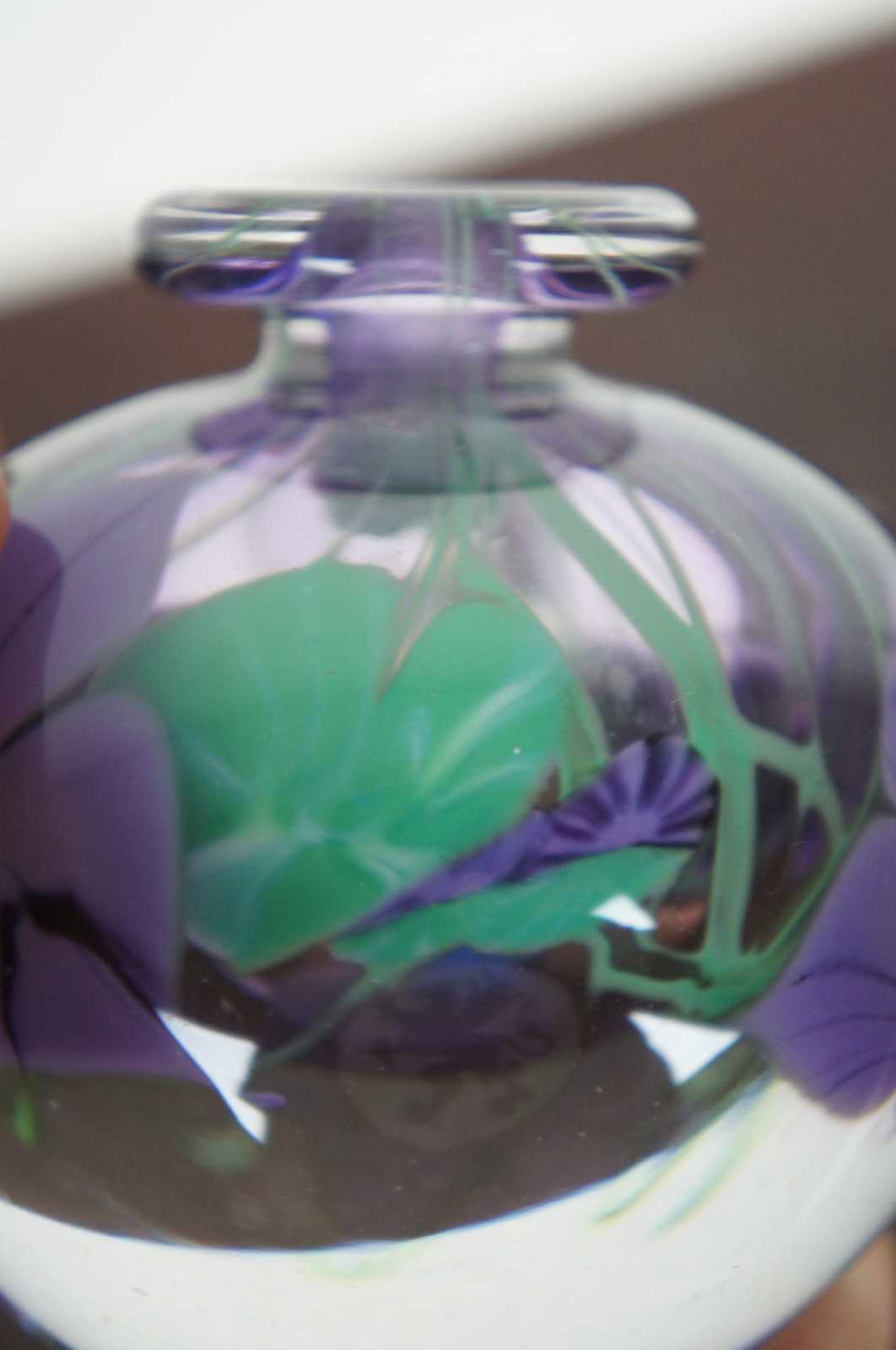 Mary Angus 1983 hand blown art glass perfume bottle and stopper with an injected design of black veined, purple flowers and green leaves.