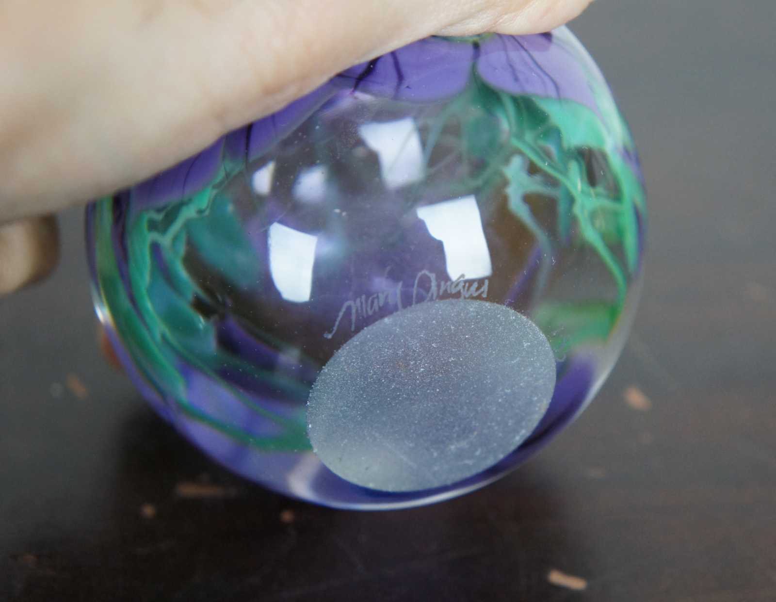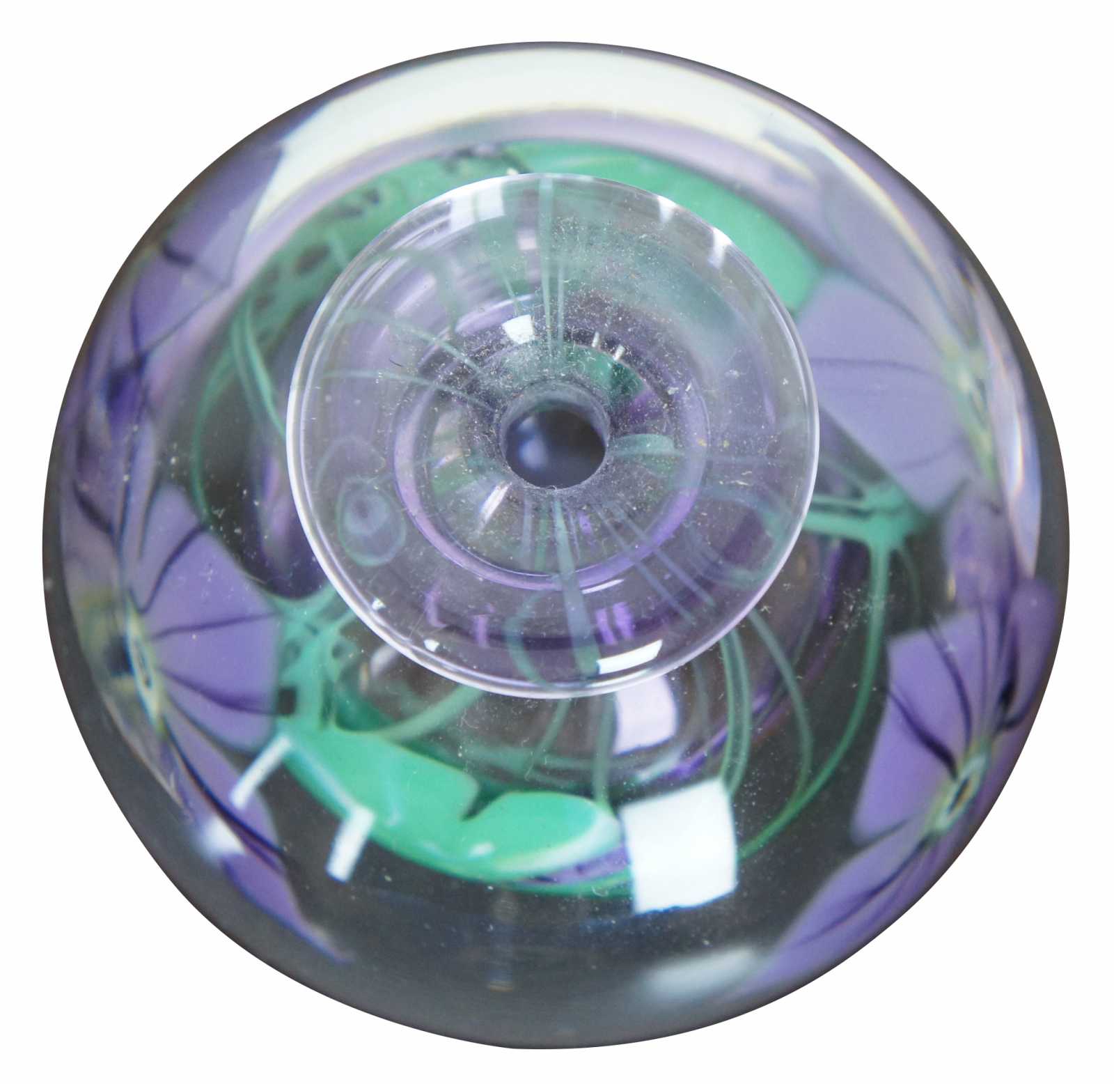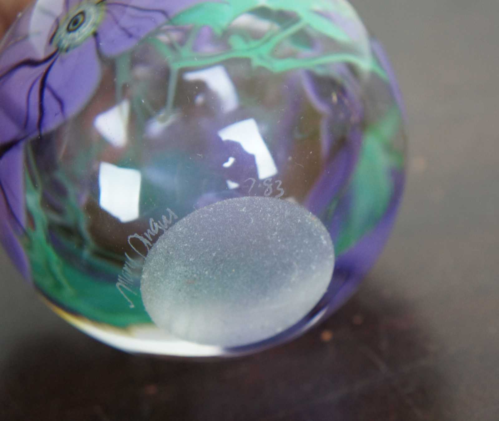 Mary Angus 1983 hand blown art glass perfume bottle and stopper with an injected design of black veined, purple flowers and green leaves.