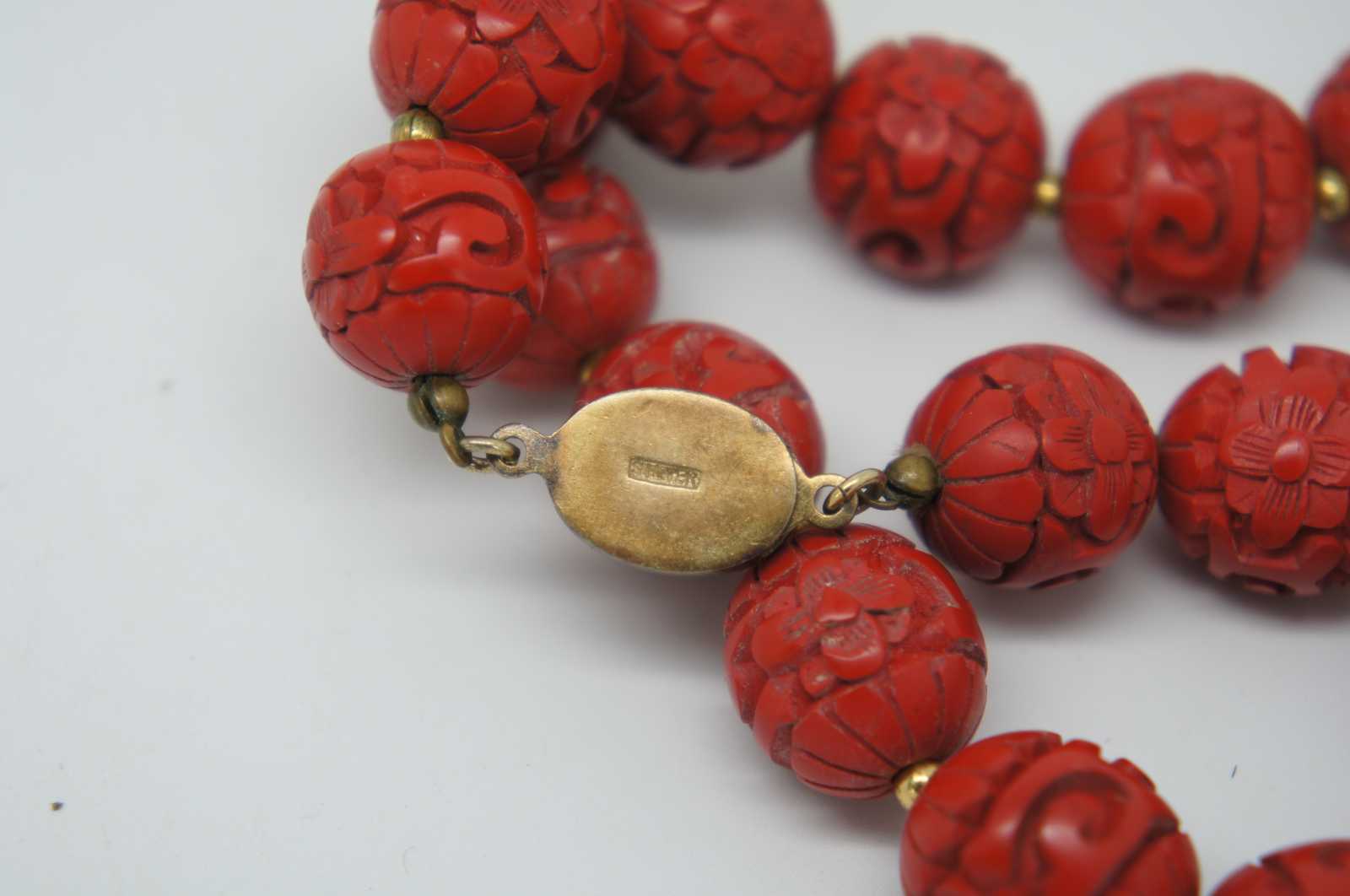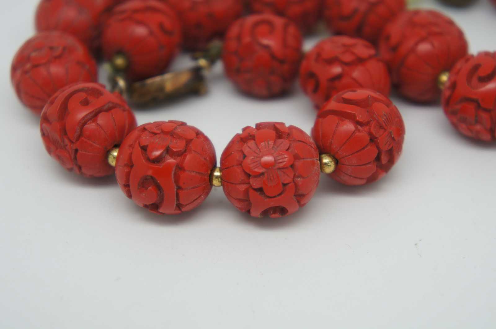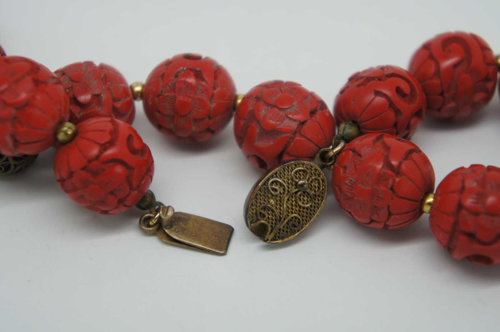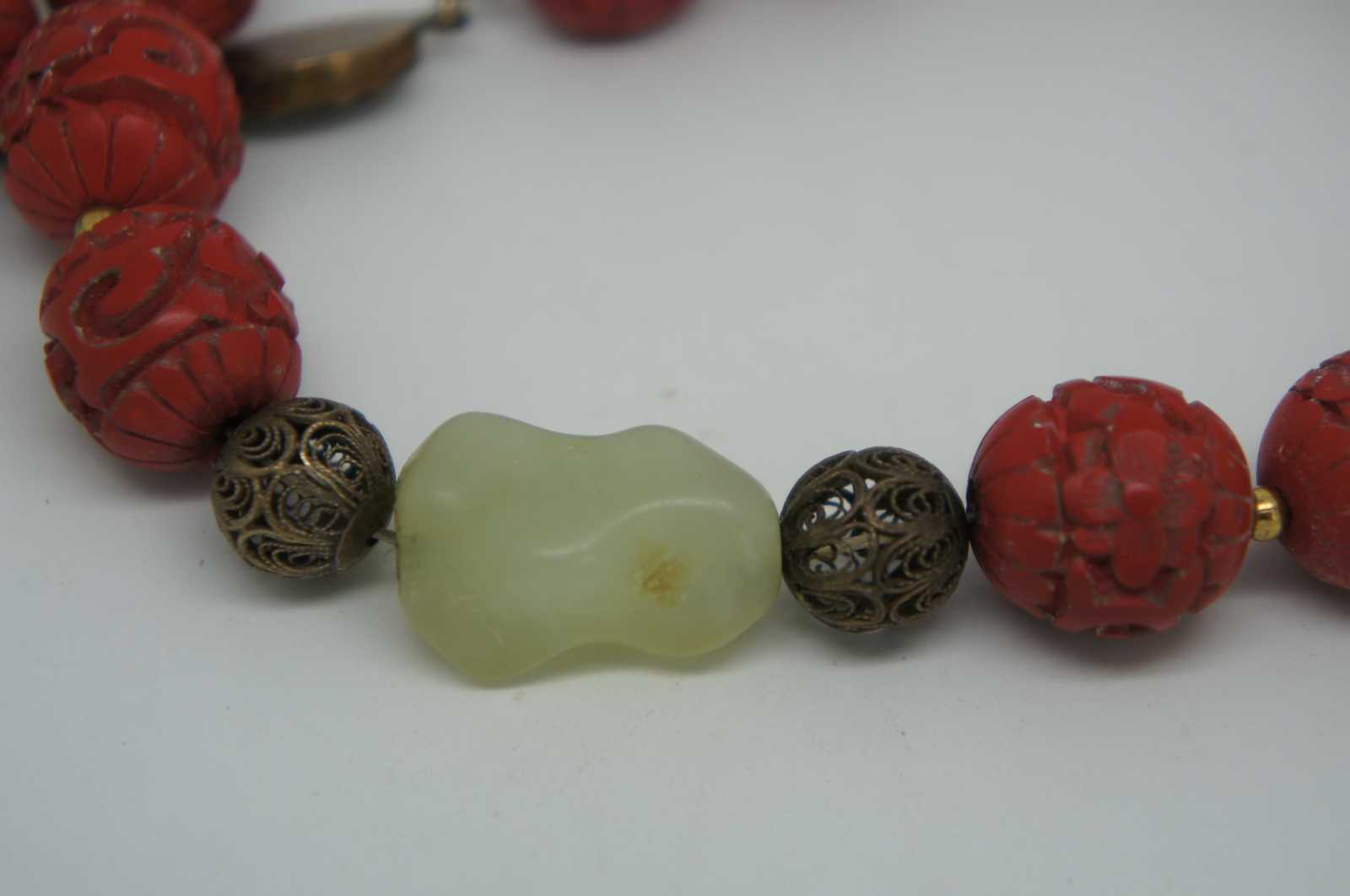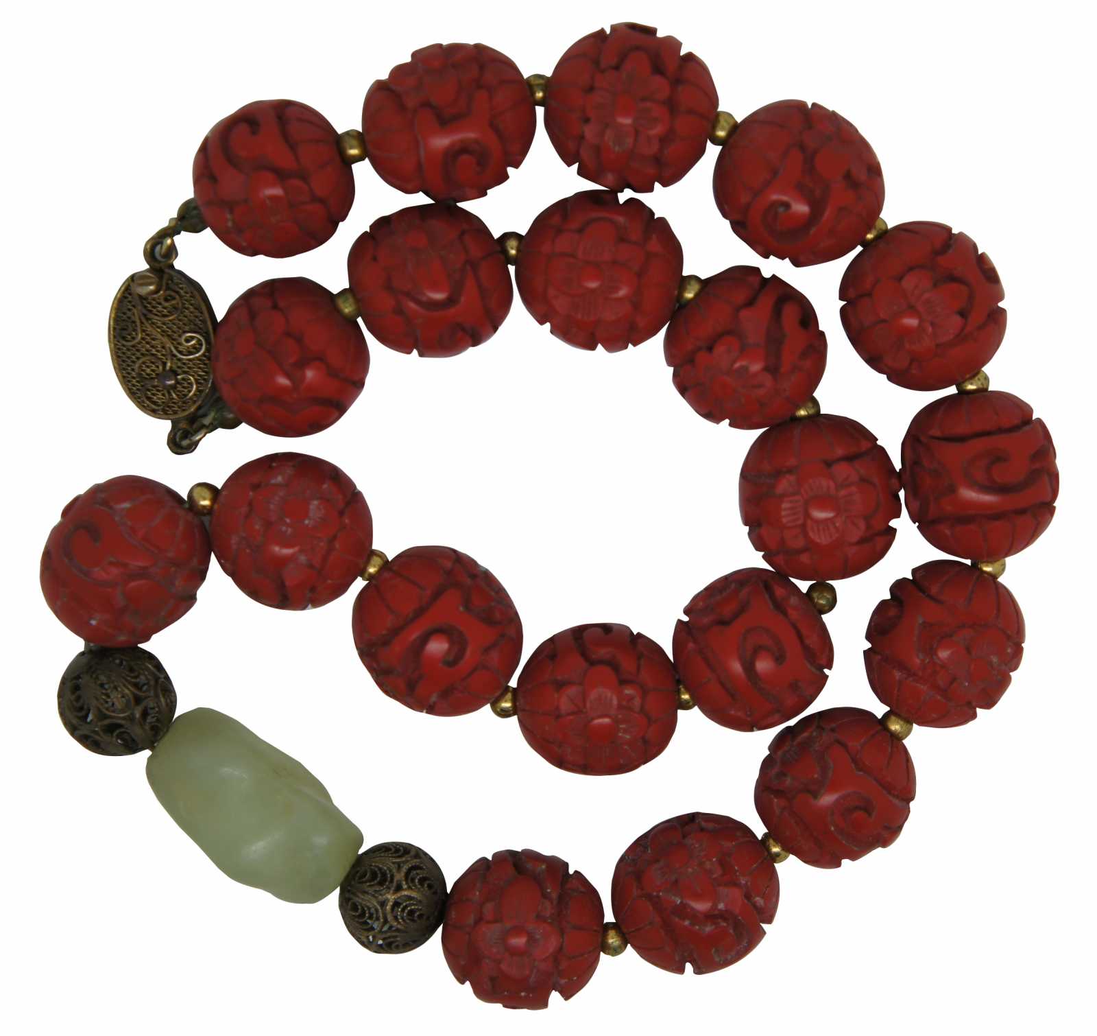 Vintage Chinese necklace of carved red cinnabar beads and a green jade accent bead with silver clasp.