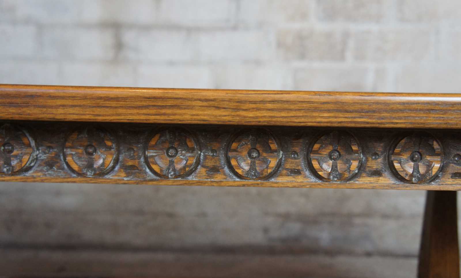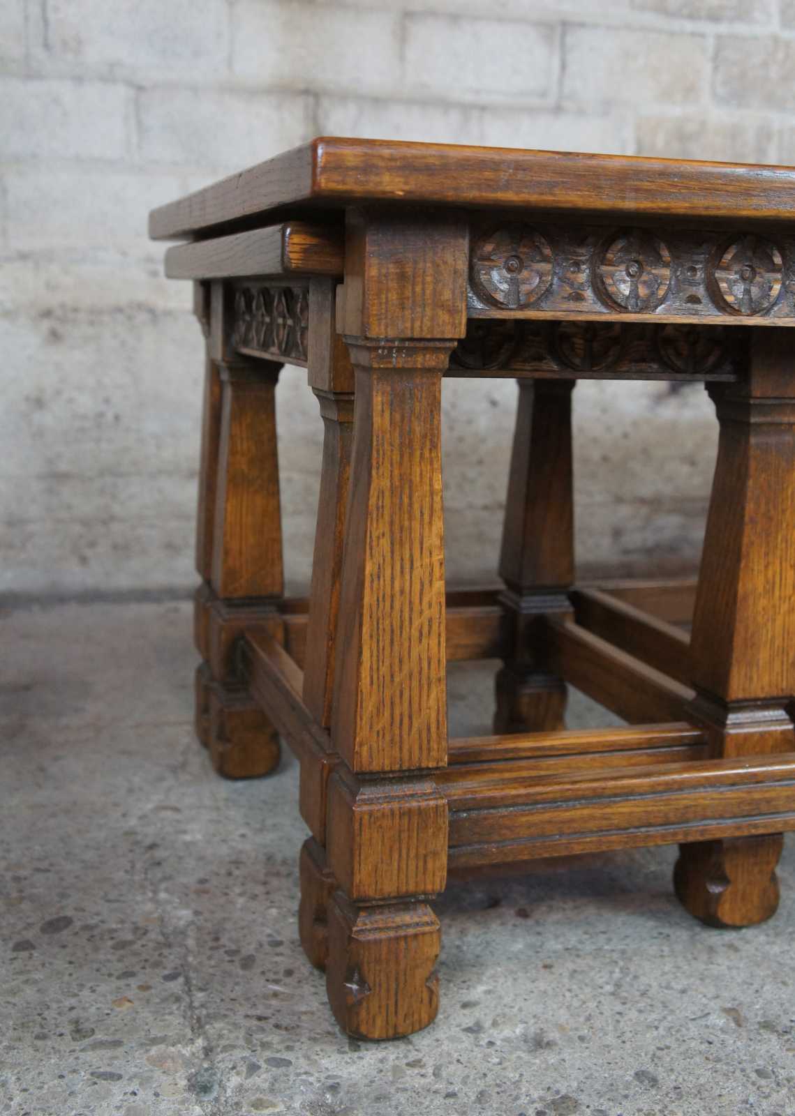 Romweber Viking Oak Nesting Coffee Table, Circa 1960s. Made from solid oak with a carved apron over square tapered legs connected by jointed stretchers.