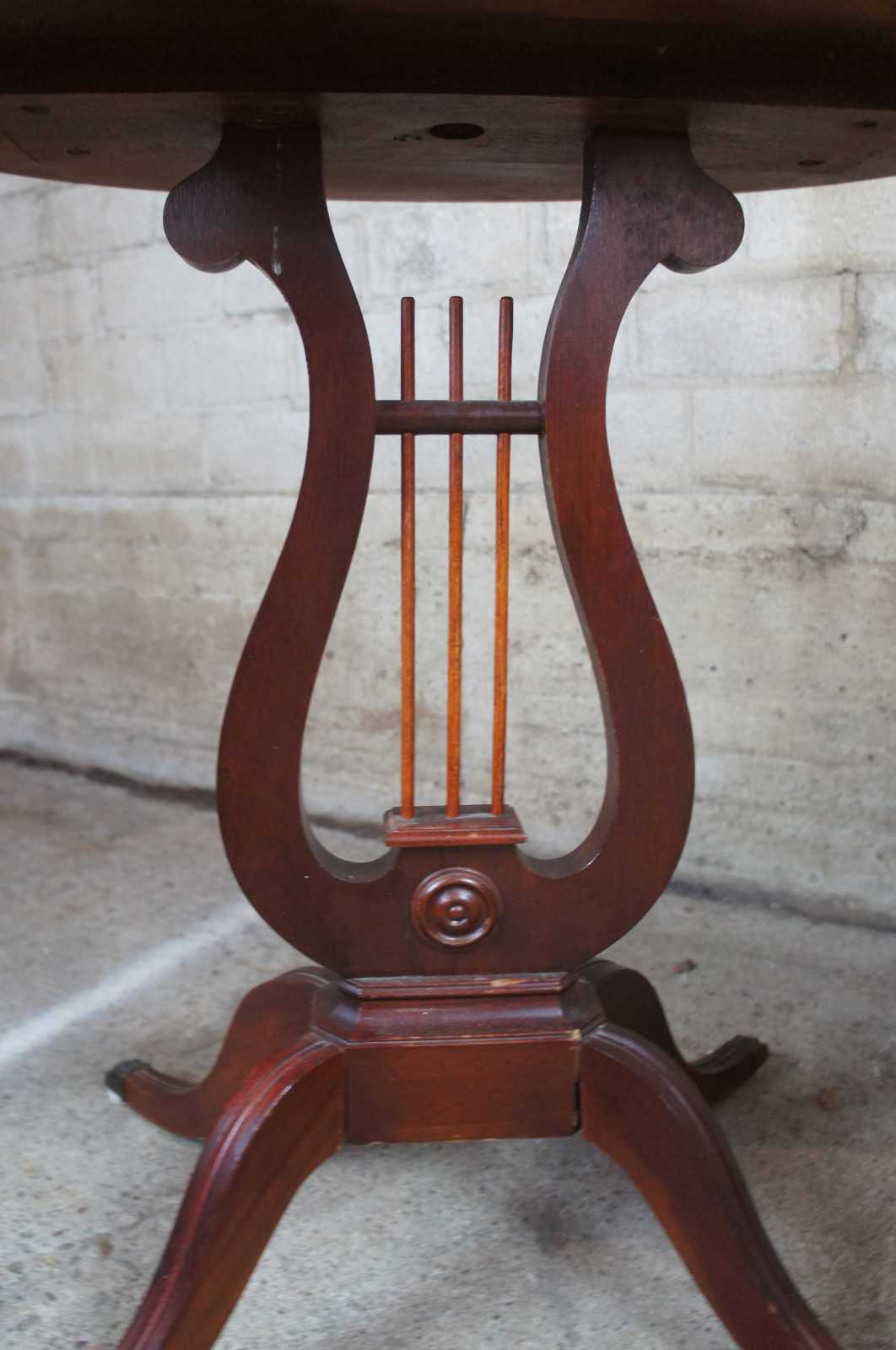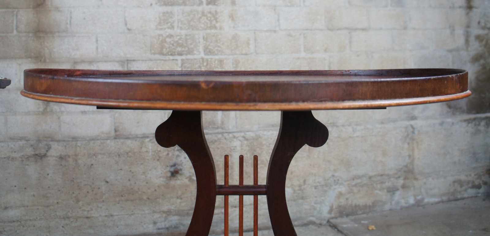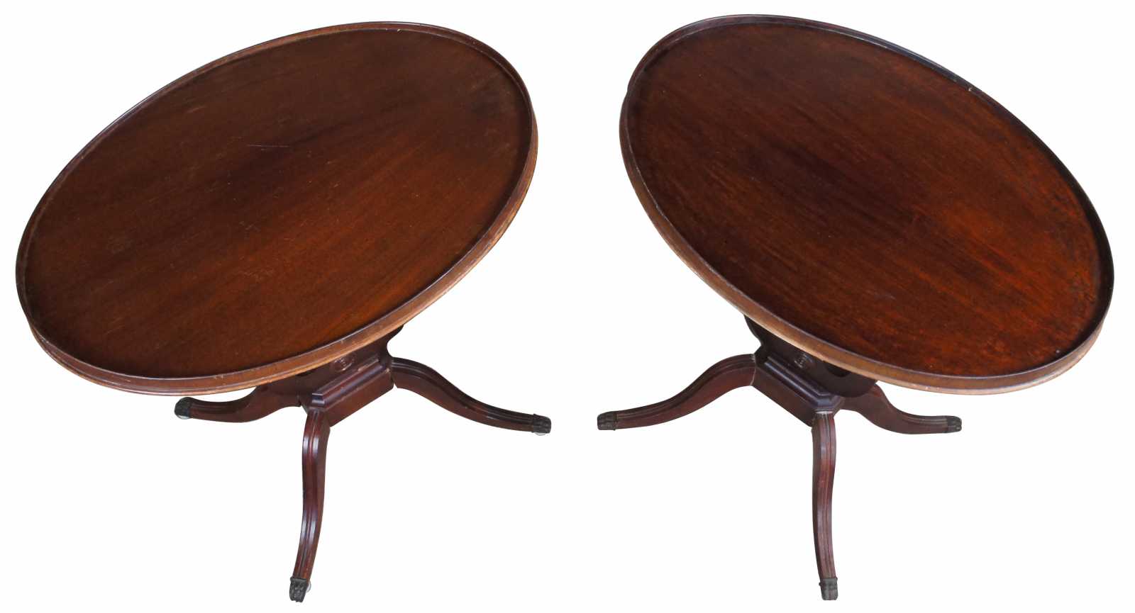 Circa 1940s Duncan Phyfe side tables. Made from mahogany with an oval top featuring an inset table surface with gallery over a harp shape center leading to four legs with brass capped feet.
