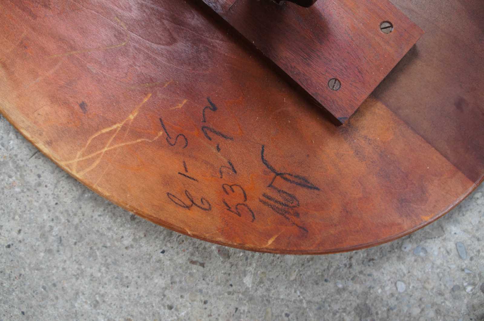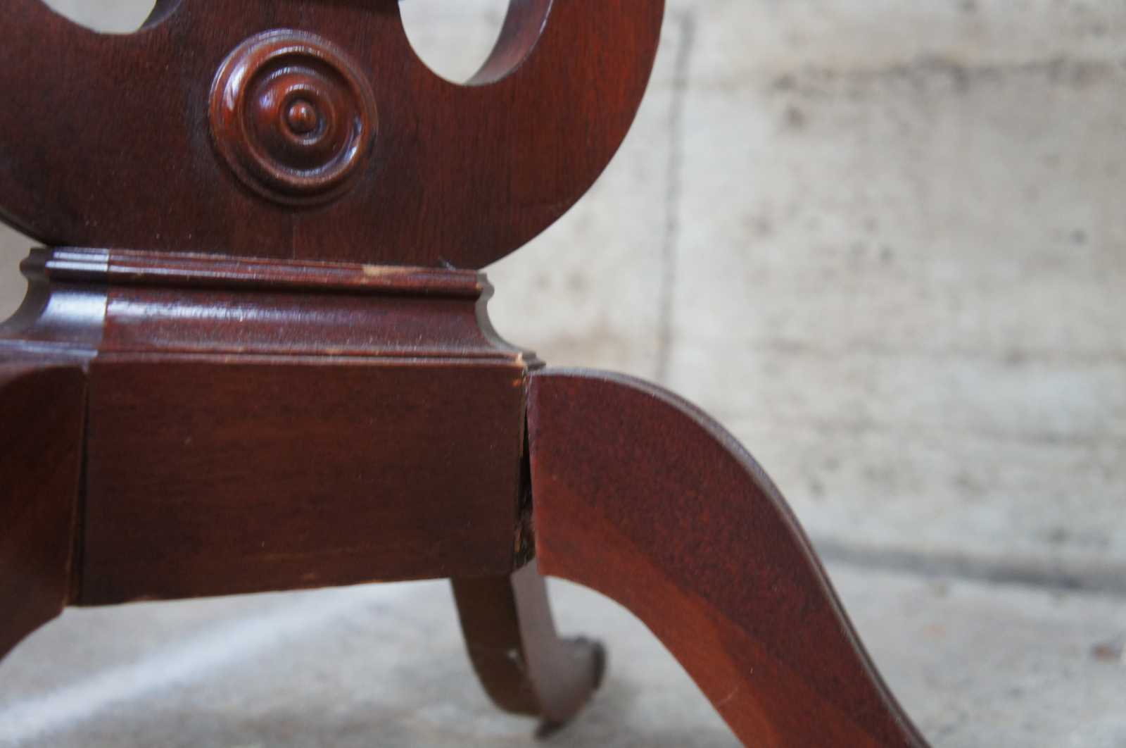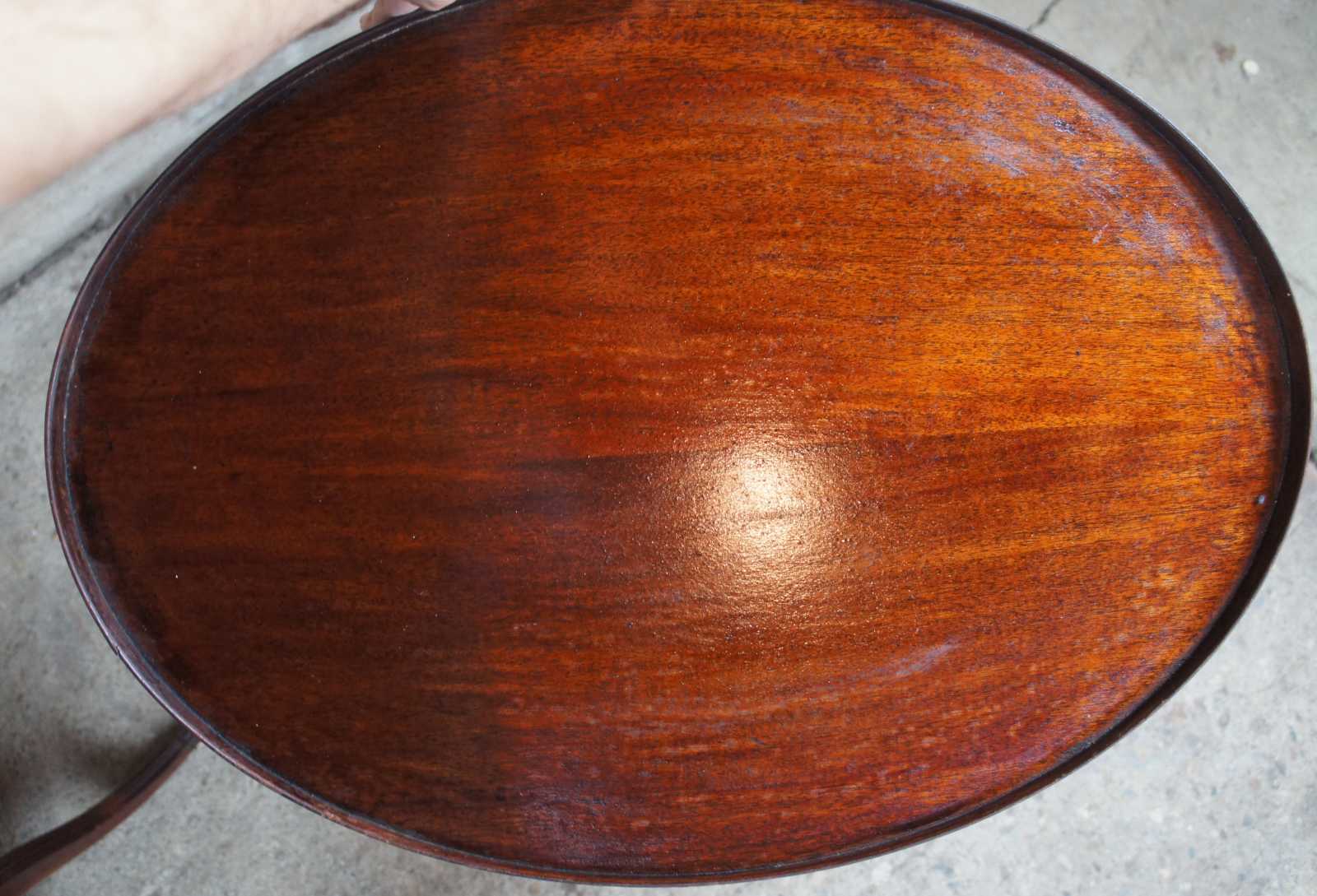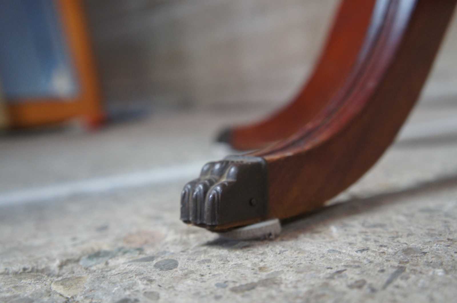 Circa 1940s Duncan Phyfe side tables. Made from mahogany with an oval top featuring an inset table surface with gallery over a harp shape center leading to four legs with brass capped feet.