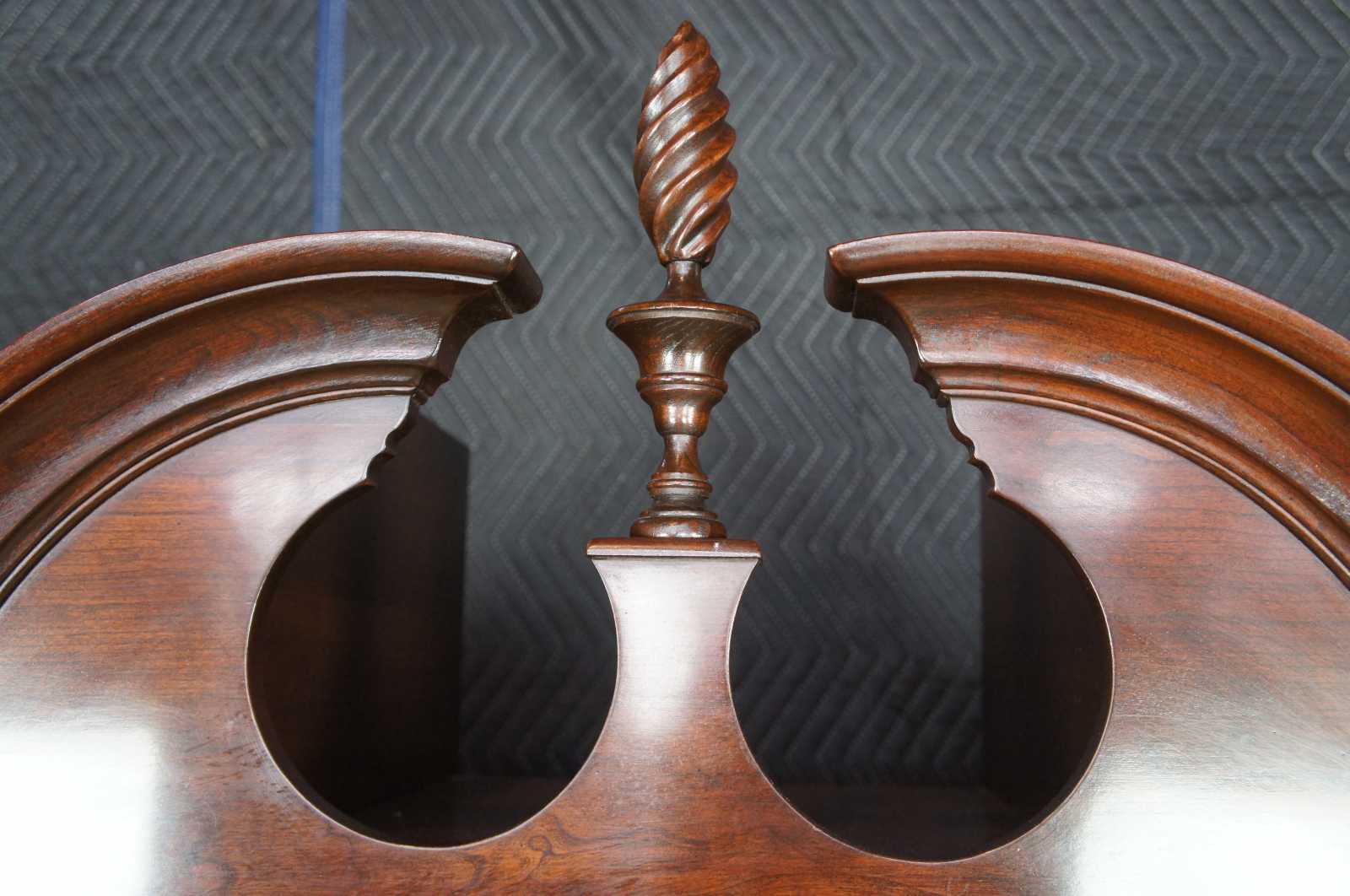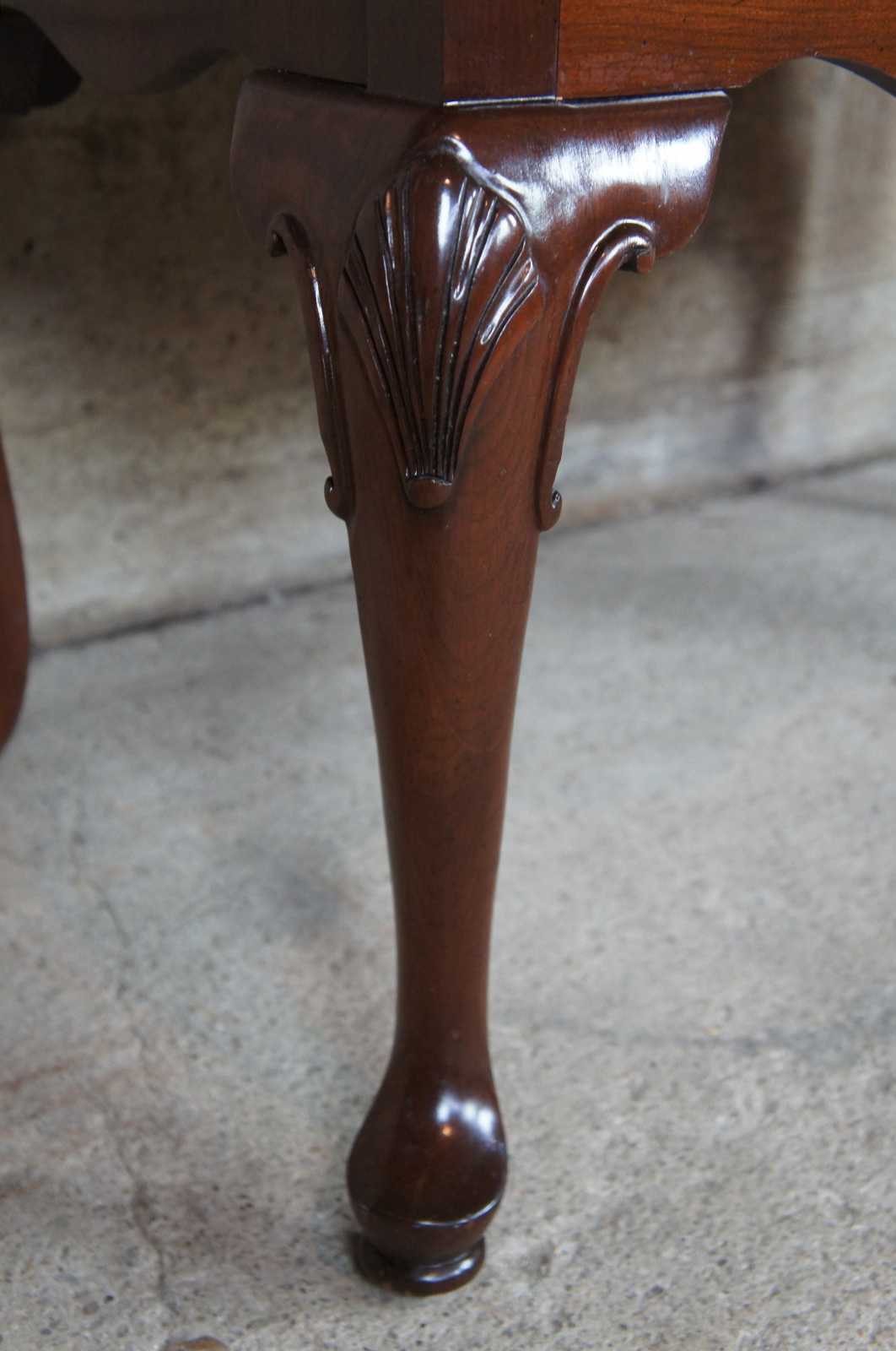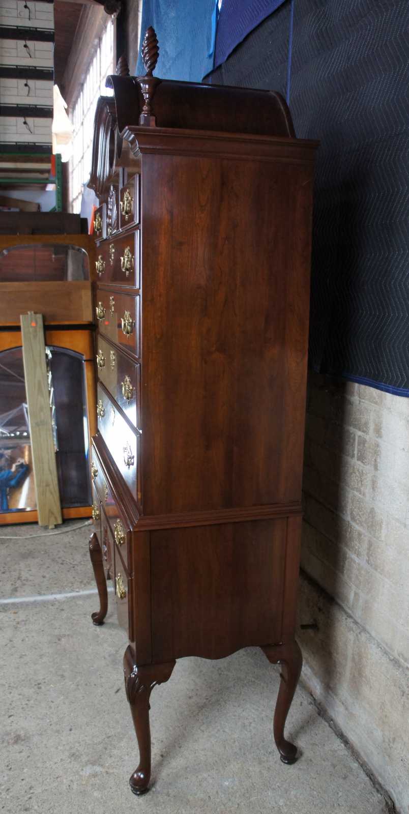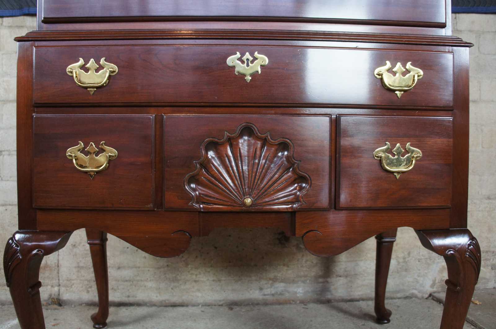 A beautiful queen anne or chippendale inspired chest on chest. Made from solid cherry with brass hardware and shell carved drawers. Features an open pediment design with 3 turned finials and cabriole legs leading to pad feet. Circa 1987.