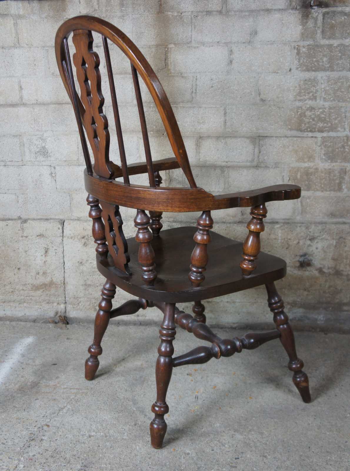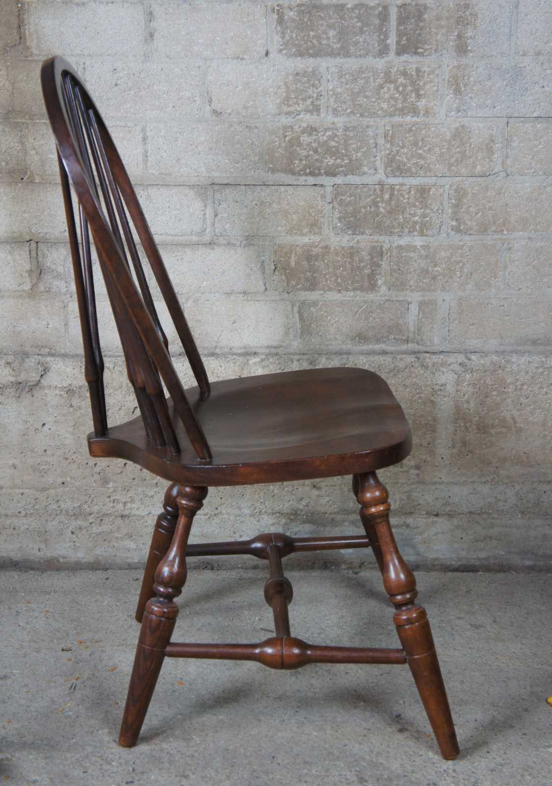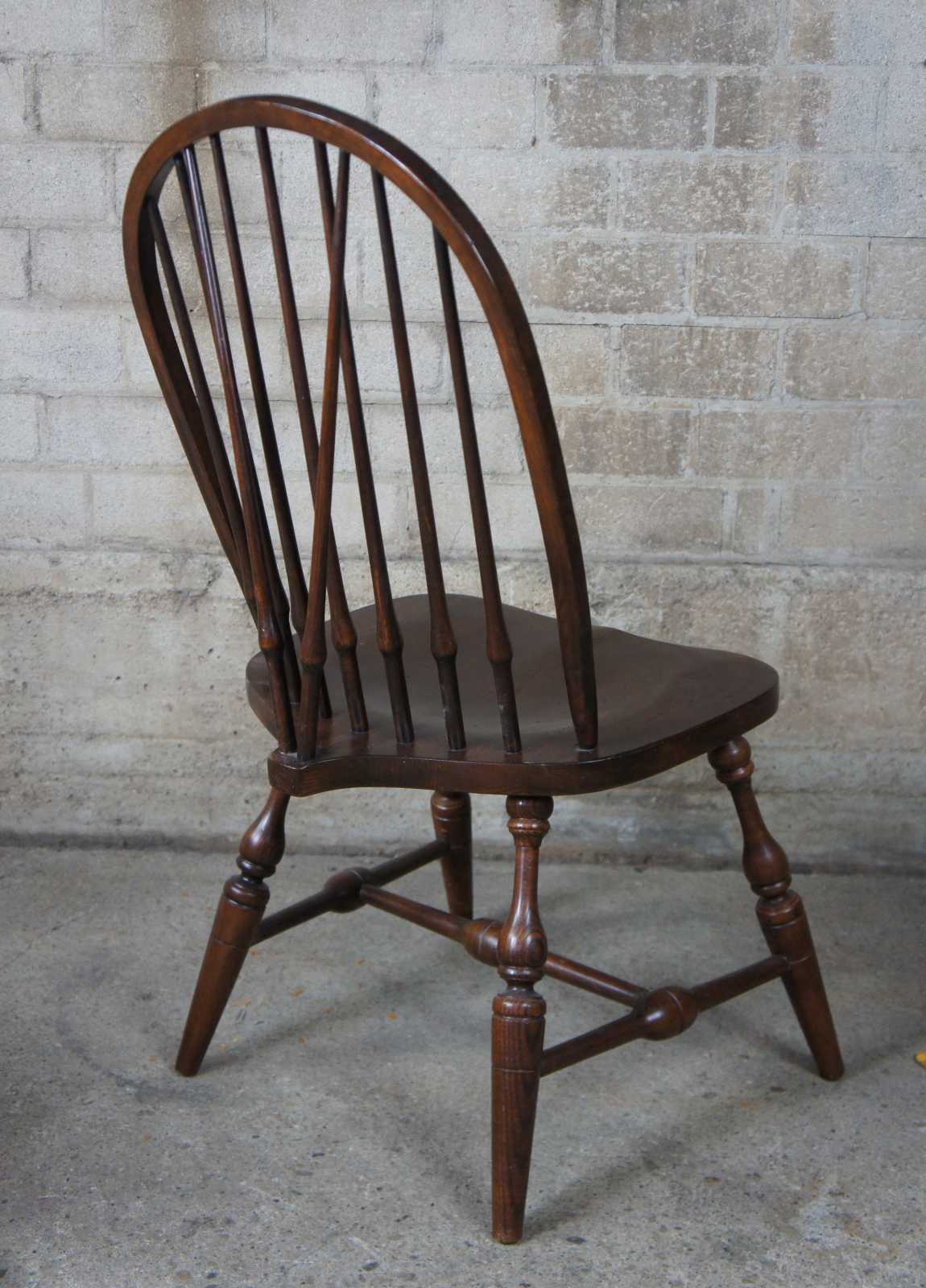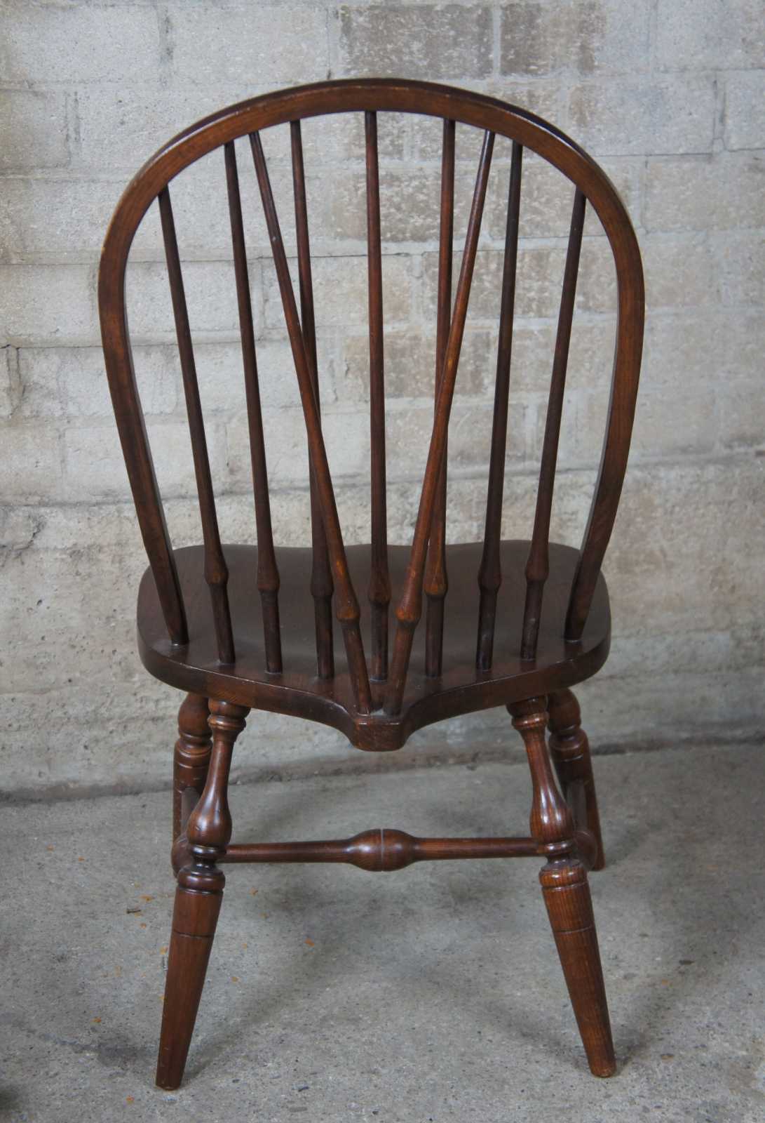 Eight 20th century Pennsylvania House Windsor style dining chairs. Finished in oak with two English Windsor arm chiars in addition to the six brace back side chairs. Neatly designed iwth a saddle seat, turned legs connected by H stretcher.