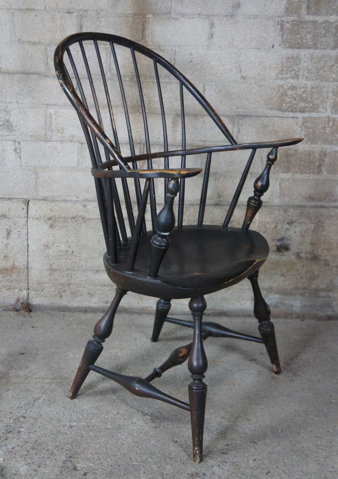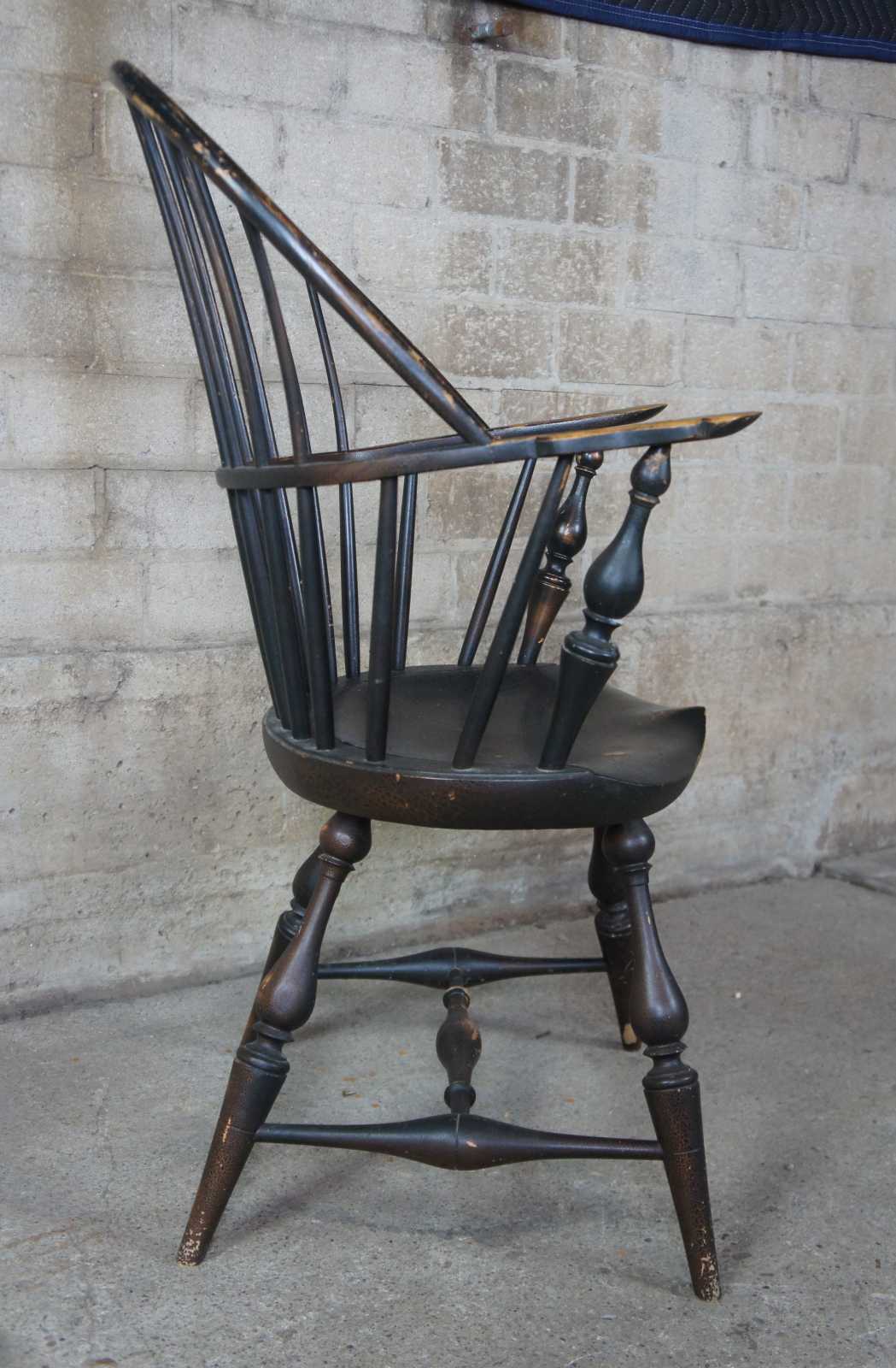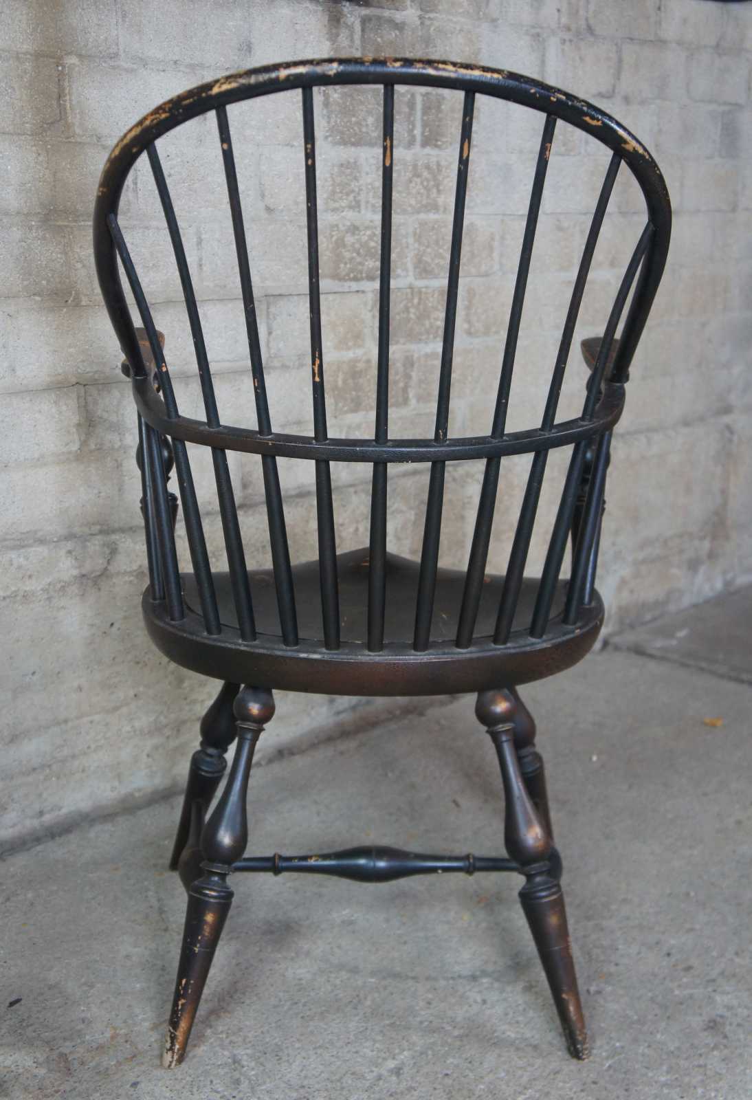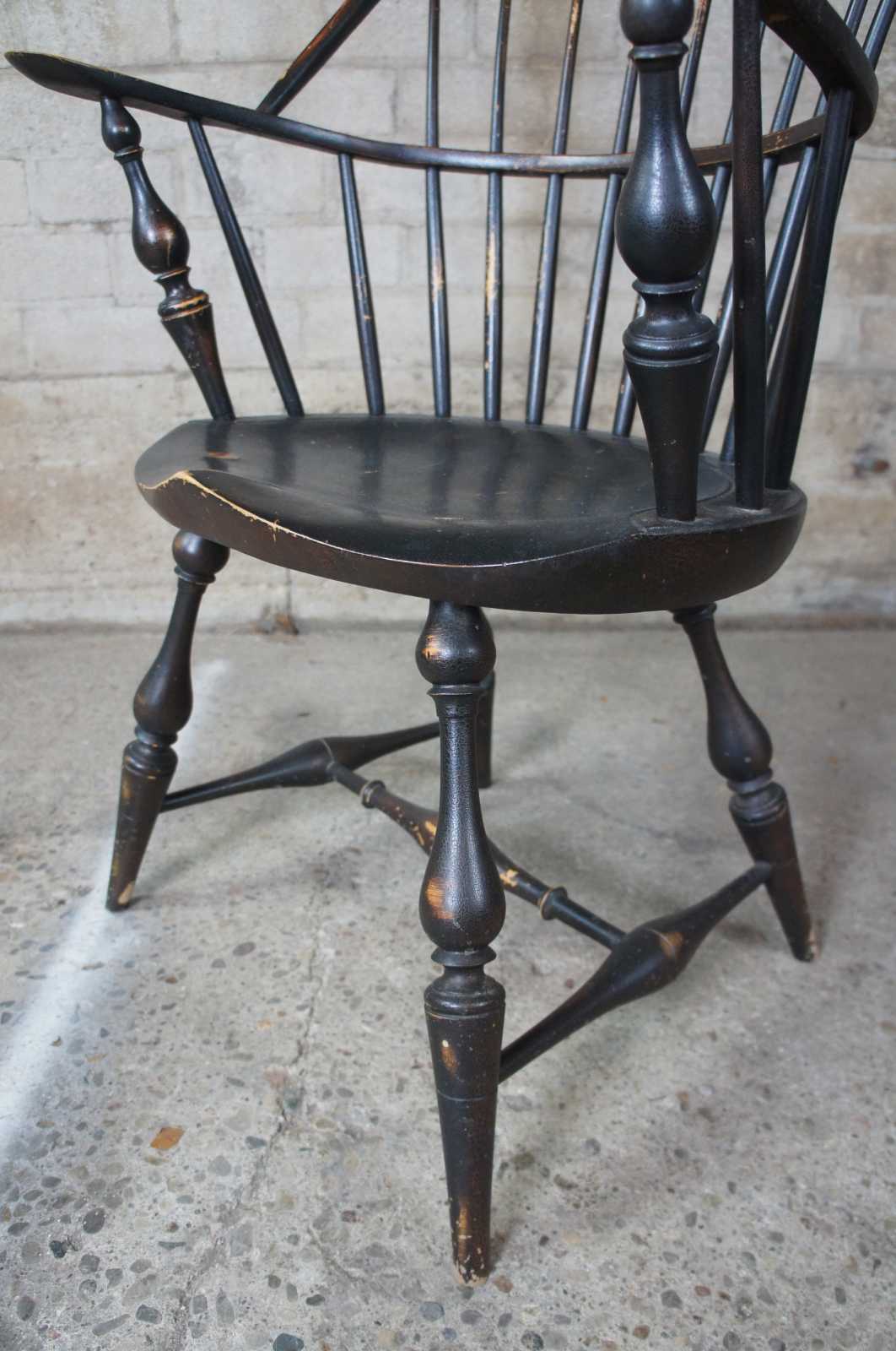 Late 20th century Bow Back Windsor arm chairs by River bend Chair Co. Features a black crackle finish with vase shaped legs.