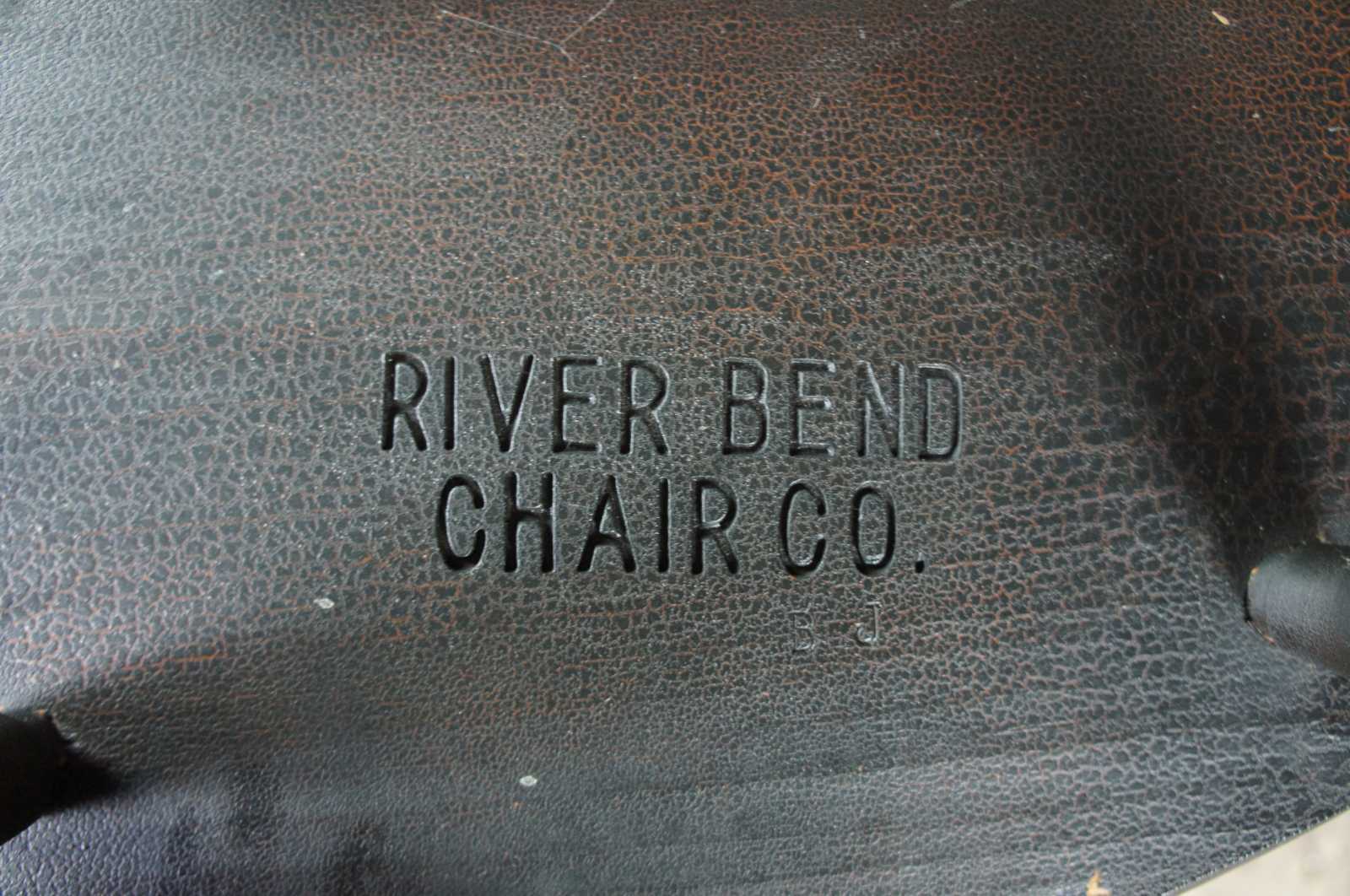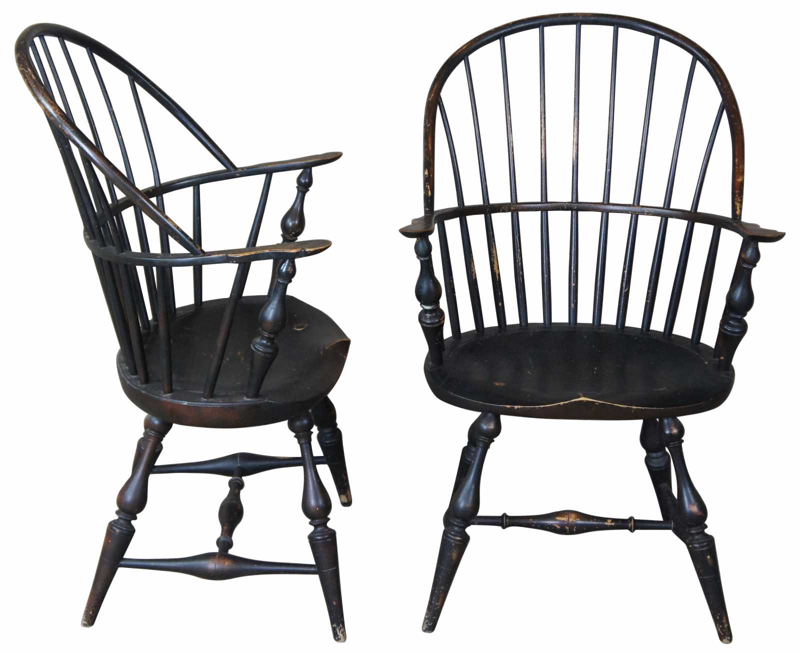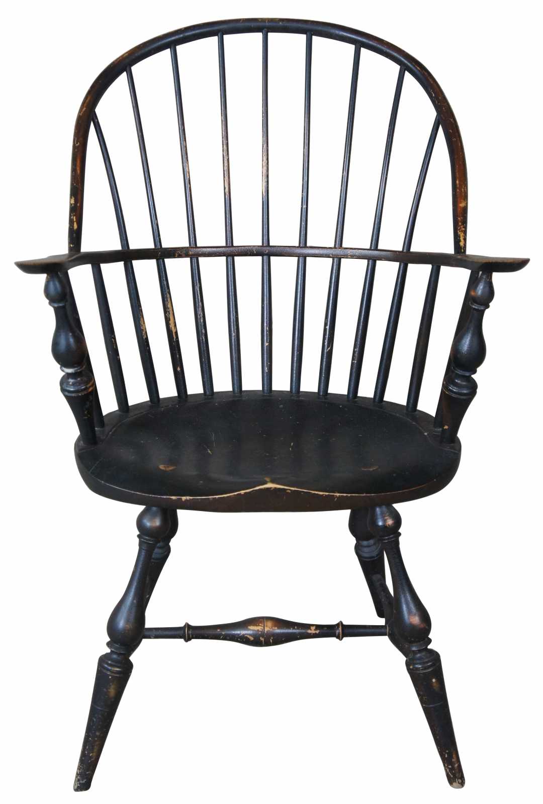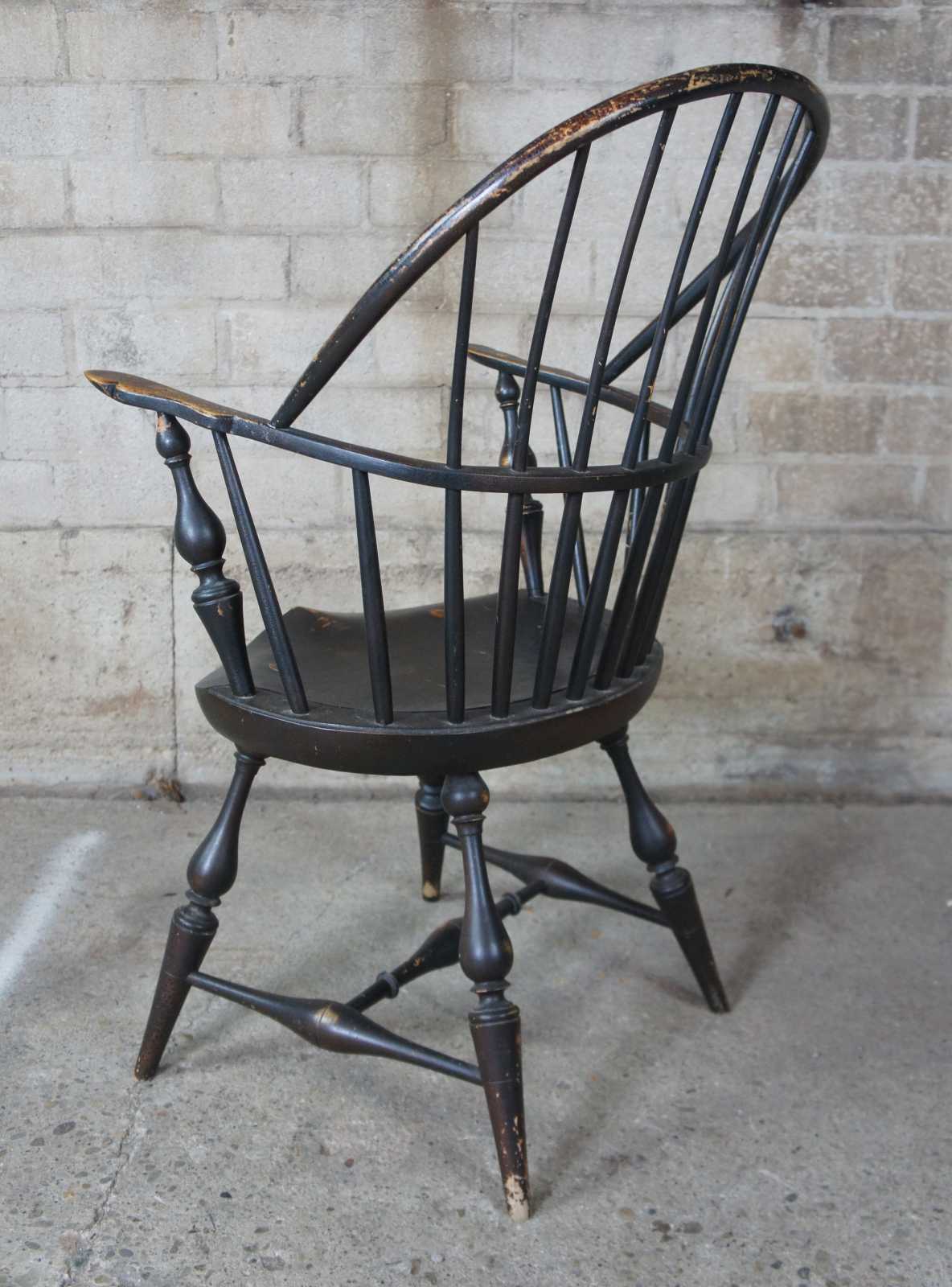Late 20th century Bow Back Windsor arm chairs by River bend Chair Co. Features a black crackle finish with vase shaped legs.