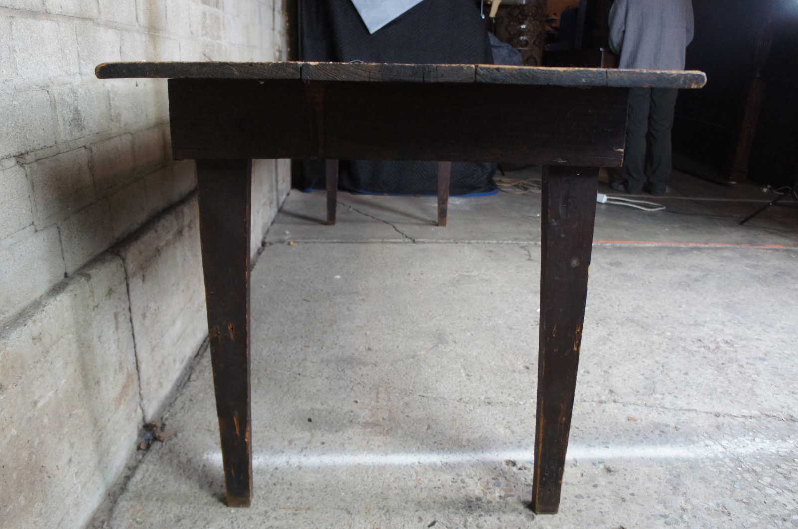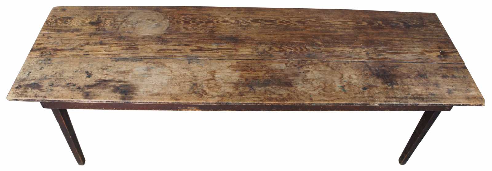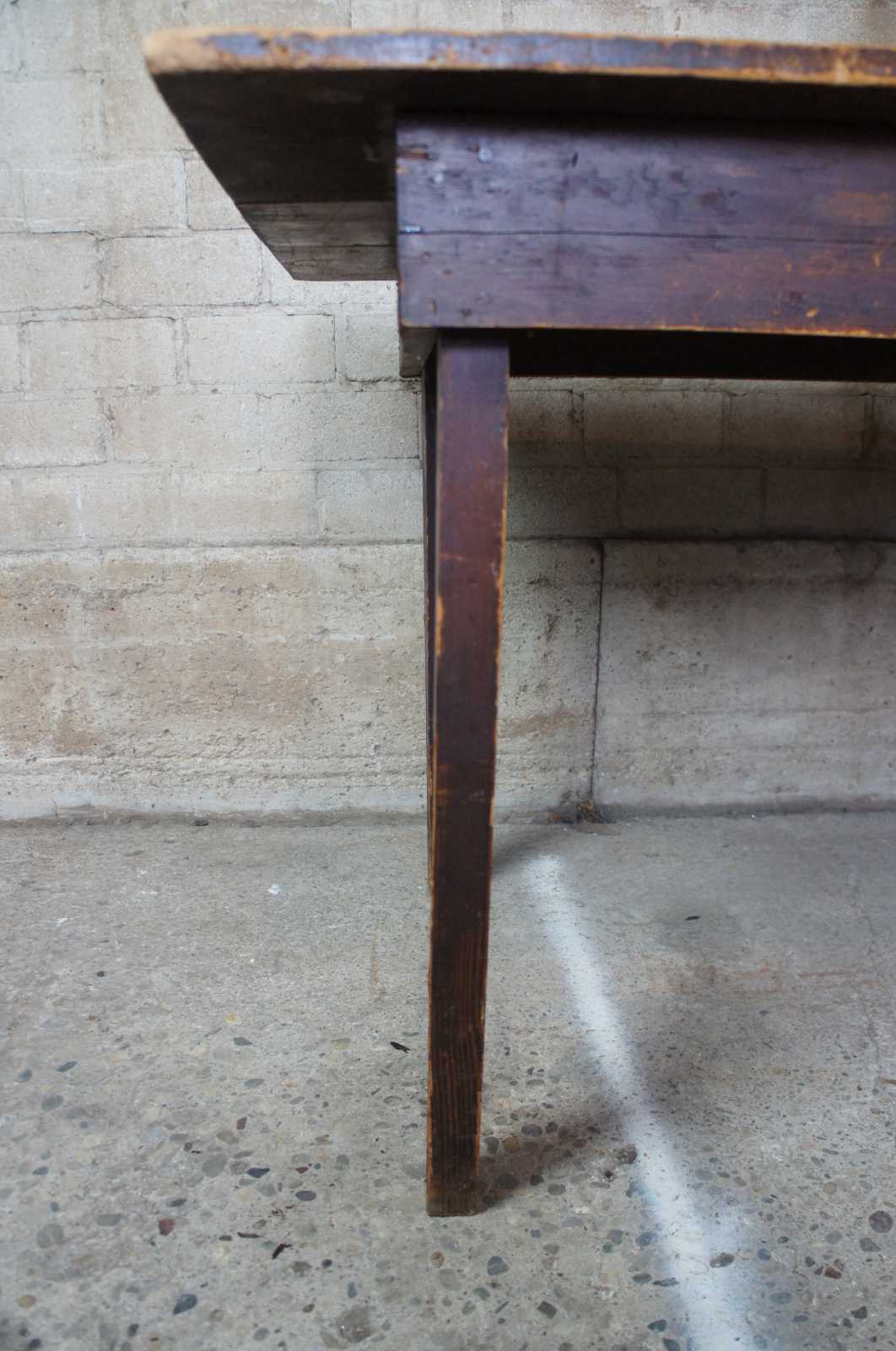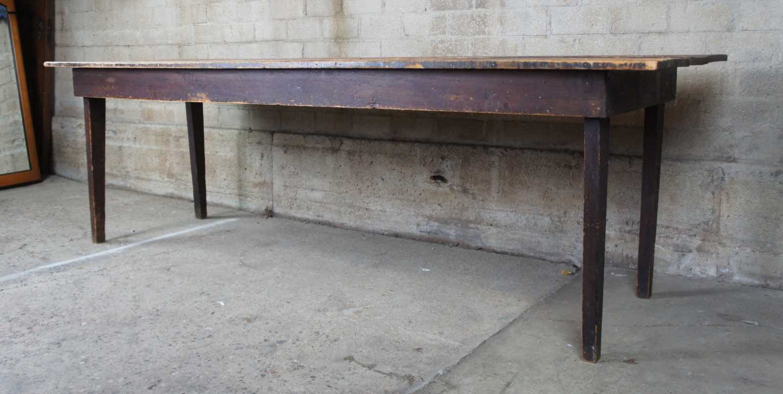 20th century pine farmhouse table. Features a rectangular plank top supported by square tapered legs.