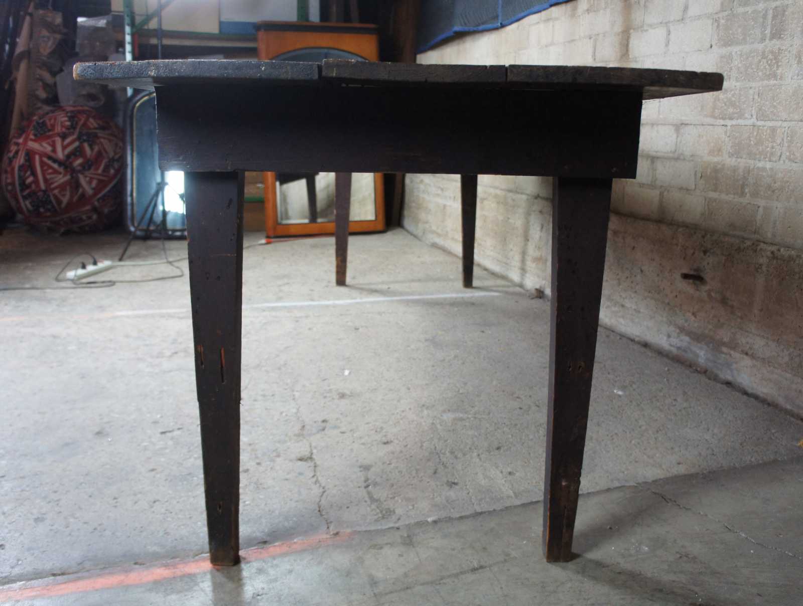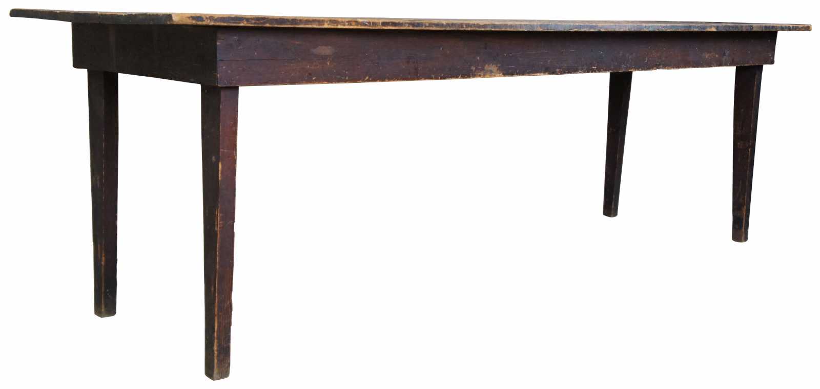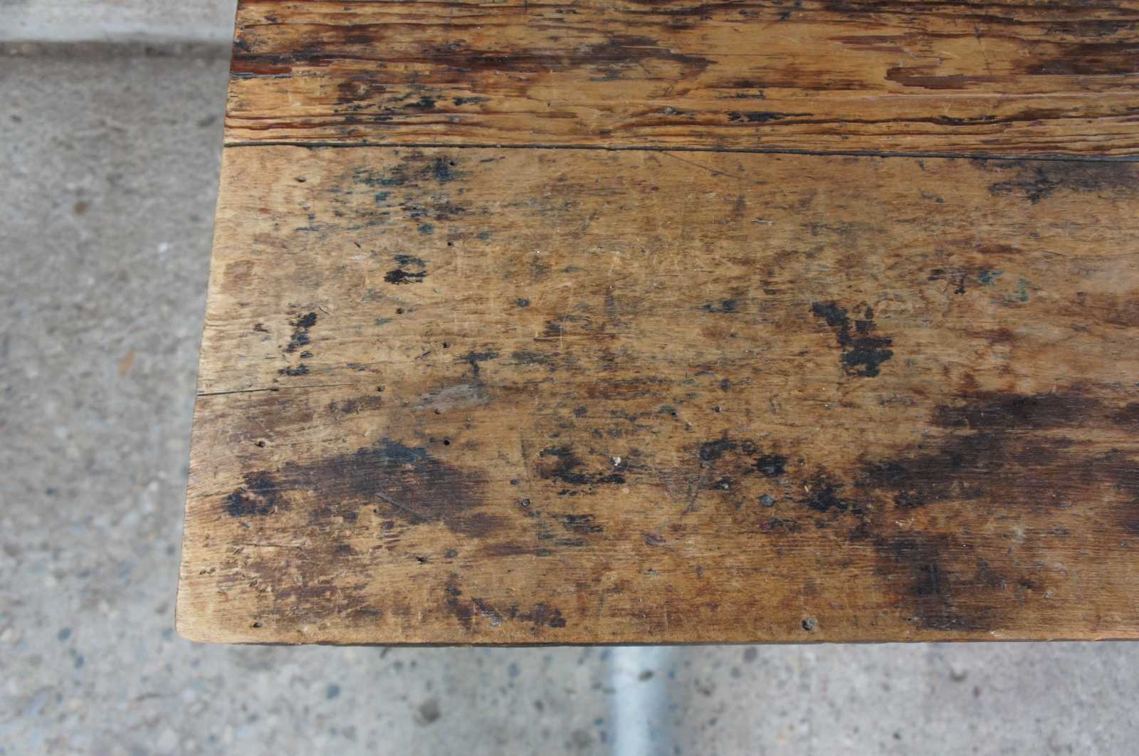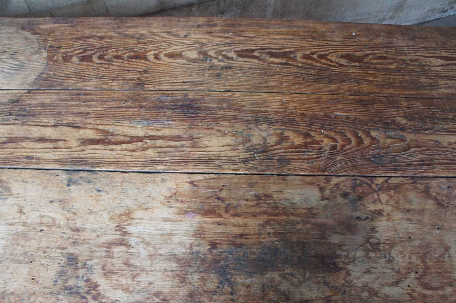 20th century pine farmhouse table. Features a rectangular plank top supported by square tapered legs.