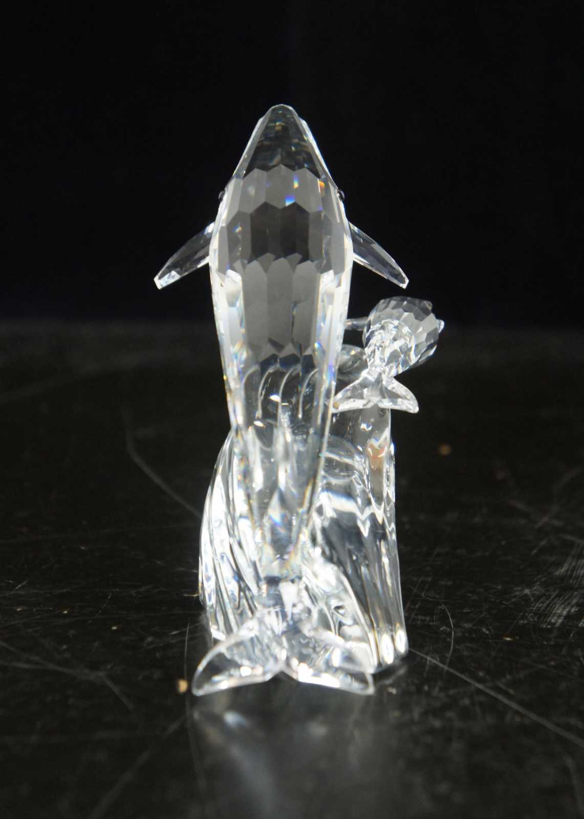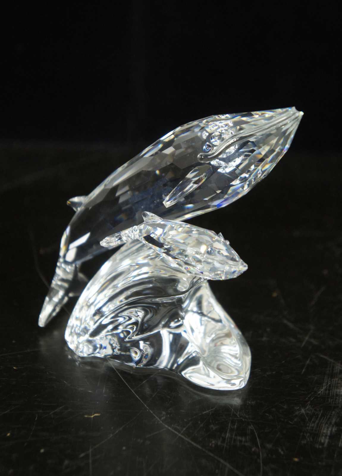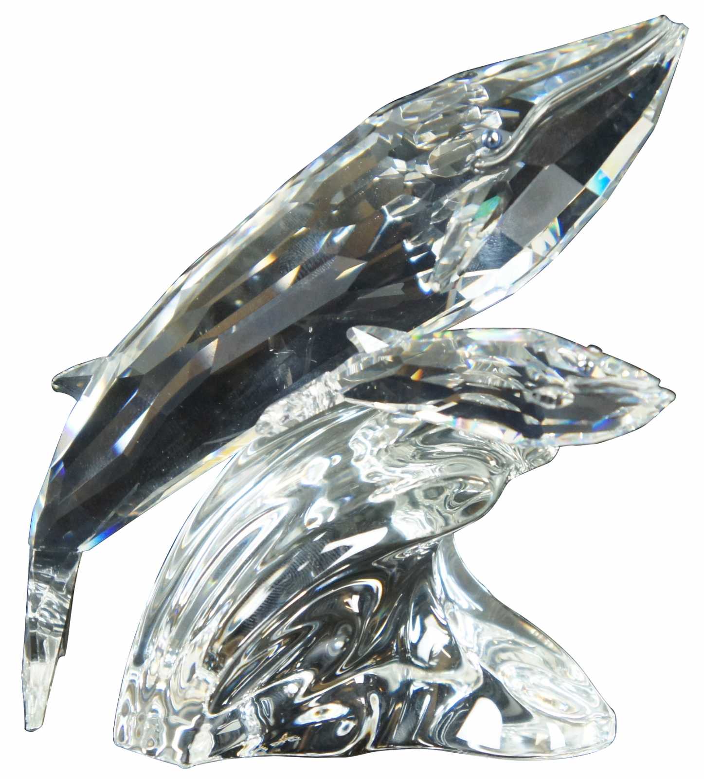 Swarovski crystal 1992 figurine “Care for Me,” featuring a mother and baby whale pair cresting a swirl of waves. This figurine (titled ""Care For Me"") reflects the Mother and Child relationship with its depiction of a mother and baby whale gracefully breaching a wave. This Annual Edition, expertly crafted of Clear Crystal, was only available in 1992 to Swarovski Crystal Society (SCS) members. D01X921. Designer: Michael Stamey